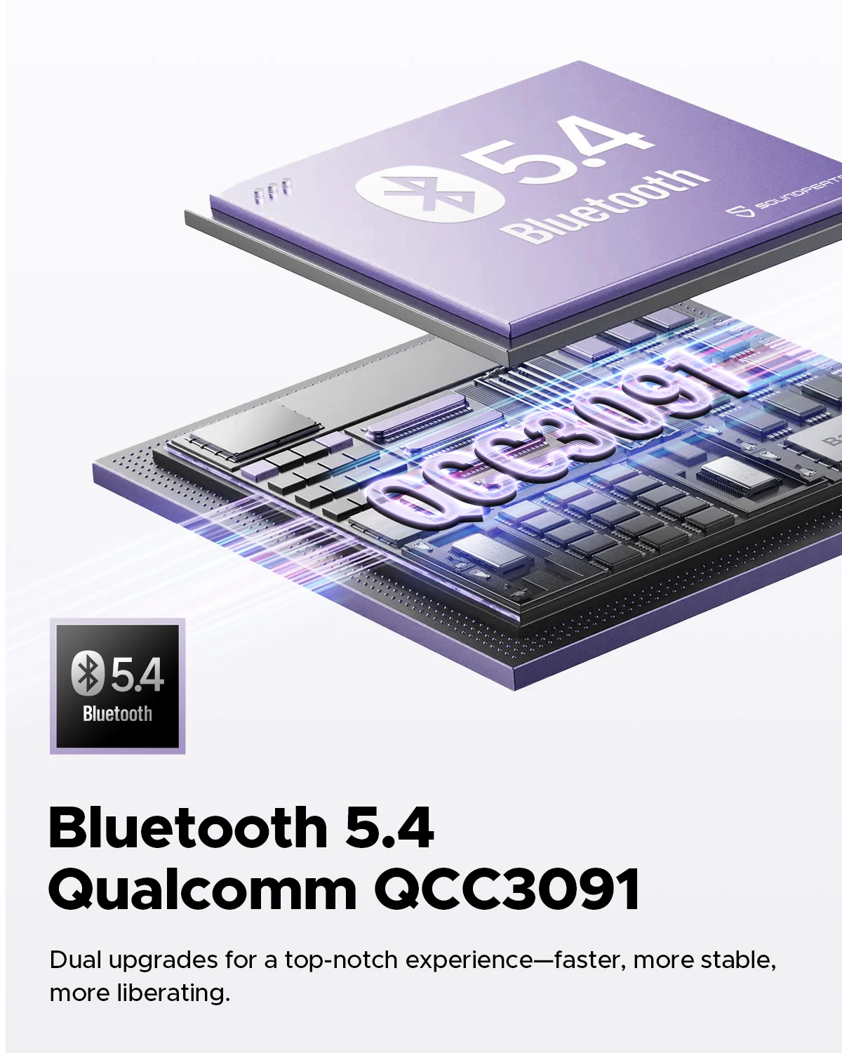 3. Bluetooth 5.4, QCC3091 Chip Equipped with the advanced QCC3091 Bluetooth 5.4 chip, the dual upgrade provides a top-notch audio and connectivity experience. Complex environments or long-distance connections remain stable and smooth, while power consumption is further reduced, extending the life of the earphones.