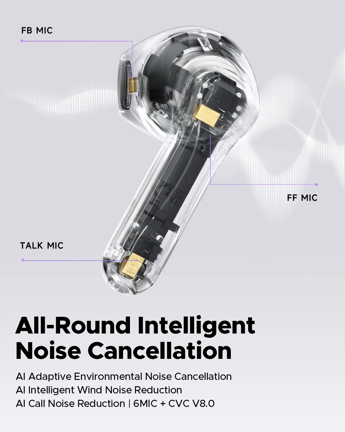 Feature 1: Hi-Res Audio Wireless Earbuds With ANC CVC V8.0 and 6MIC AI call noise reduction