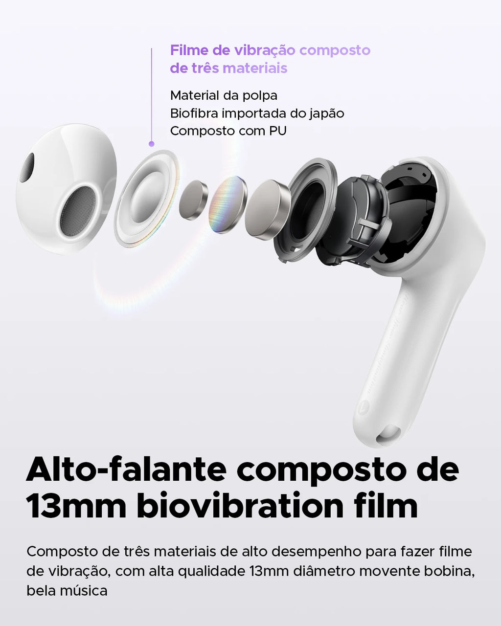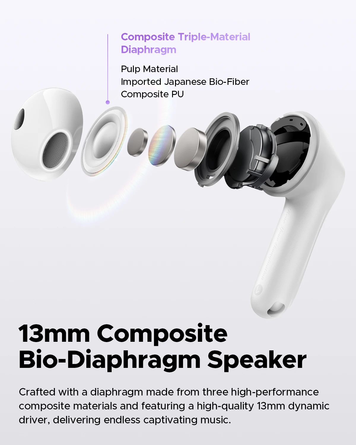 4. 13mm Composite Bio-Diaphragm Speaker The diaphragm is made of a composite of three high-performance materials, combining their advantages to synergistically produce rich bass, warm vocals, and pure treble. With the high-quality 13mm diameter dynamic coil, the sound performance is rich and complete, whether it's the delicate strings of classical music or the fierce rhythm of rock music, it can be perfectly presented.