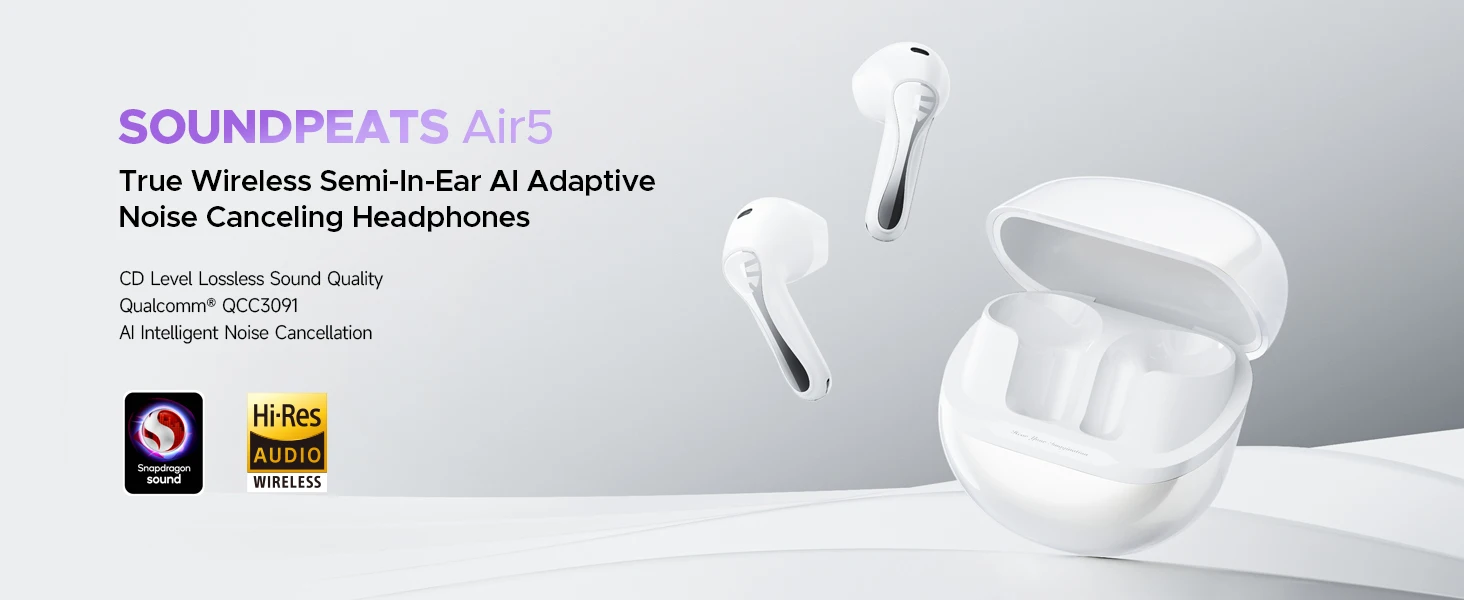 2. Hi-Res and Snapdragon Sound Hi-Res certified, the SOUNDPEATS Air5 supports sampling frequencies up to 96 kHz or 192 kHz and 24-bit depth, delivering a wider dynamic range and delicate frequency response. Qualcomm's Snapdragon Sound technology uses higher bit rates (up to 576 kbps) and ultra-low latency (as low as 32 ms) to ensure pure and stable sound quality in wireless transmission.