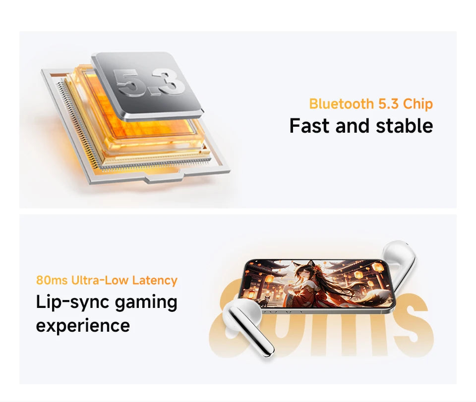 Our HiFi 5 DSP tech delivers top-notch audio processing. The wireless earphones will automatically adapt to your ear canal and wearing status, With dynamically adjust low-frequency, allowing you to enjoy rich sound details.