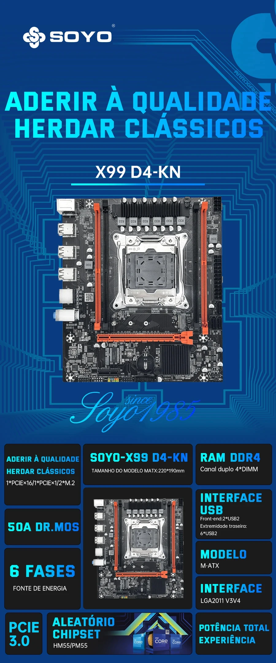 Placa-mãe SOYO X99 de alto desempenho, desenvolvida para entusiastas de jogos e aplicações profissionais. Compatível com processadores Xeon LGA2011-3, oferecendo estabilidade e poder de processamento excepcional. Acompanha kit completo com processador Xeon 2680 V4 e 16 GB de memória RAM DDR4 2133 MHz (2x8 GB), garantindo multitarefa fluida e desempenho robusto. Ideal para gaming intenso, edição de vídeo e workstations. Arquitetura X99 proporciona expansibilidade e suporte a tecnologias avançadas para máximas possibilidades de upgrade.