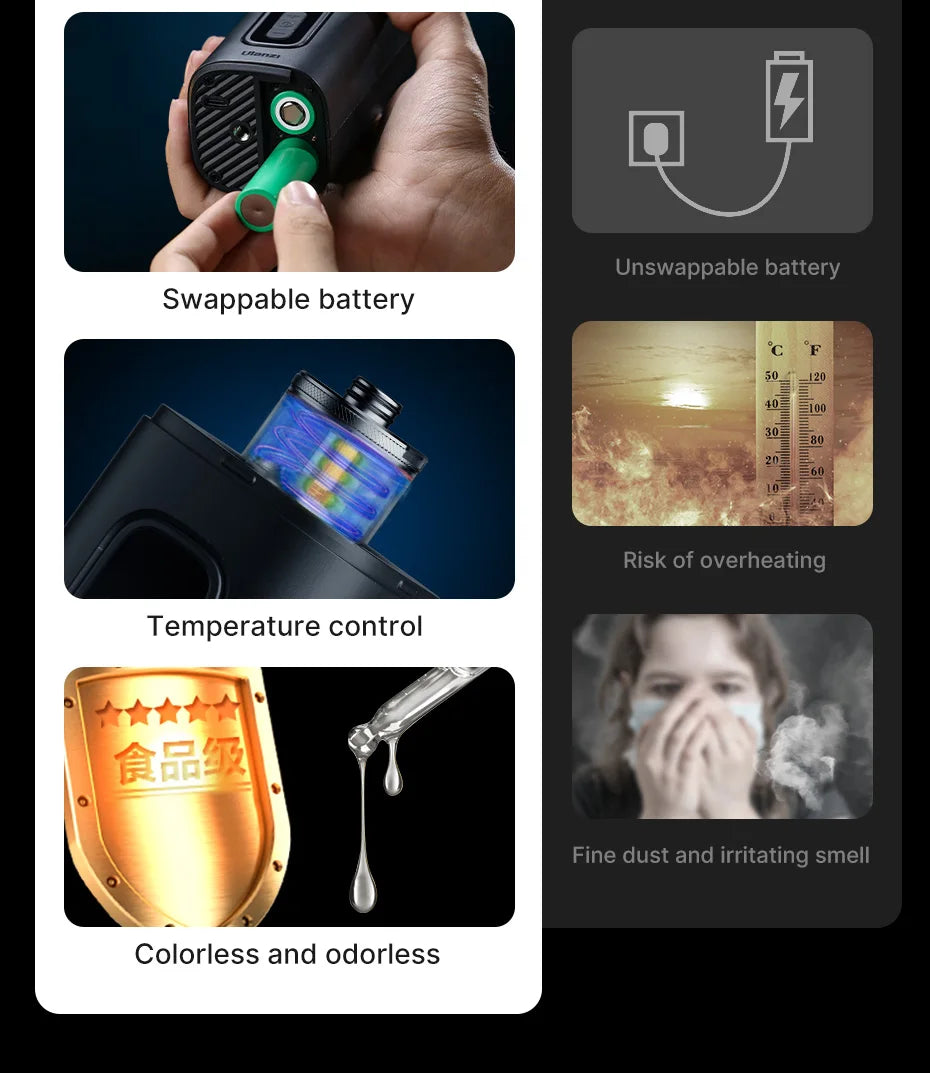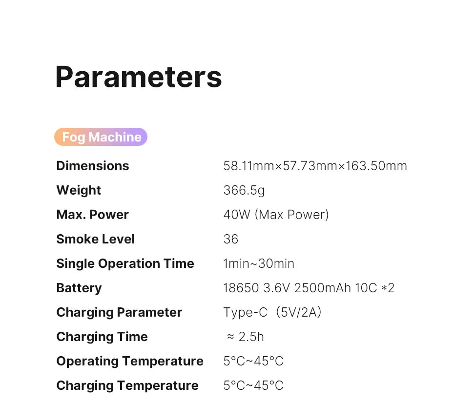 7.Worry-free Safety: Temperature control prevents overheating; Vegetable glycerin ensures a foggy spray with no fine dust and is odor-free.