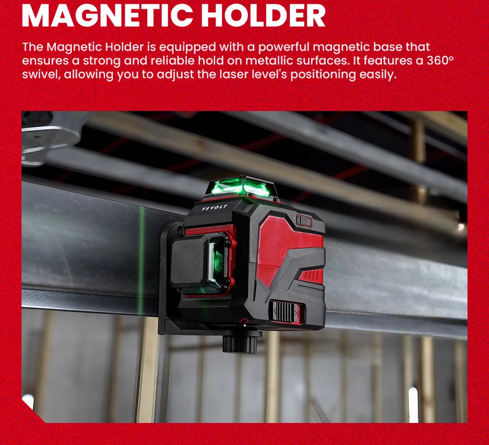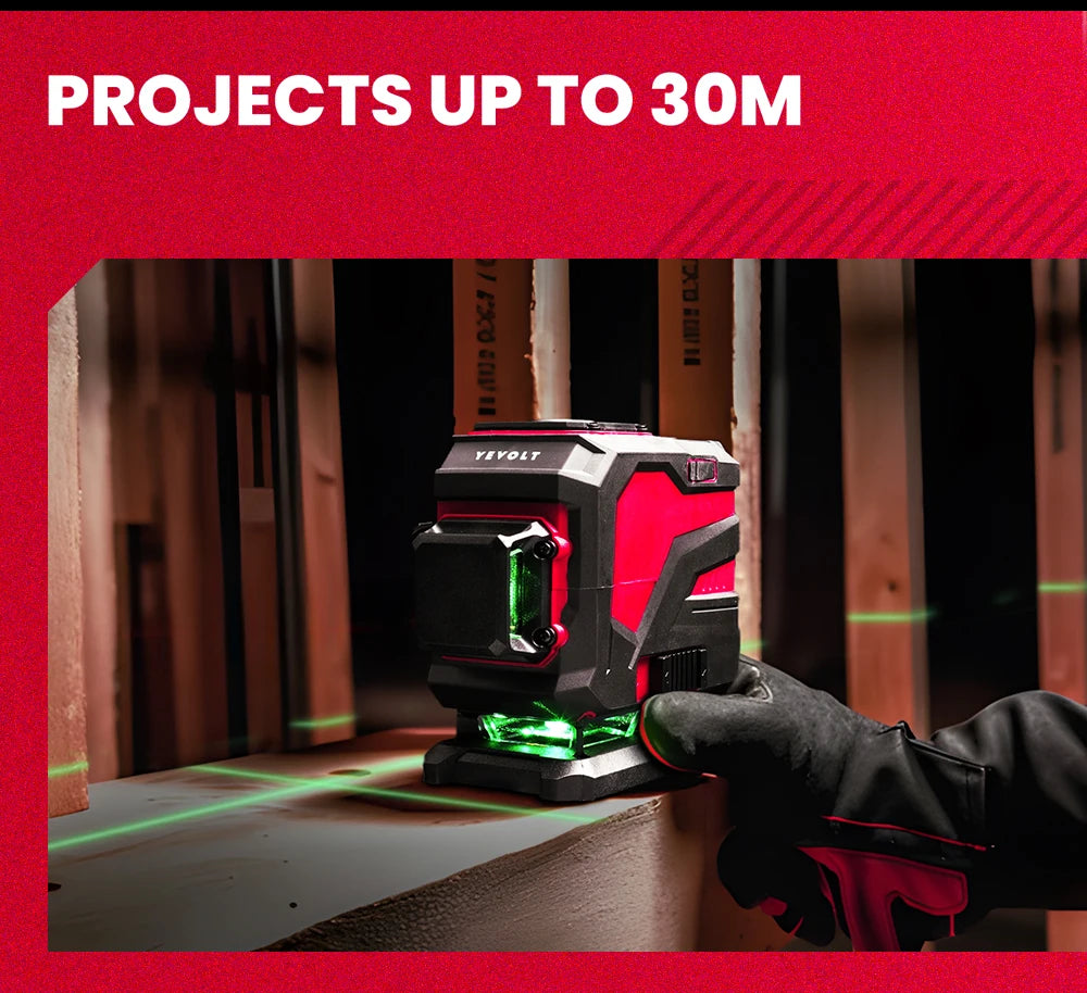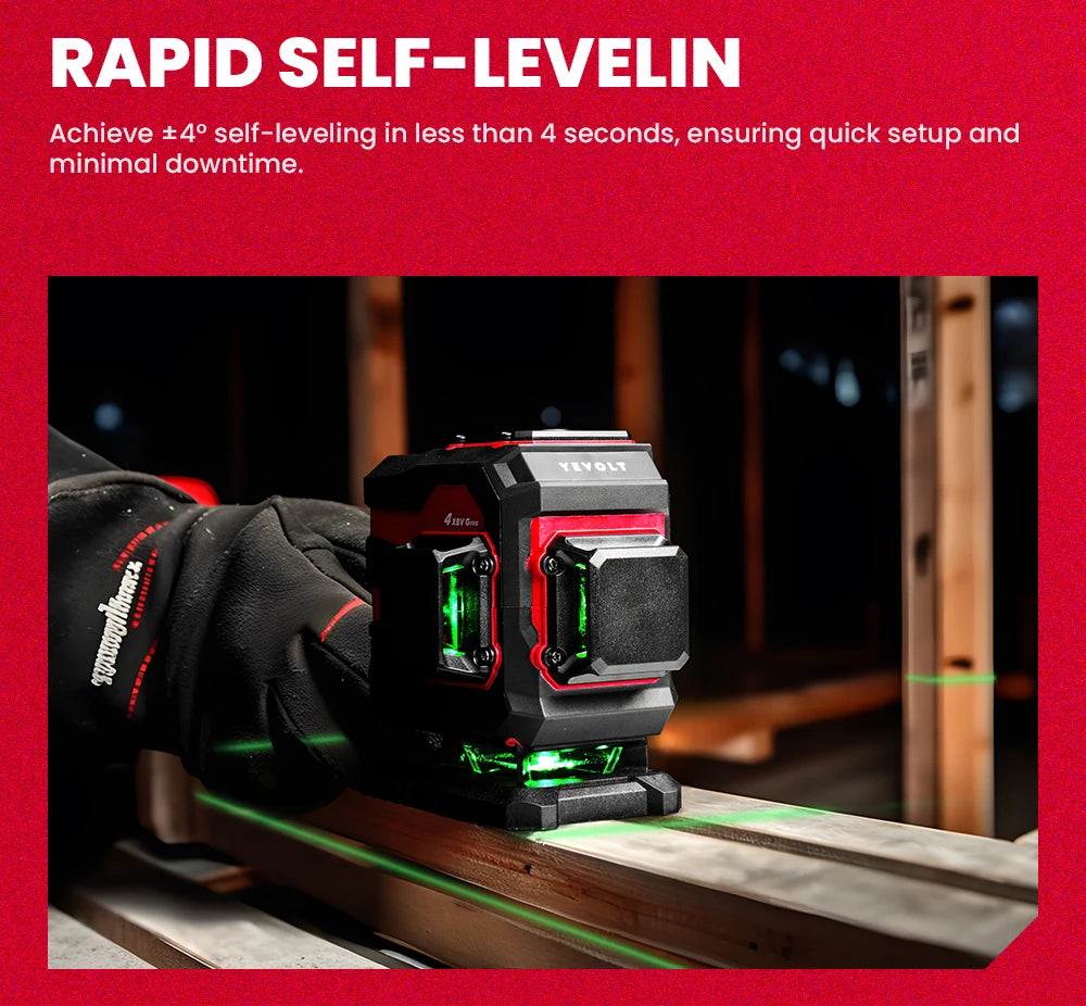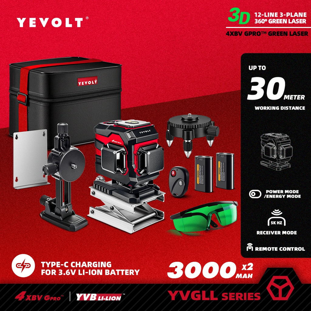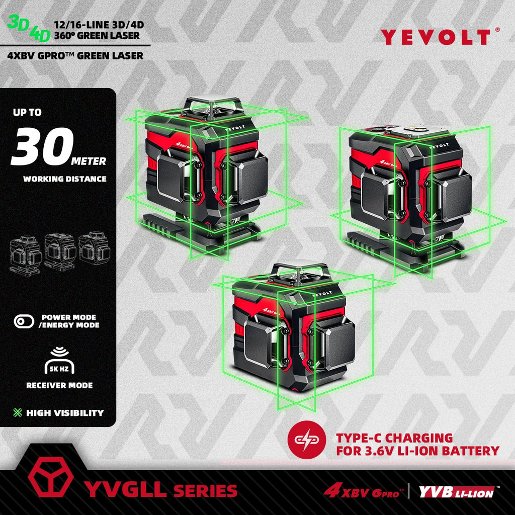 Nível a laser verde série YEVOLT YVGLL4XS, 3/4 planos, 12/16 linhas, autonivelante, 360 graus, 3D/4D, horizontal e vertical, 3,6 V, 3 Ah, ferramentas elétricas