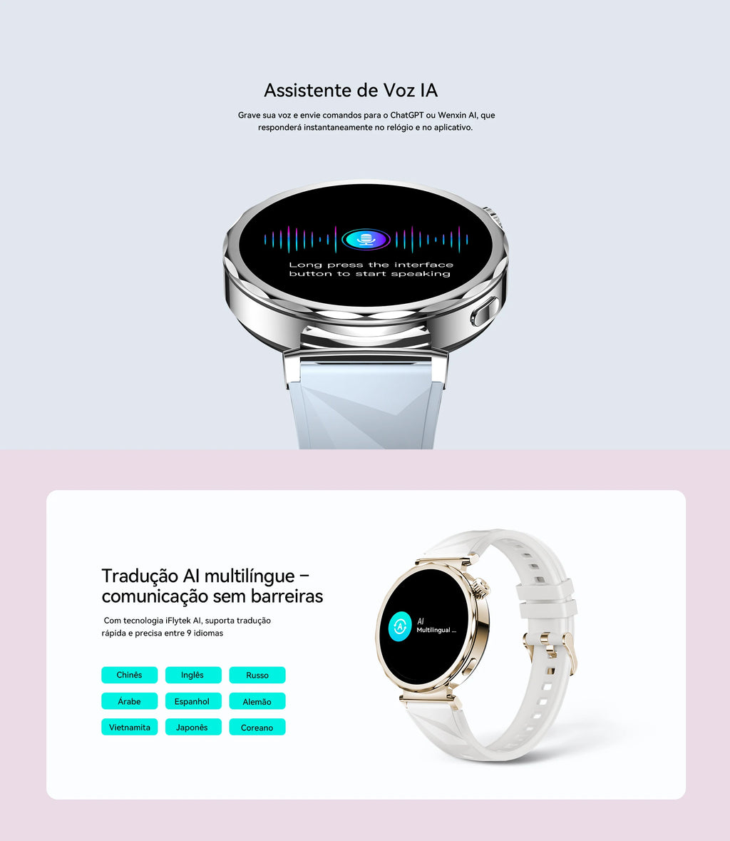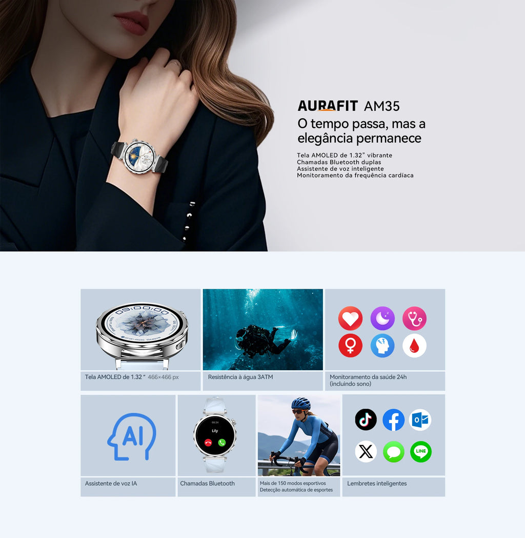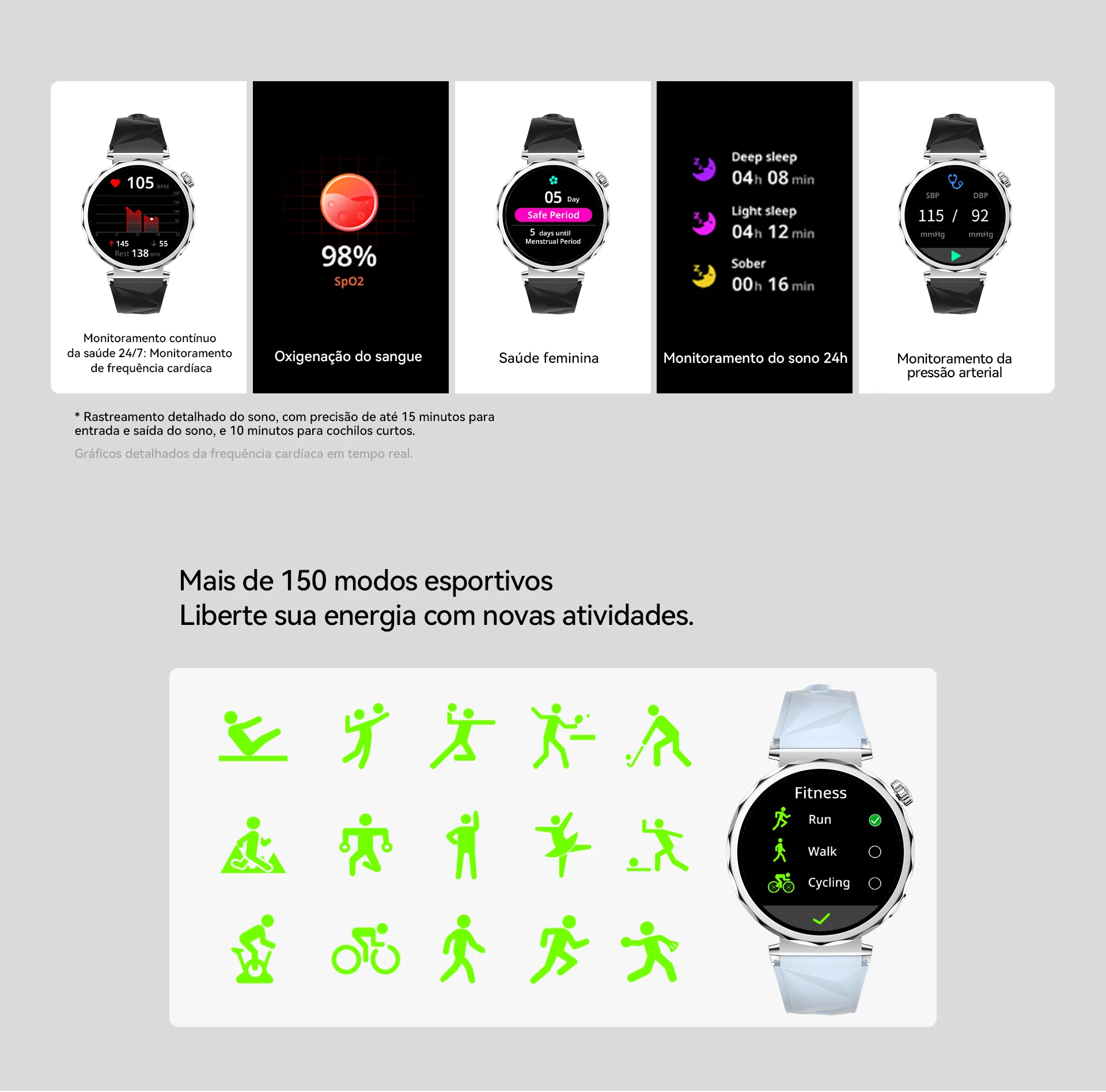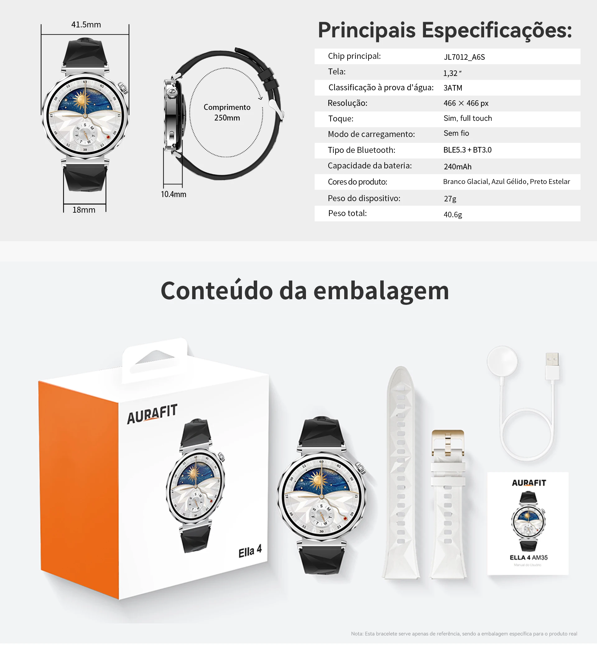 O AURAFIT ELLA 4 é um smartwatch feminino sofisticado, desenvolvido para acompanhar seu estilo de vida ativo com precisão e elegância. Com tela de 1,32 polegadas em vidro e caixa em liga metálica, oferece durabilidade excepcional e design refinado em acabamento ouro rosa que complementa qualquer look. Equipado com tecnologia Bluetooth 5.3, permite receber chamadas diretamente no pulso com conexão estável e confiável. O aplicativo AURAFIR integrado oferece monitoramento abrangente de atividades, incluindo contador de passos, calorias queimadas e múltiplos modos esportivos para diferentes tipos de exercício. A pulseira de silicone removível (258mm x 22mm) proporciona conforto máximo durante o dia todo, permitindo fácil substituição por outras opções. A bateria de 220-300mAh garante autonomia consistente para acompanhar suas atividades sem interrupções frequentes. Personalize completamente seus mostradores para refletir seu estilo pessoal e preferências. Compatível com todos os dispositivos, o ELLA 4 é o companheiro tecnológico perfeito para mulheres que buscam funcionalidade avançada, design sofisticado e monitoramento de saúde integrado ao seu cotidiano.