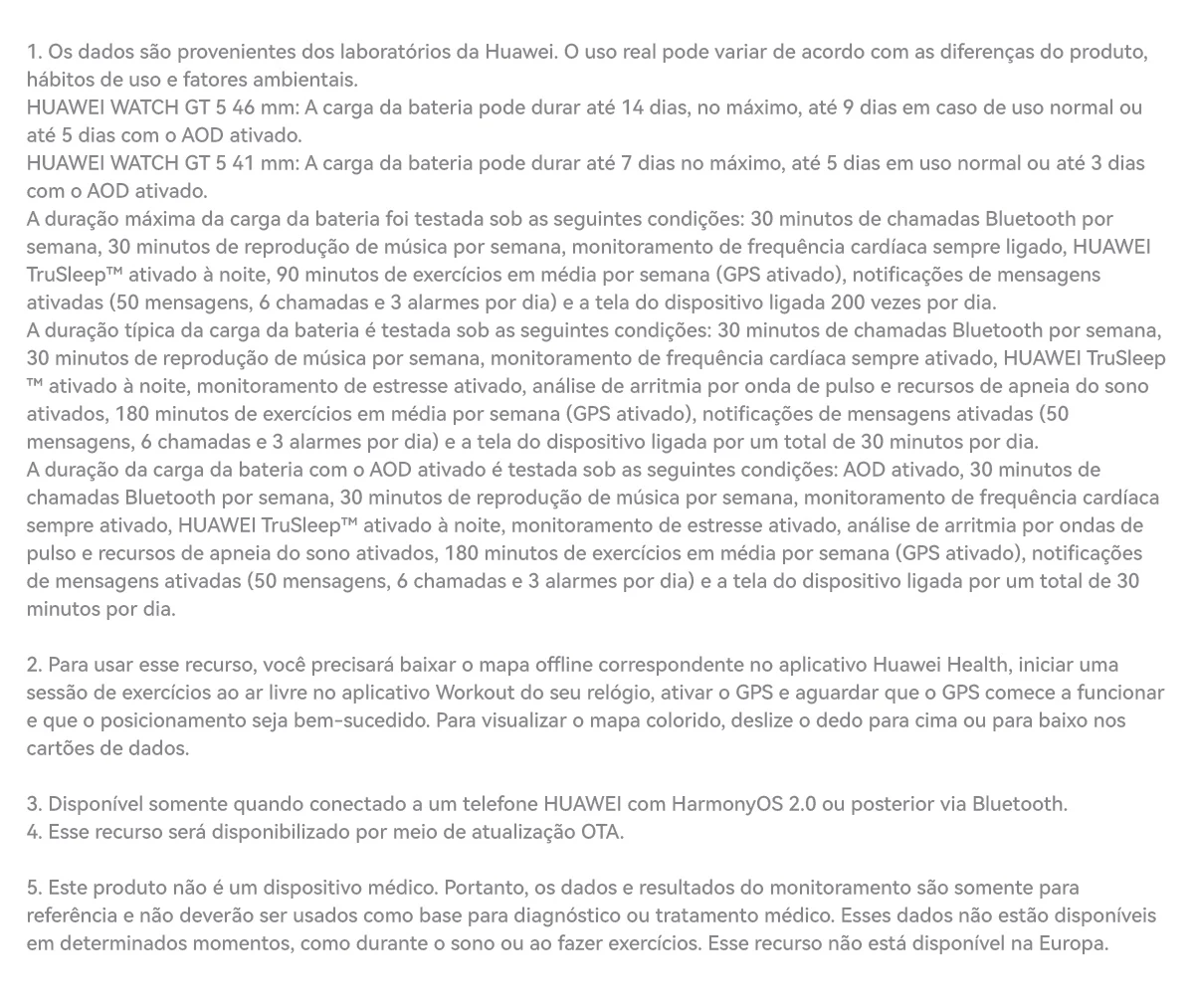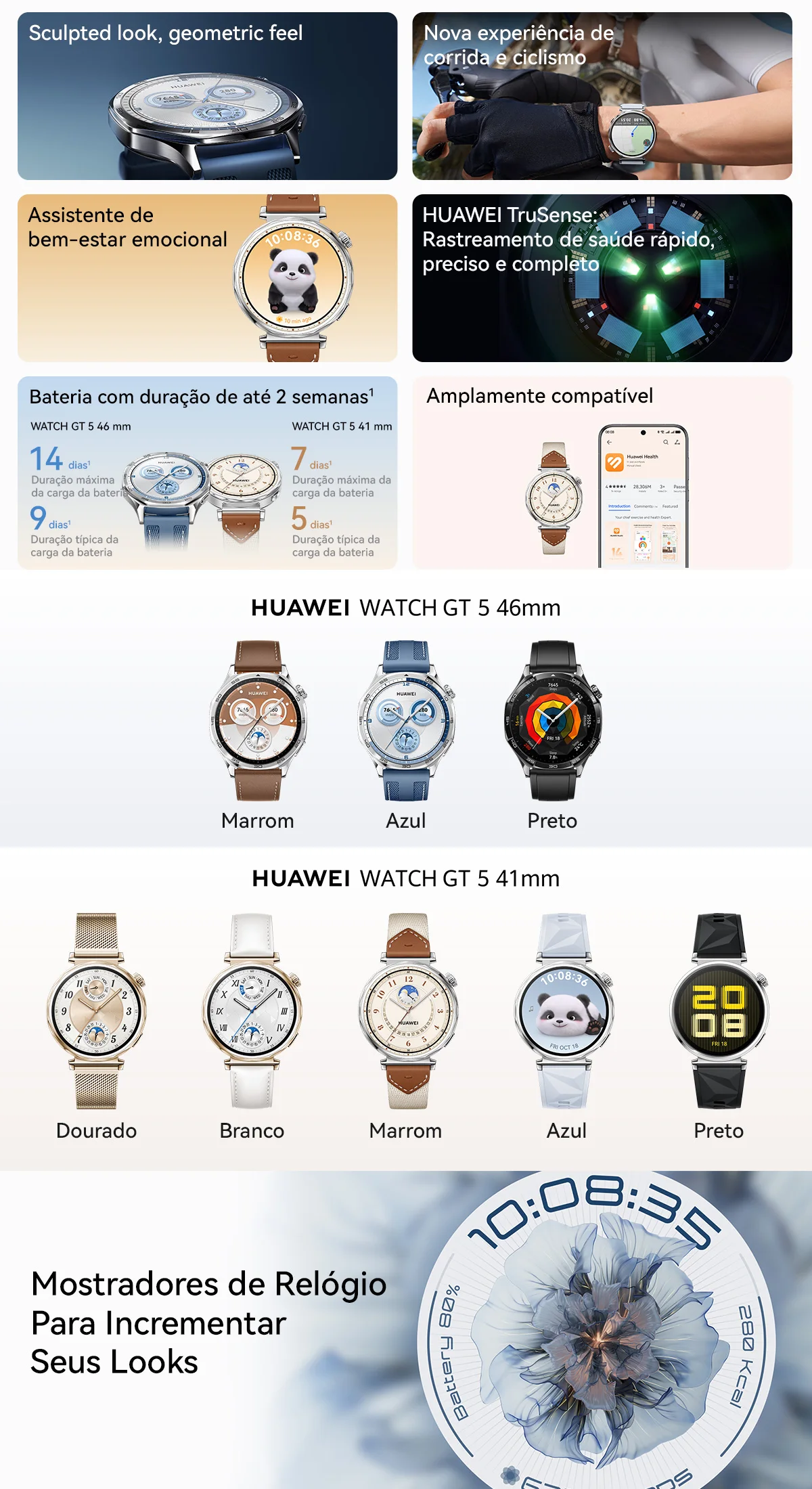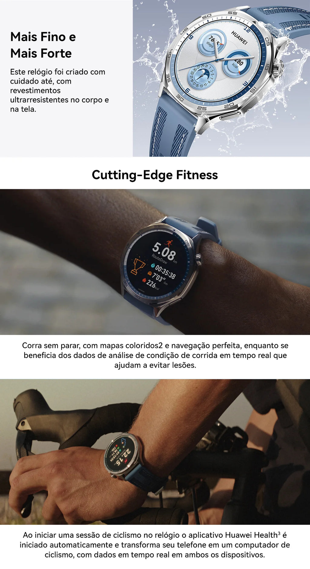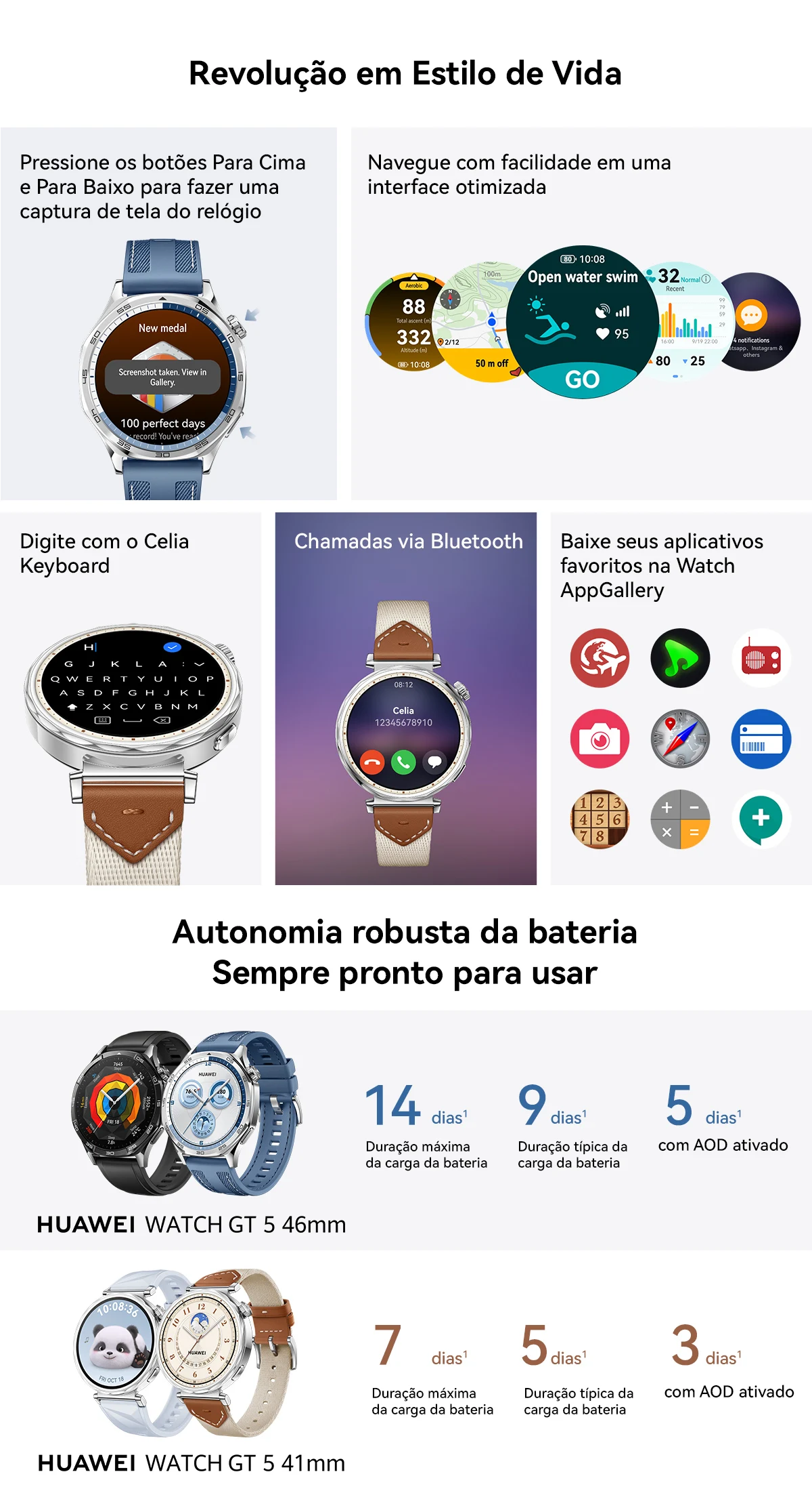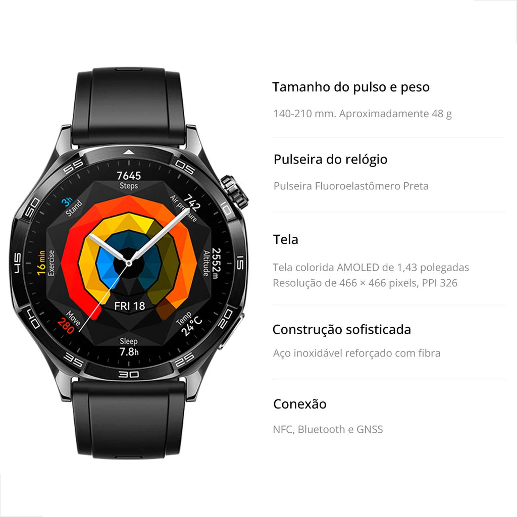 O HUAWEI WATCH GT 5 46mm é um smartwatch robusto e versátil, desenvolvido para atletas e entusiastas de atividades ao ar livre que exigem precisão e confiabilidade. Equipado com GPS integrado de alta precisão, oferece rastreamento detalhado para corridas, ciclismo e diversas modalidades esportivas, capturando cada movimento com exatidão. Seu sistema de monitoramento de saúde é abrangente: frequência cardíaca em tempo real, níveis de oxigênio no sangue, pressão arterial, temperatura corporal e análise de estresse fornecem uma visão completa do seu bem-estar. O monitor de sono avançado identifica padrões de descanso, enquanto o monitor de humor oferece insights sobre seu estado emocional geral. Com autonomia impressionante de até 14 dias, você não precisa se preocupar com recargas frequentes. A resistência a choques garante durabilidade em qualquer ambiente, e a conectividade Bluetooth 5 assegura sincronização rápida e estável com seu smartphone. Além do rastreamento de atividades, o relógio funciona como central de comunicação: receba notificações de mensagens e chamadas, atenda e faça chamadas diretamente do pulso. O pedômetro, contador de distância e monitor de calorias completam o pacote de métricas essenciais para otimizar seus treinos. Um companheiro tecnológico indispensável para quem leva o desempenho e a saúde a sério.