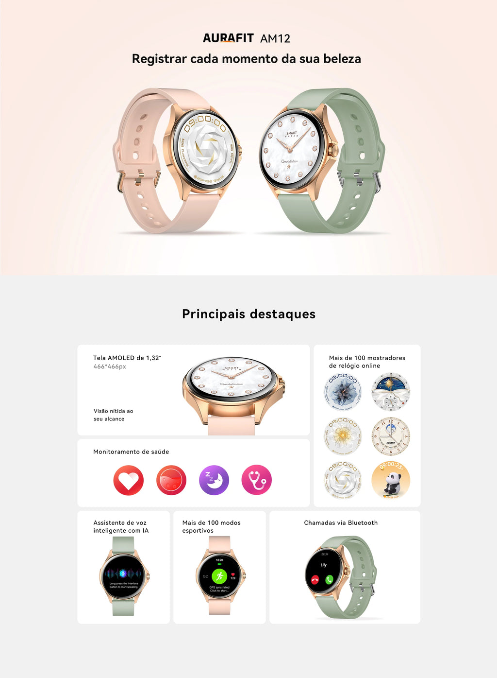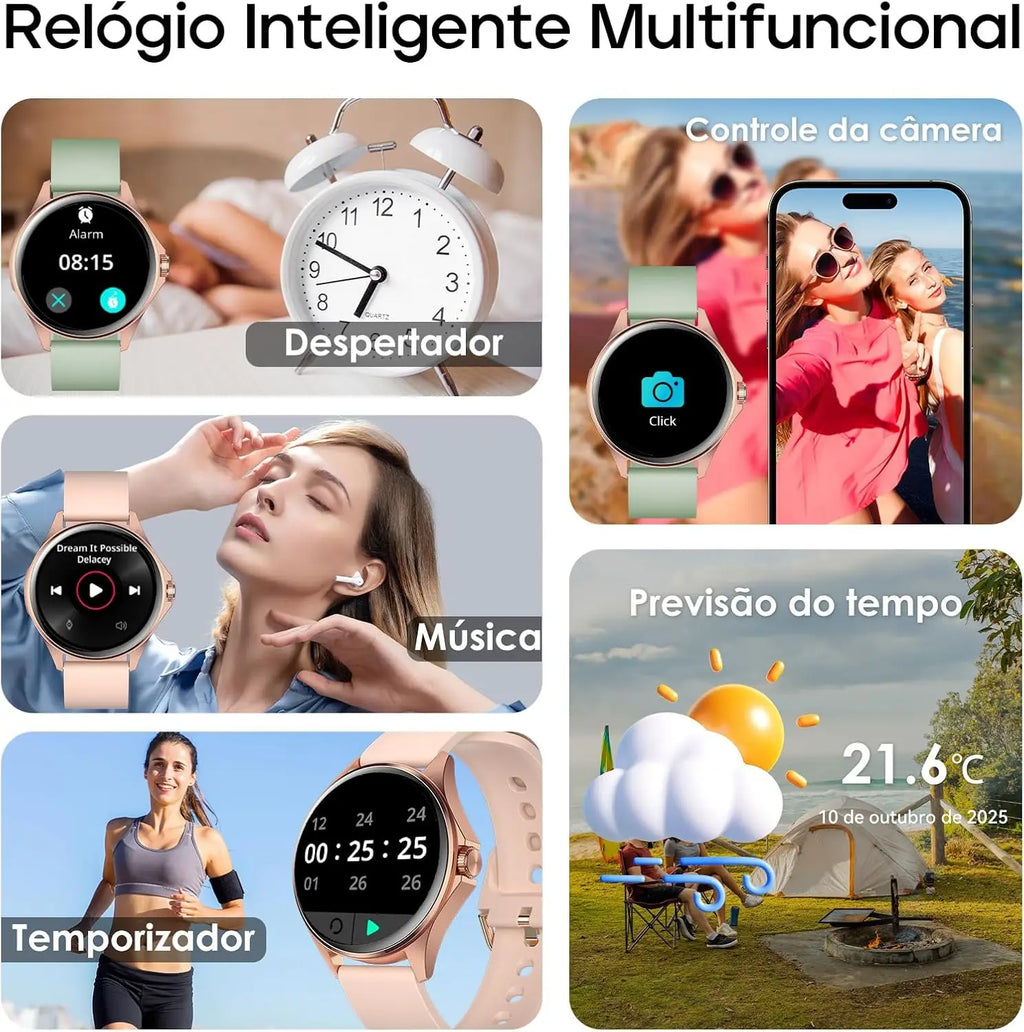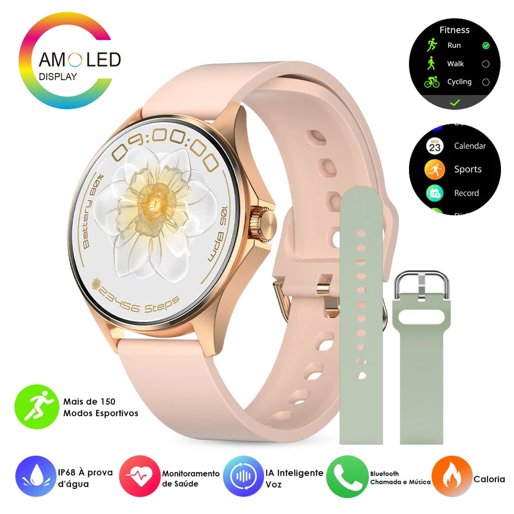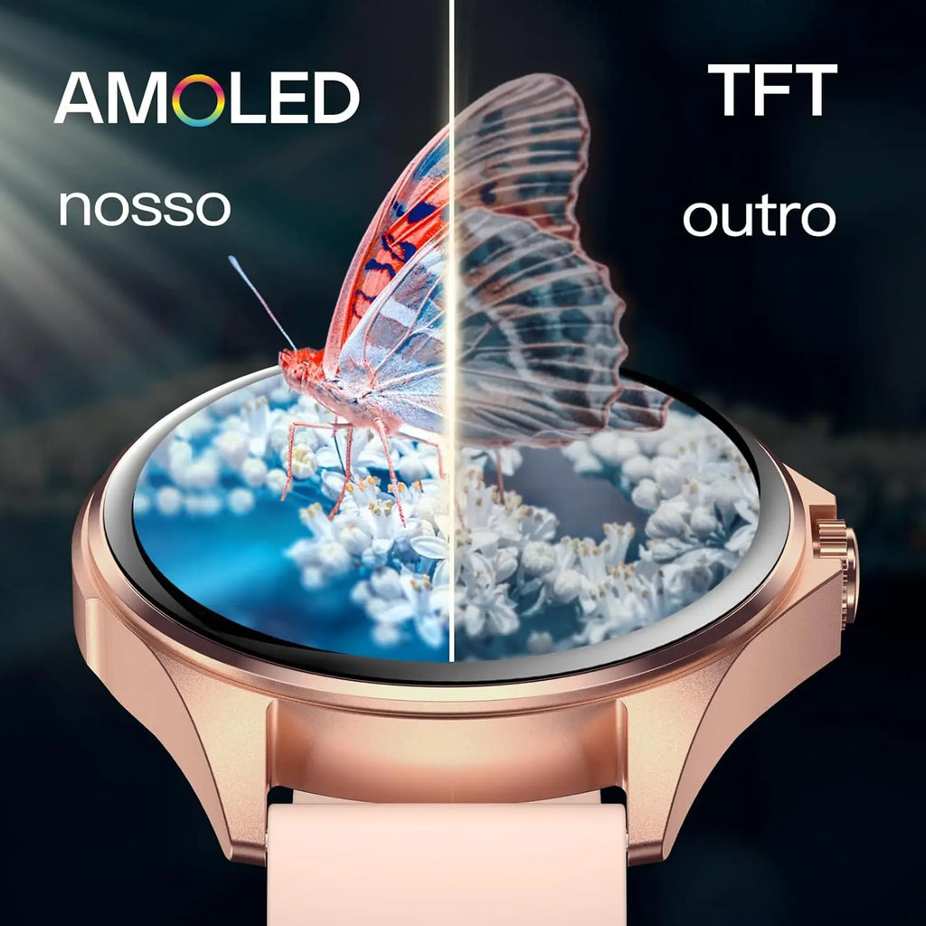 O Relógio Feminino AURAFIT ELLA 1 é um smartwatch sofisticado desenvolvido especificamente para mulheres que desejam monitoramento completo de saúde e desempenho. Sua tela AMOLED de 1,32" oferece cores vibrantes e clareza excepcional em qualquer condição de luz. Com mais de 150 modos esportivos, acompanha desde atividades convencionais até exercícios especializados, registrando passos, distância, calorias e intensidade do treino com precisão avançada. O monitoramento de saúde feminina é destaque: acompanha seu ciclo menstrual com previsões inteligentes, monitora frequência cardíaca em tempo real e analisa padrões de sono para otimizar recuperação. A tecnologia Bluetooth 5.3 garante conexão estável com Android e iOS, sincronizando notificações de mensagens e chamadas, permitindo atender ou fazer ligações diretamente do pulso. Funções práticas incluem despertador, hora mundial, calendário permanente e calculadora integrada. A bateria de 7-10 dias oferece autonomia superior, reduzindo necessidade de carregamentos frequentes. Construído com durabilidade em mente, é o companheiro ideal para mulheres ativas que buscam um dispositivo confiável, elegante e repleto de recursos para gerenciar saúde, fitness e comunicação no dia a dia.