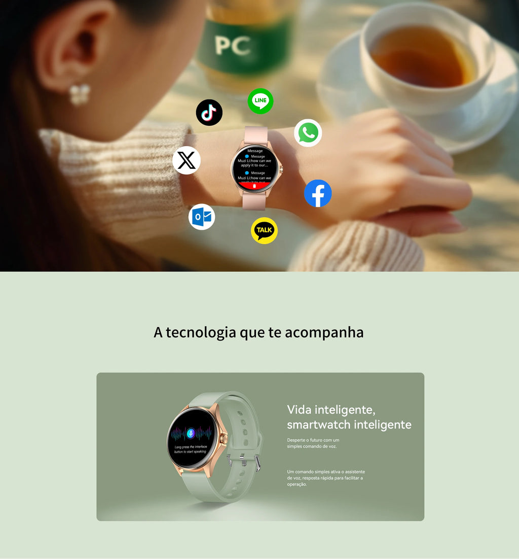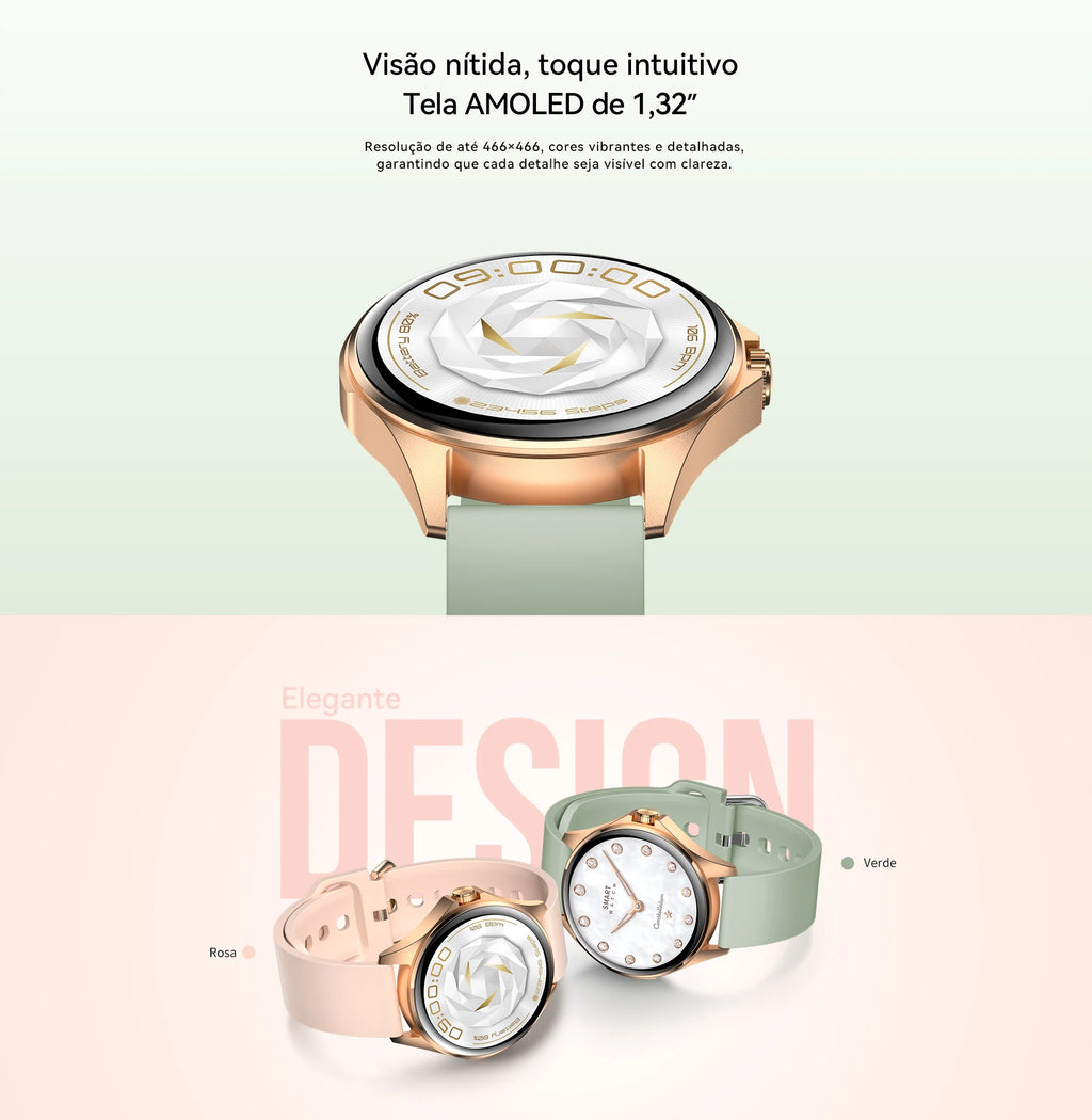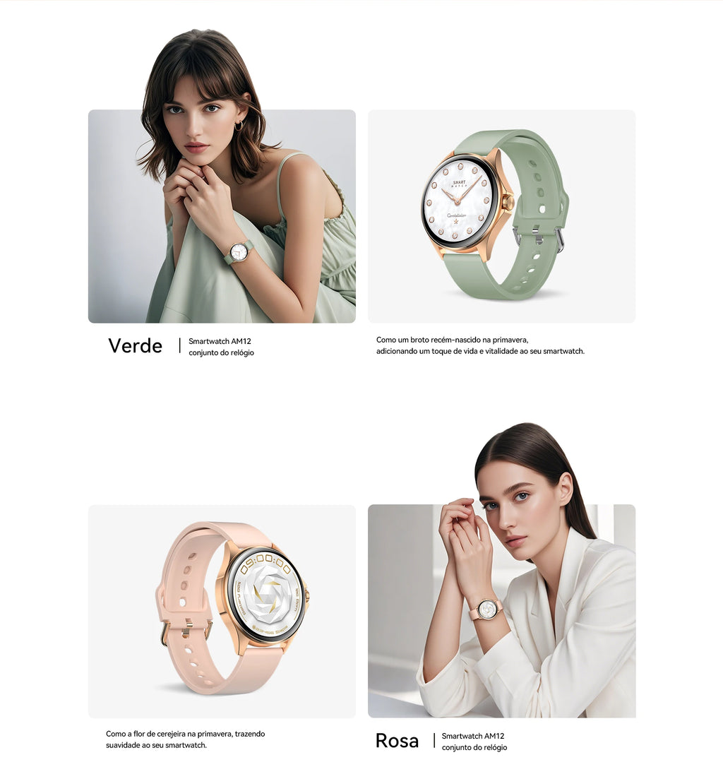 O Relógio Feminino AURAFIT ELLA 1 é um smartwatch sofisticado desenvolvido especificamente para mulheres que desejam monitoramento completo de saúde e desempenho. Sua tela AMOLED de 1,32" oferece cores vibrantes e clareza excepcional em qualquer condição de luz. Com mais de 150 modos esportivos, acompanha desde atividades convencionais até exercícios especializados, registrando passos, distância, calorias e intensidade do treino com precisão avançada. O monitoramento de saúde feminina é destaque: acompanha seu ciclo menstrual com previsões inteligentes, monitora frequência cardíaca em tempo real e analisa padrões de sono para otimizar recuperação. A tecnologia Bluetooth 5.3 garante conexão estável com Android e iOS, sincronizando notificações de mensagens e chamadas, permitindo atender ou fazer ligações diretamente do pulso. Funções práticas incluem despertador, hora mundial, calendário permanente e calculadora integrada. A bateria de 7-10 dias oferece autonomia superior, reduzindo necessidade de carregamentos frequentes. Construído com durabilidade em mente, é o companheiro ideal para mulheres ativas que buscam um dispositivo confiável, elegante e repleto de recursos para gerenciar saúde, fitness e comunicação no dia a dia.