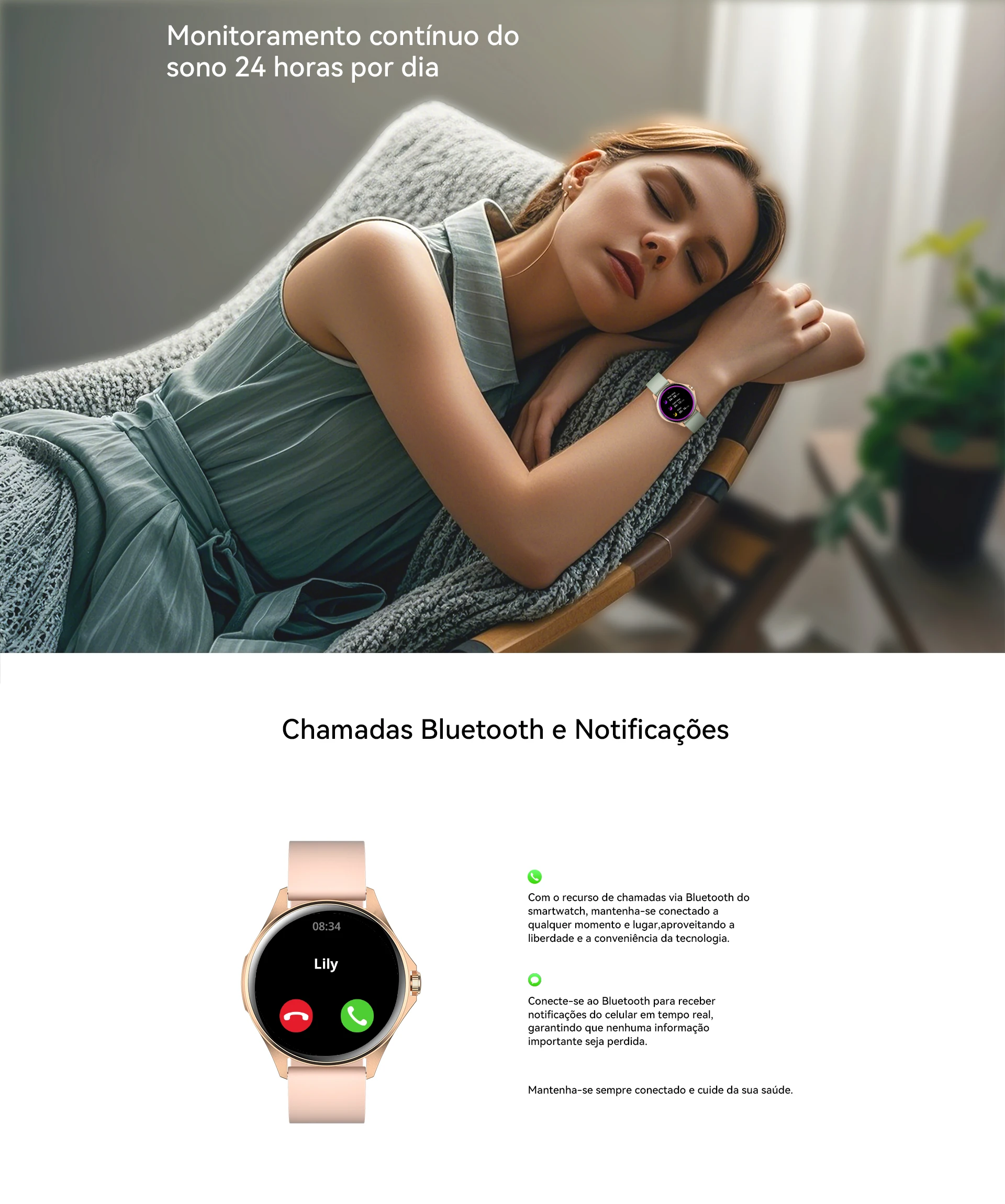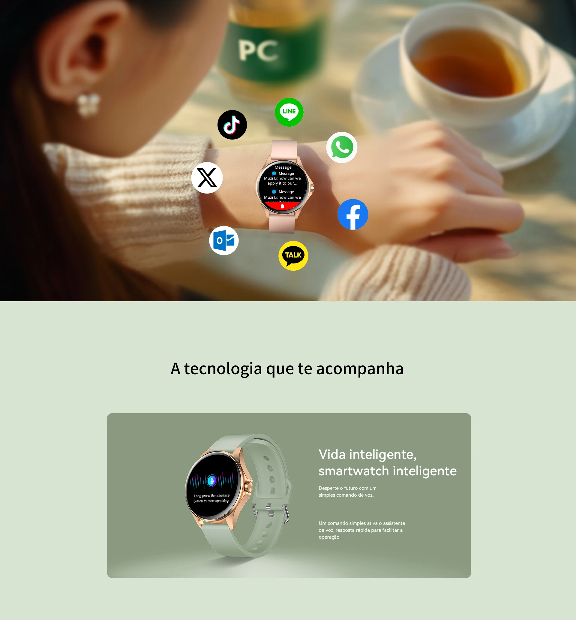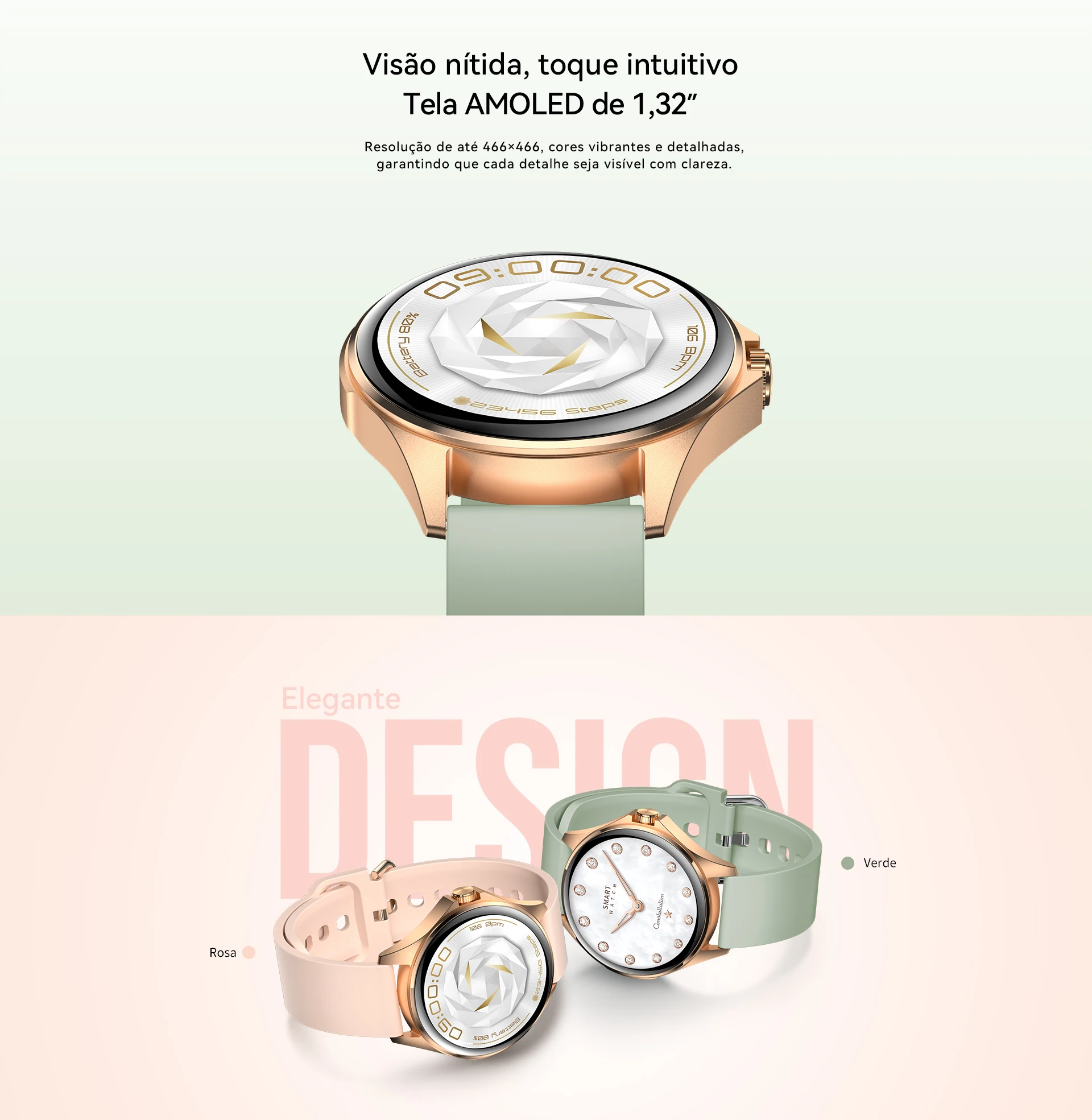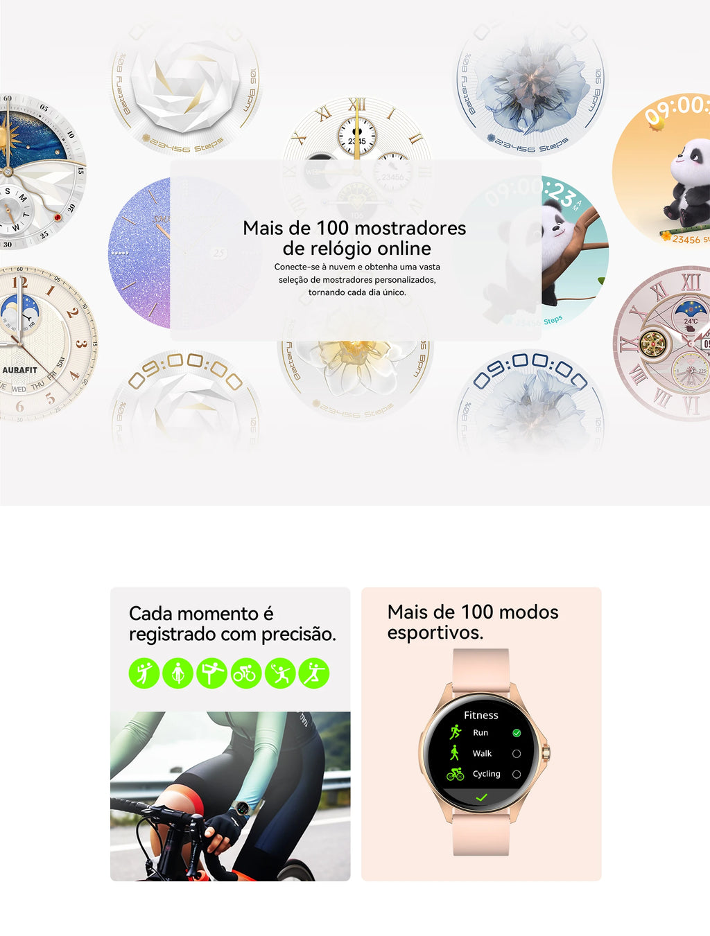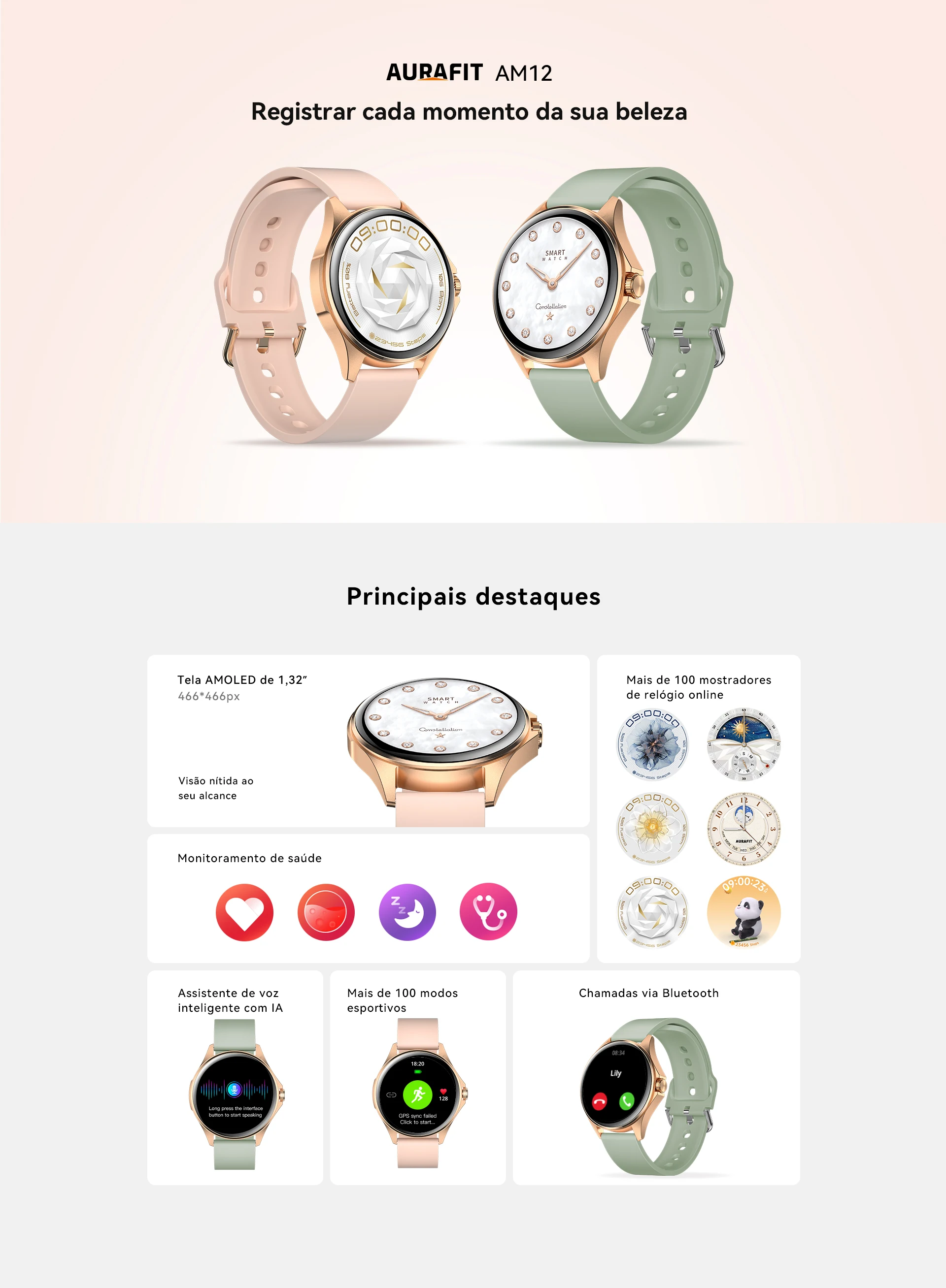 Relógio inteligente feminino AURAFIT, a escolha perfeita para mulheres que desejam integrar tecnologia ao seu estilo de vida ativo. Equipado com tela sensível ao toque completa, oferece interface intuitiva e responsiva para acesso rápido a todas as funcionalidades. O dispositivo monitora com precisão passos, calorias queimadas e múltiplas modalidades de exercício, sincronizando dados em tempo real através do aplicativo AURAFIT dedicado. Conectividade Bluetooth 5.3 permite receber e gerenciar chamadas diretamente do pulso, mantendo você conectada sem necessidade de consultar o smartphone constantemente. A pulseira em silicone removível (258mm x 22mm) combina conforto máximo com versatilidade estética, permitindo personalizações conforme sua preferência. A caixa em liga metálica com visor em vidro temperado garante durabilidade e elegância, enquanto o acabamento em ouro rosa complementa qualquer look. Com bateria de 220-300mAh, o relógio oferece autonomia adequada para acompanhá-lo durante suas atividades diárias. Totalmente compatível com todos os dispositivos móveis, funciona perfeitamente independentemente do seu smartphone. Um presente sofisticado e funcional para mulheres que valorizam saúde, tecnologia e estilo.