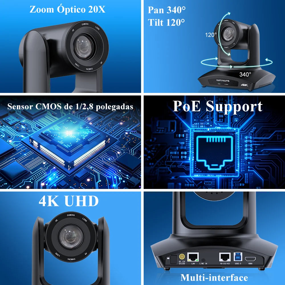 Câmera PTZ 4K profissional KATOVJJTS modelo H40GH2, a solução completa para conferências, transmissões ao vivo e ambientes religiosos de alta exigência. Equipada com zoom óptico de 20x e movimento pan-tilt fluido (até 90°/s), garante captura de detalhes em qualquer distância. A resolução 4K combinada com inteligência artificial para enquadramento automático assegura composições profissionais sem intervenção manual constante. Conectividade versátil atende qualquer infraestrutura: PoE para alimentação via cabo de rede, USB 3.0 para integração com computadores, HDMI para monitores diretos, além de LAN, RS232 e RS422 para sistemas de controle avançados. Suporta múltiplos codecs de vídeo (H.264, H.265, MJPG, YUY2), garantindo compatibilidade com plataformas de streaming, sistemas de videoconferência e gravadores profissionais. Certificações internacionais CE, FCC e RoHS comprovam conformidade com padrões de qualidade e segurança. Inclui adaptador na embalagem. Tela de 2" a 3" facilita visualização em tempo real. Perfeita para igrejas, auditórios, estúdios de produção e eventos corporativos que demandam controle remoto avançado e desempenho confiável.