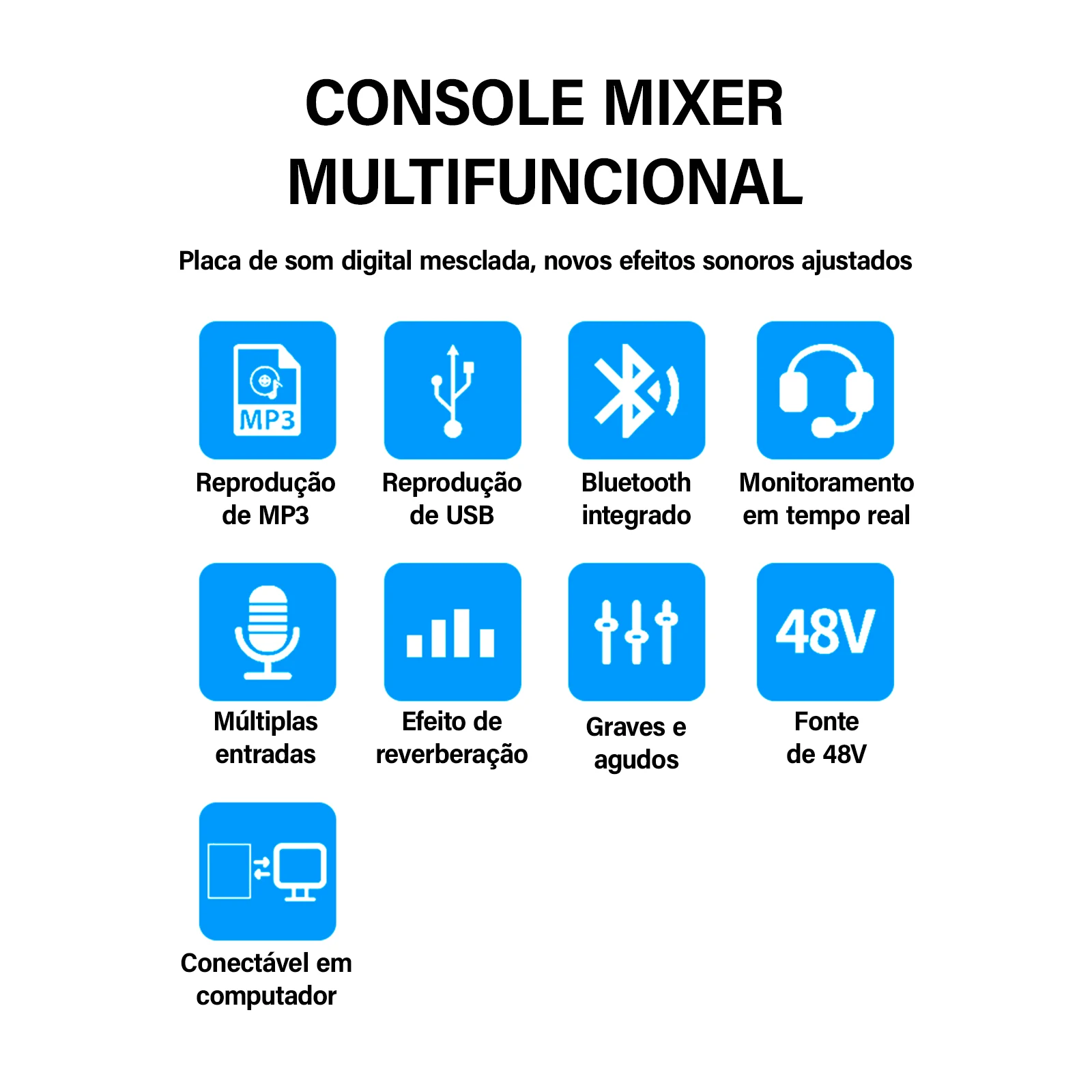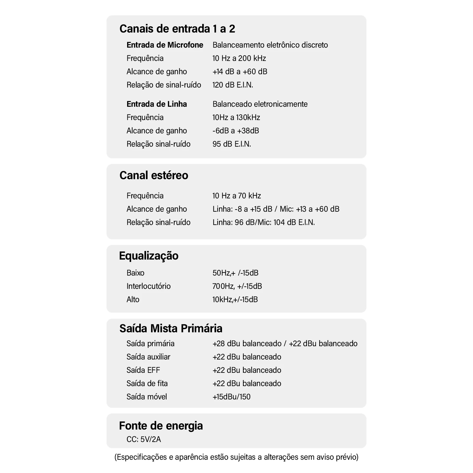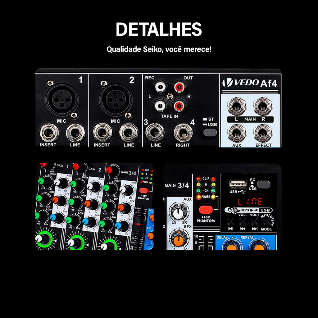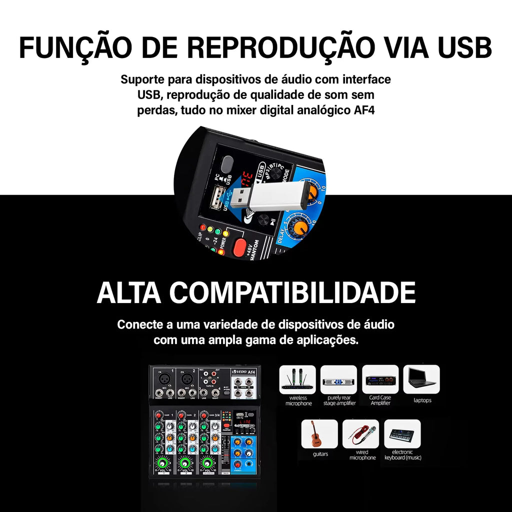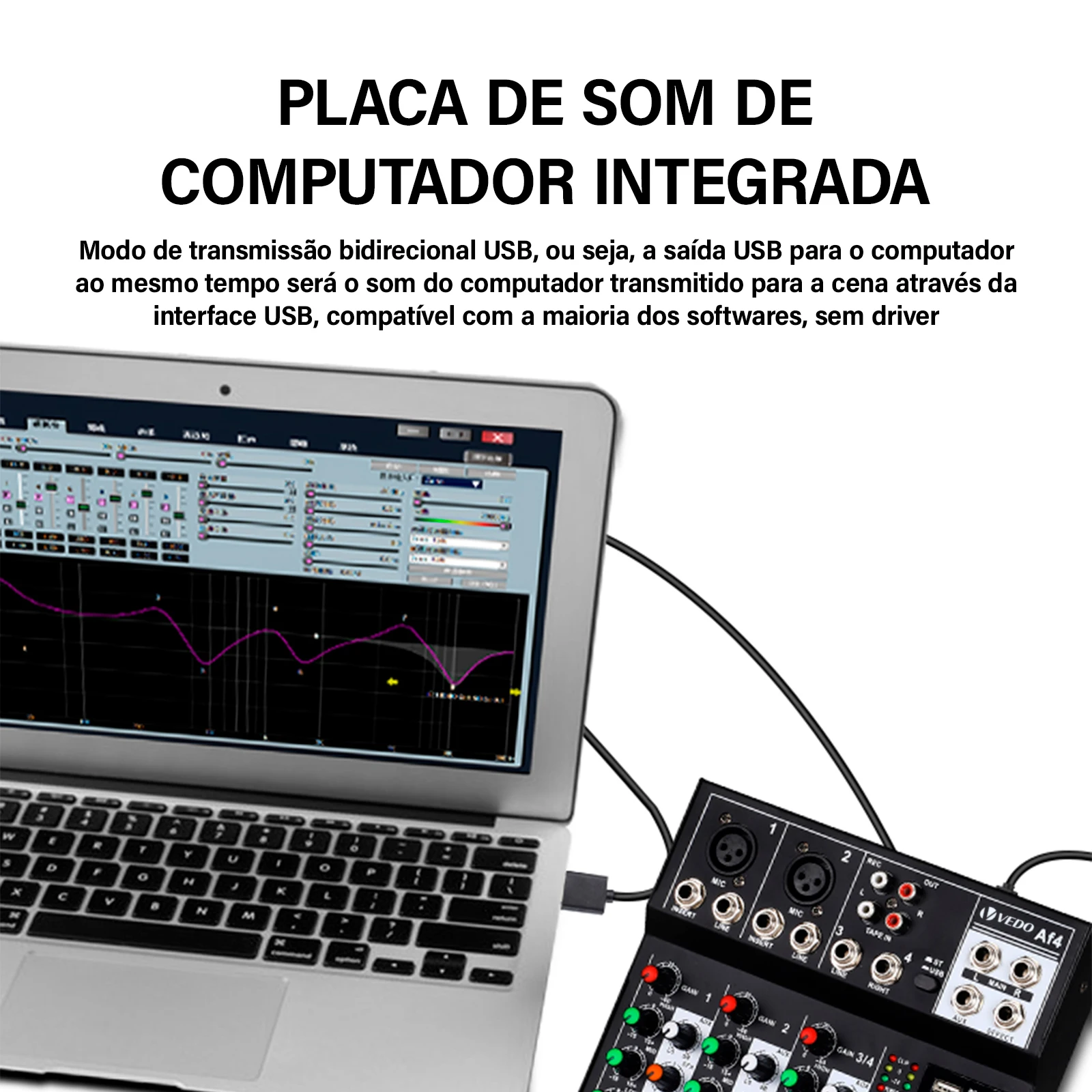 A Mesa de Mixagem Analógica VEDO AF4 é um console profissional de 4 canais desenvolvido pela TEYUN, especialmente projetado para aplicações de áudio ao vivo de alta qualidade. Combina a warmth e o controle da tecnologia analógica tradicional com uma placa de som digital integrada, proporcionando flexibilidade superior na captura, processamento e saída de sinais de áudio. Com 4 canais independentes, permite gerenciar múltiplas fontes simultâneas com precisão e clareza. As configurações de função personalizáveis oferecem adaptabilidade a diferentes cenários de apresentação, desde pequenos eventos e apresentações intimistas até produções mais complexas e exigentes. Cada canal pode ser otimizado conforme suas necessidades específicas, garantindo máximo controle sobre o mix final. A integração entre componentes analógicos e digitais assegura transições suaves e qualidade de áudio consistente. Certificada internacionalmente (CE, FCC, RoHS), a VEDO AF4 atende aos mais rigorosos padrões de qualidade, segurança e conformidade regulatória. Sua construção robusta e componentes de alta confiabilidade garantem desempenho estável mesmo em ambientes desafiadores. Ideal para técnicos de som profissionais, DJs, produtores musicais e engenheiros de áudio que exigem controle preciso, confiabilidade absoluta e versatilidade em suas apresentações ao vivo.