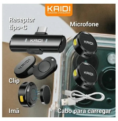 This Kaidi KMF4-A Wireless Dual Microphone System USB-C for Smartphones has high capacity wireless frequency, transmitters with magnetic clips and autonomy of up to 4 hours, as well as offers a high quality sound, being portable and very easy to use. Designed for simultaneous capture of 2 people, the set brings Plug and Play technology that does not require applications and drivers, just connect the phone and use. It's perfect for live streaming, meetings, recordings, digital content creation, and more.