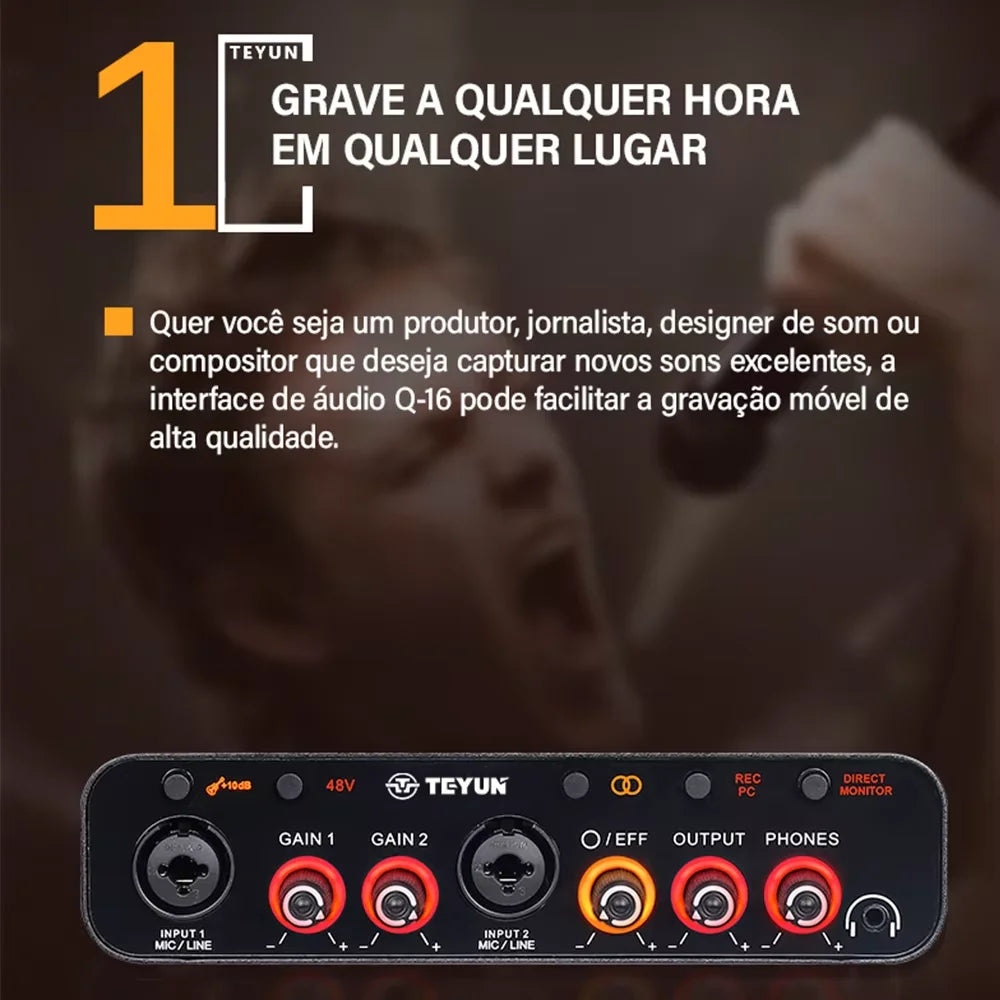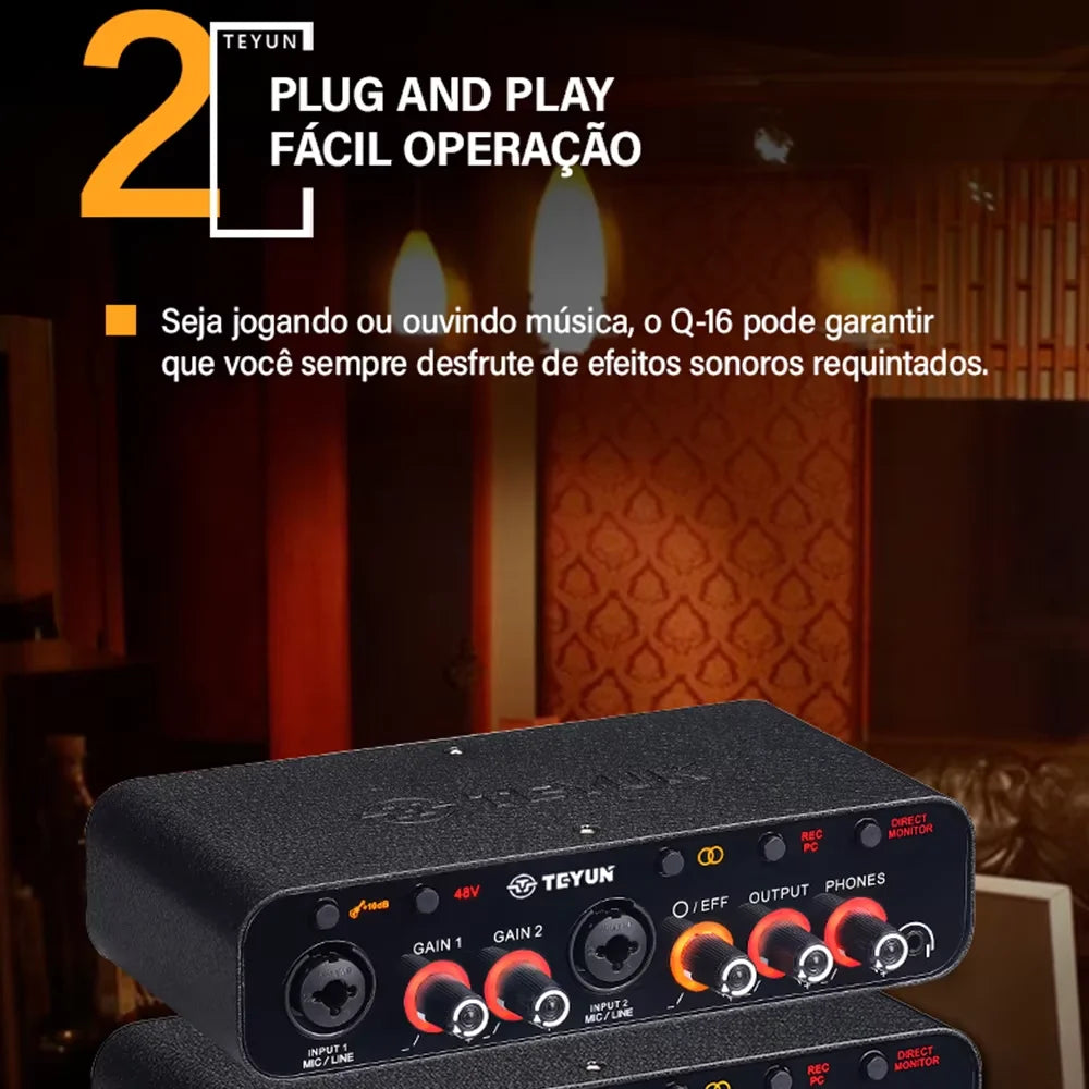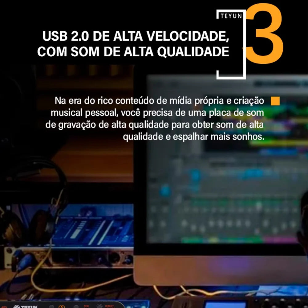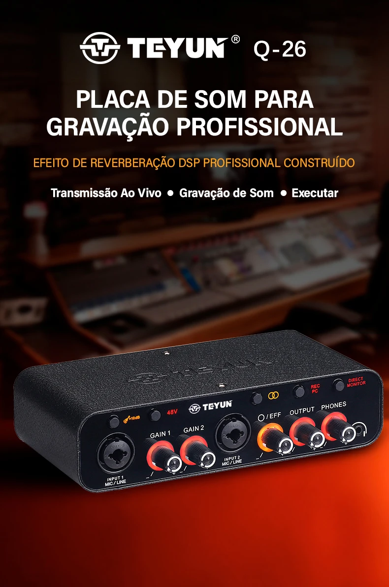 A Placa de Som Externa USB TEYUN Q-26 é uma interface de áudio profissional desenvolvida para músicos, produtores e cantores que exigem qualidade superior em suas gravações. Certificada internacionalmente (CE, FCC e RoHS), garante compatibilidade global e conformidade com os mais altos padrões de segurança e desempenho. Especialmente projetada para capturar o som autêntico de guitarras elétricas com precisão cristalina, esta interface funciona perfeitamente em estúdios caseiros, salas de ensaio e ambientes profissionais de gravação ao vivo. Sua conectividade USB oferece integração imediata e estável com qualquer computador, eliminando a necessidade de drivers complexos ou configurações complicadas. O modelo Q-26 combina funcionalidades de misturador e amplificador em um único dispositivo compacto, proporcionando controle total sobre níveis de áudio, ganho de entrada e saída de monitoramento. Ideal para gravação de vozes, instrumentos acústicos e elétricos, permite que você trabalhe com múltiplas fontes de áudio simultaneamente, mantendo clareza e definição em cada faixa. Perfeita para produção musical séria, podcasts, apresentações ao vivo via PC e streaming, a TEYUN Q-26 oferece a confiabilidade e flexibilidade que profissionais exigem em seus projetos.