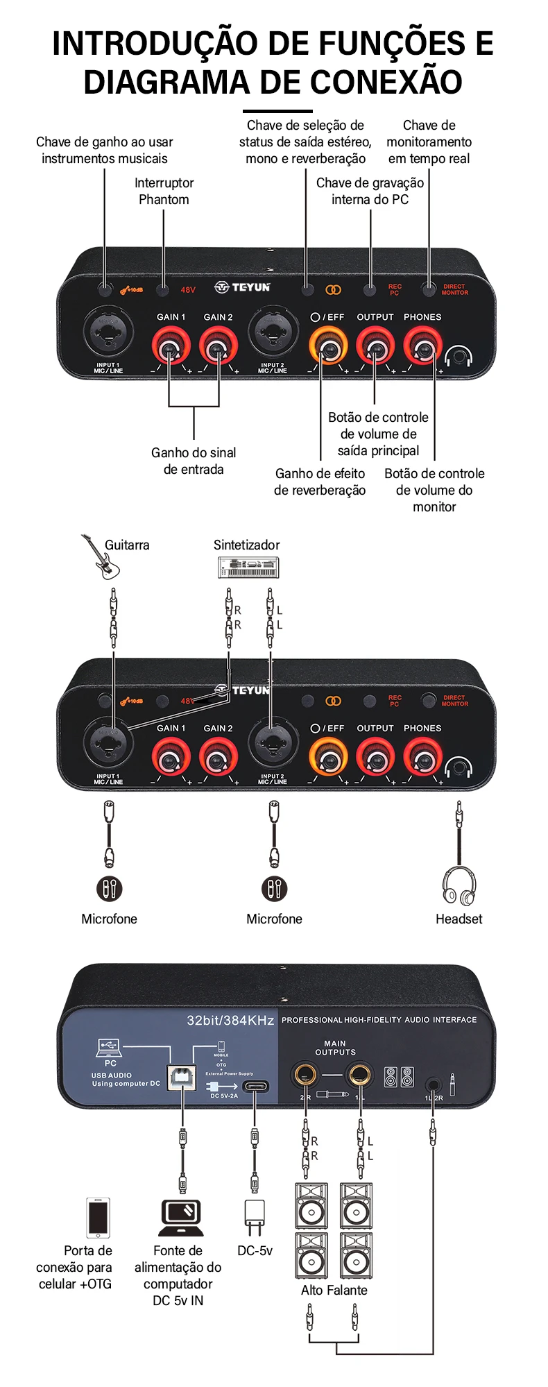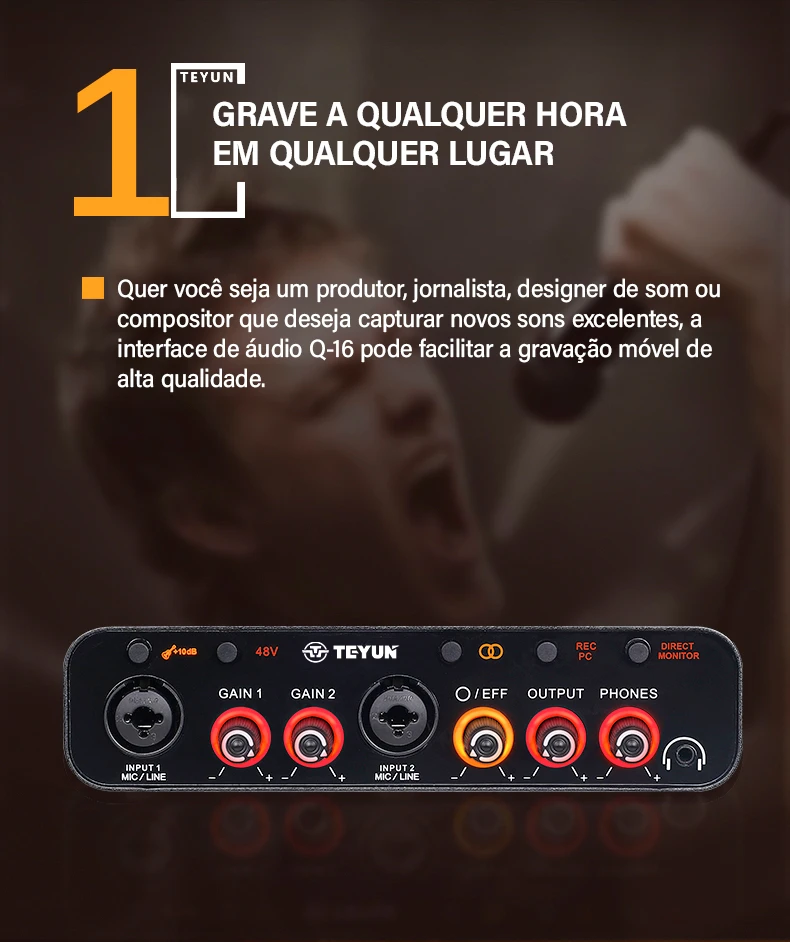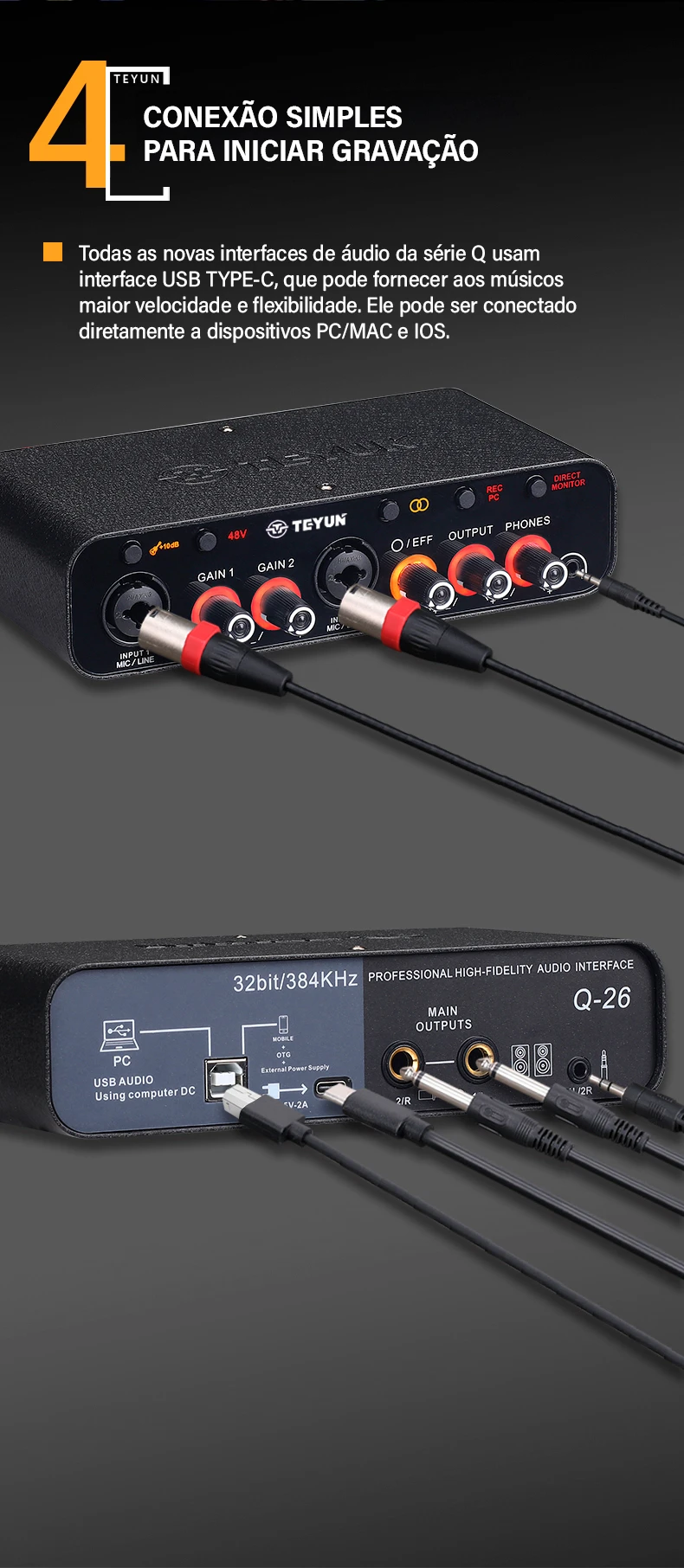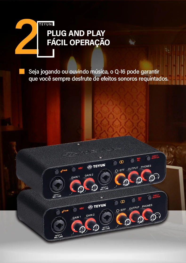 A Placa de Som Externa USB TEYUN Q-26 é uma interface de áudio profissional desenvolvida para músicos, produtores e cantores que exigem qualidade superior em suas gravações. Certificada internacionalmente (CE, FCC e RoHS), garante compatibilidade global e conformidade com os mais altos padrões de segurança e desempenho. Especialmente projetada para capturar o som autêntico de guitarras elétricas com precisão cristalina, esta interface funciona perfeitamente em estúdios caseiros, salas de ensaio e ambientes profissionais de gravação ao vivo. Sua conectividade USB oferece integração imediata e estável com qualquer computador, eliminando a necessidade de drivers complexos ou configurações complicadas. O modelo Q-26 combina funcionalidades de misturador e amplificador em um único dispositivo compacto, proporcionando controle total sobre níveis de áudio, ganho de entrada e saída de monitoramento. Ideal para gravação de vozes, instrumentos acústicos e elétricos, permite que você trabalhe com múltiplas fontes de áudio simultaneamente, mantendo clareza e definição em cada faixa. Perfeita para produção musical séria, podcasts, apresentações ao vivo via PC e streaming, a TEYUN Q-26 oferece a confiabilidade e flexibilidade que profissionais exigem em seus projetos.