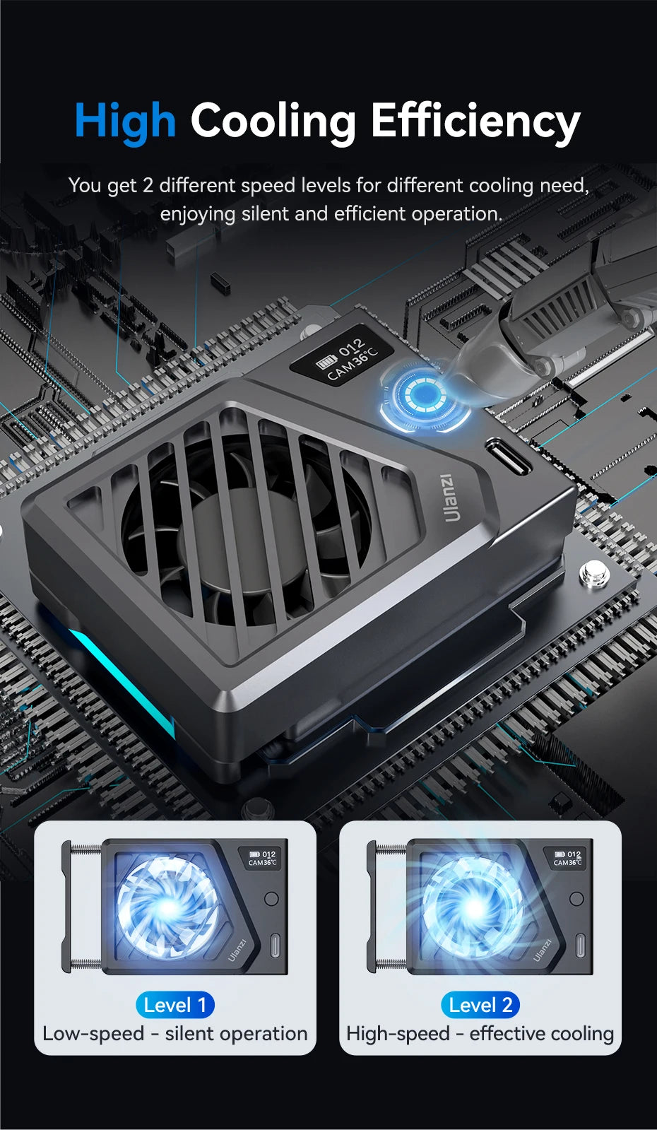 Real-time Monitoring of Temperature and Fan Speed: 0.46-inch OLED display design, clear display of camera temperature and fan speed levels.