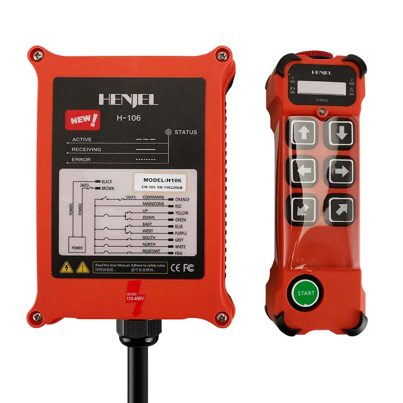 Controle remoto industrial HENJEL H106 com 6 botões para guincho hidráulico, à prova d'água.