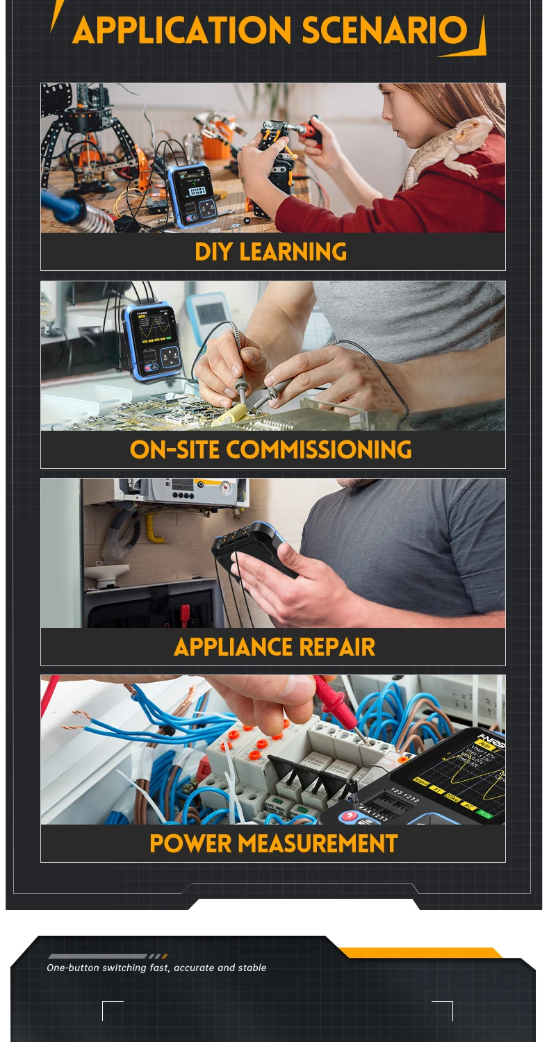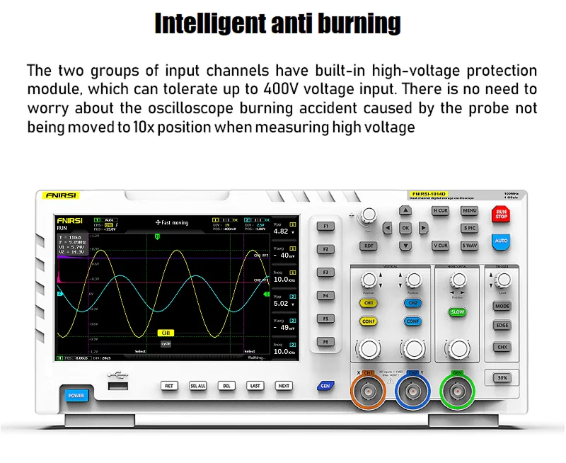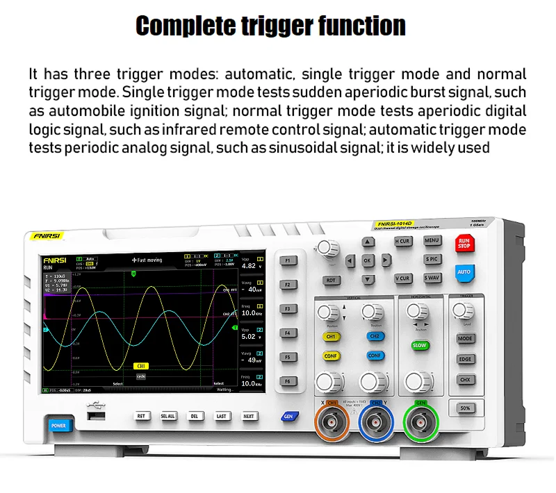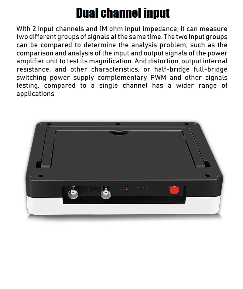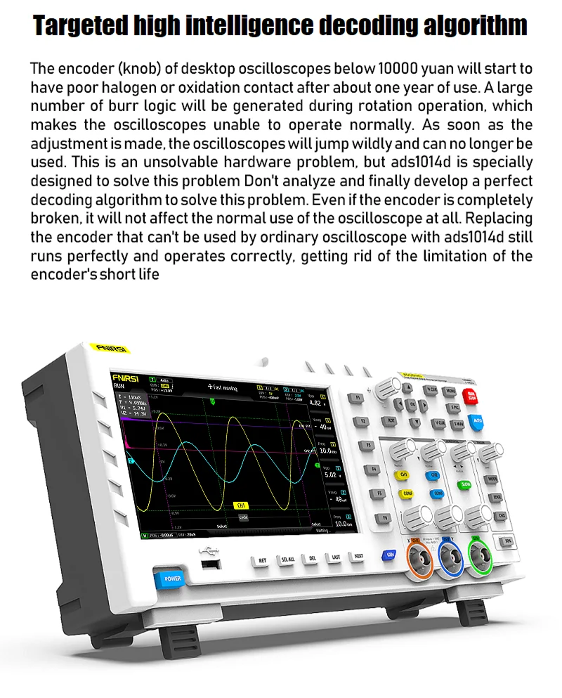 FNIRSI-1014D is a two in one oscilloscope and signal generator launched by FNIRSI. It has comprehensive functions and high practicability. It is a cost-effective dual channel desktop oscilloscope for the maintenance industry and R & D industry. The oscilloscope has a real-time sampling rate of 1GSa / s and 100MHz* 2 analog bandwidth; complete trigger function (single time / normal / automatic), both for periodic analog signal and aperiodic digital signal can be used freely; built in DDS function signal generator and the industry's original chopping output (@ 2.5vpp), all signal frequency step is 1Hz, support 14 kinds of standard function signal and a customizable chopping signal, chopping The output device intercepts part or the whole part of the complex signals measured by the oscilloscope as the output signal of the signal generator, which can store up to 1000 customized cut-off signals; the built-in high-voltage protection module can tolerate up to 400V continuous voltage, without worrying about the oscilloscope burning accident caused by the probe not moving to 10x gear. Large time base scrolling mode, which can monitor slow level changes; equipped with efficient one button auto, which can display the measured waveform without tedious adjustment; display high-definition LCD with 7-inch 800 * 480 resolution; cursor measurement function, when manually reading amplitude and frequency parameters, it does not need to read the background scale unit and quantity, and it does not need to convert to directly get peak to peak and frequency Extremely convenient screen capture and waveform storage function, built-in 1GB storage space, can store up to 1000 screen capture pictures + 1000 groups of waveform data, the storage process is simple and fast, save the current waveform with only one click, no cumbersome prompts and choices to save the current data, very convenient; powerful waveform image manager, support thumbnail browsing, view, view details The functions of page turning, deleting and waveform enlarging, reducing and moving are convenient for secondary analysis. The fuselage is equipped with USB interface, which can be connected with the computer to realize the sharing of its own screen capture pictures and the computer, which is convenient for secondary analysis; Li Shayu's graphic display function can be used to compare and judge the amplitude, frequency and phase of two groups of signals; FFT viewing function can estimate the harmonic component of signals; Li Shayu's graphic display function can be used to compare and judge the amplitude, frequency and phase of two groups of signals;