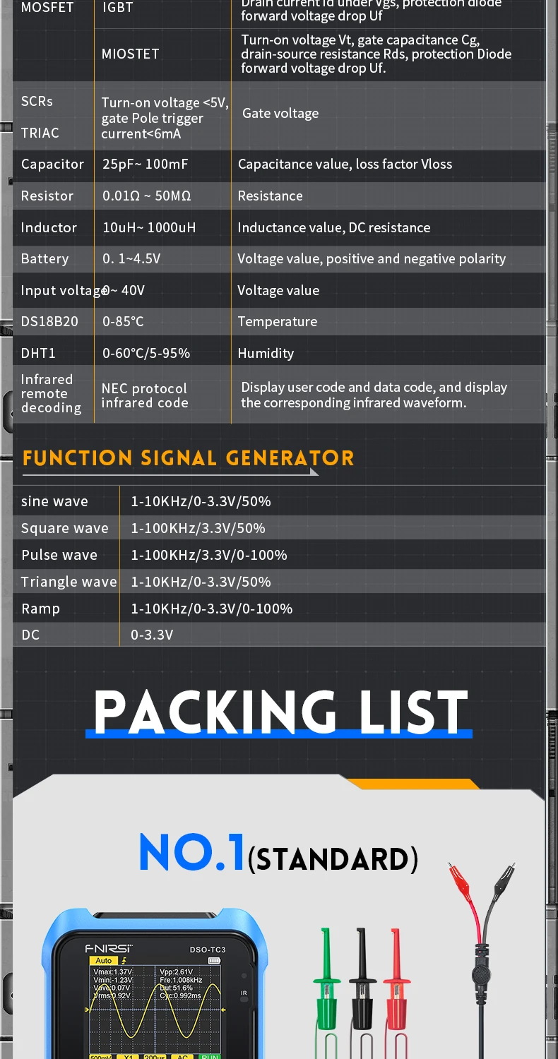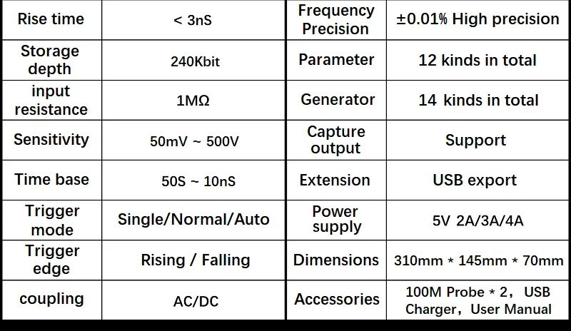 Up to 12 parameters measurement:VPP,VP,Vmax,Vmin,Vavg,Vrms,Frequent,Duty+,Duty-,Time+,Time-,Period.