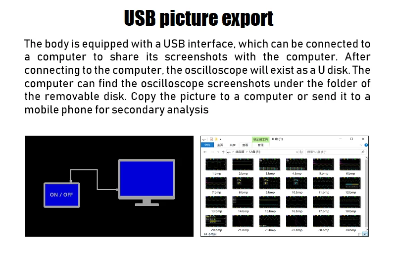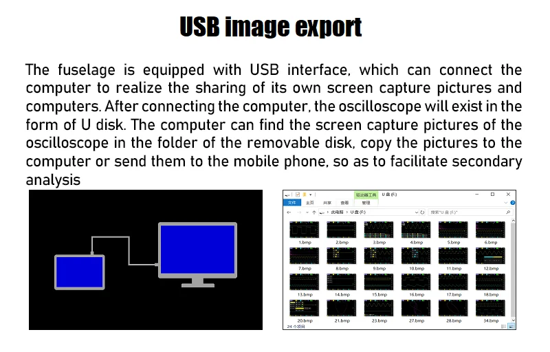Equipped with a USB interface, which can be connected to a com-puter to share its screenshots with the com-puter, which is convenient for secondary analysis.