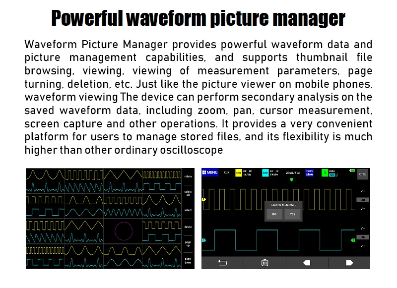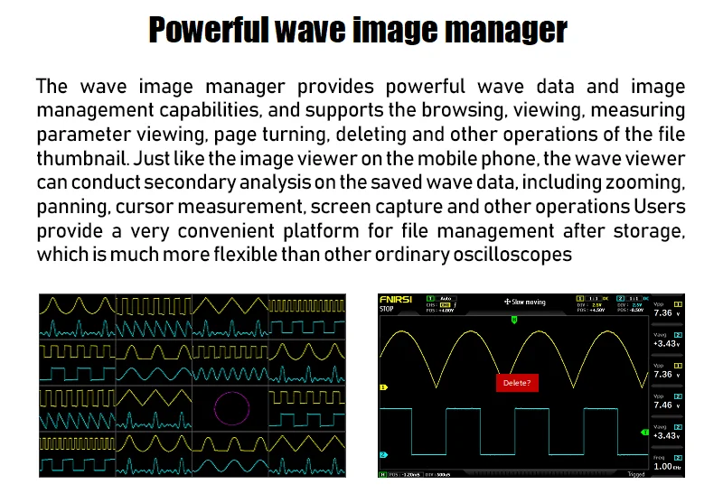 Powerful waveform picture manager supports thumbnail browsing, viewing, detailed viewing, page turning, deletion and waveform zooming in, zooming out, moving, etc.
