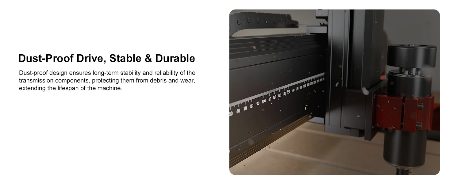 • Sealed Drive Design: Fully enclosed X/Y/Z drive system protects against dust and chips, extending machine lifespan.