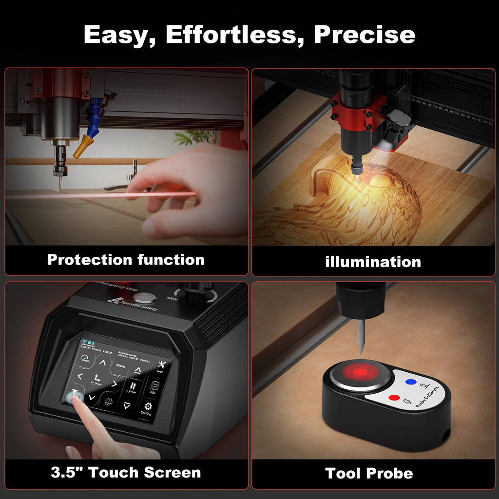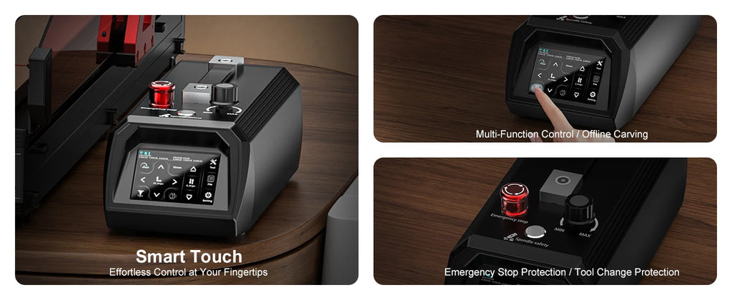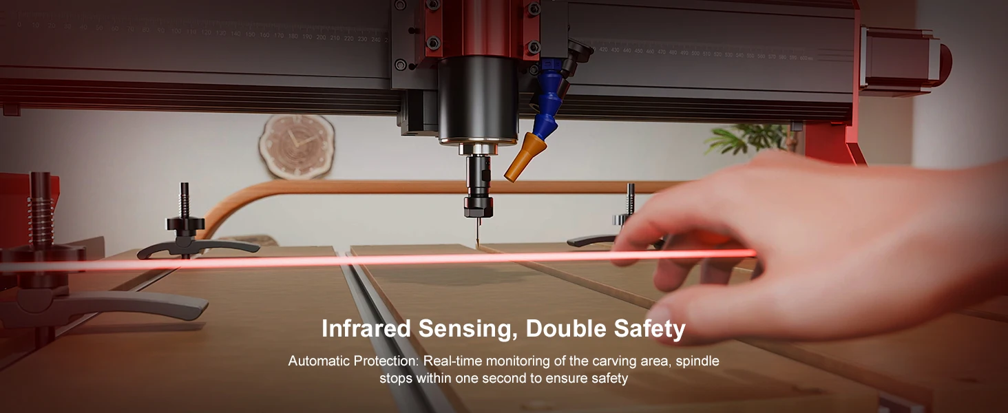 • Safety Features: Infrared beam sensor auto-stops machine when interrupted; spindle can be cut off instantly via control box for safe tool changes.