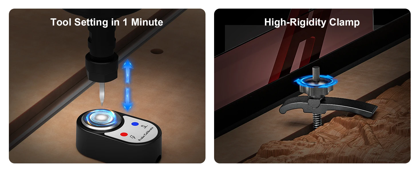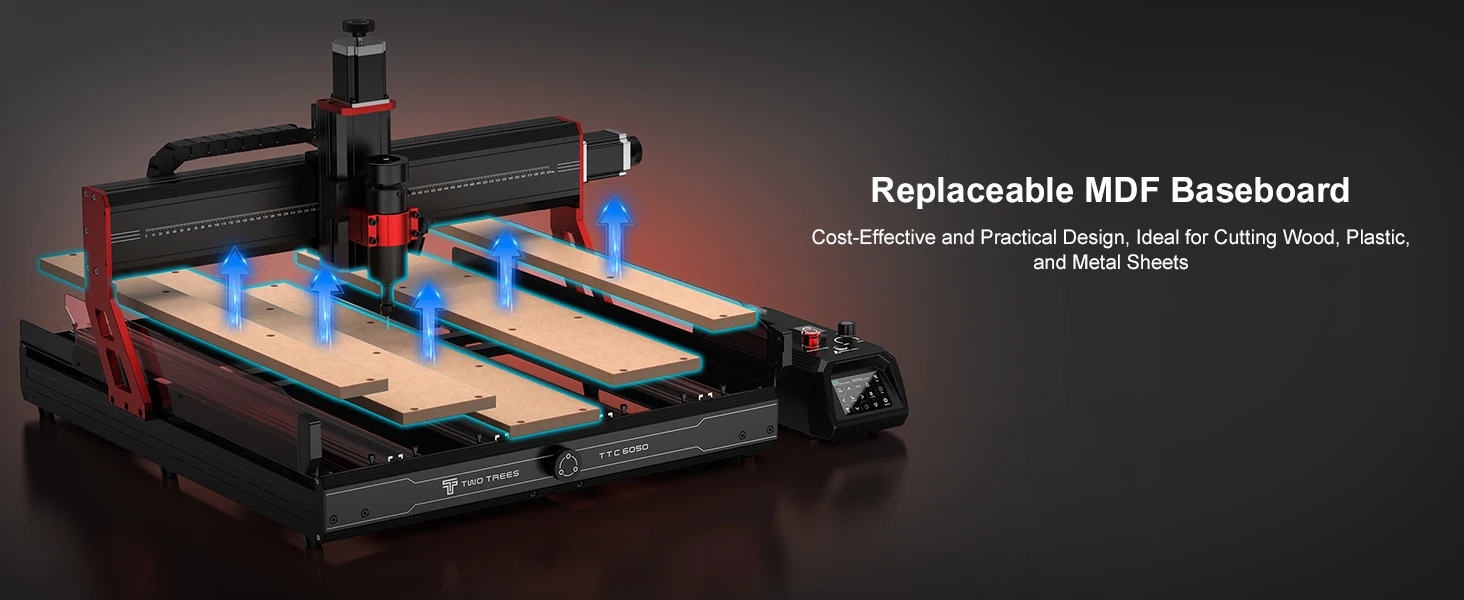 • Durable Work Platform: Equipped with aluminum T-slot base + MDF spoilboards, compatible with various clamps and easy to maintain or replace.