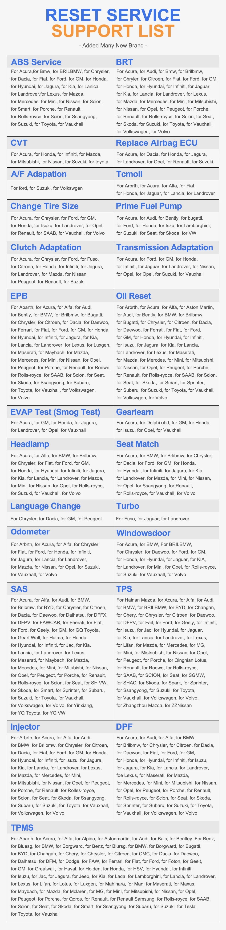 Reset Service Support Car List: