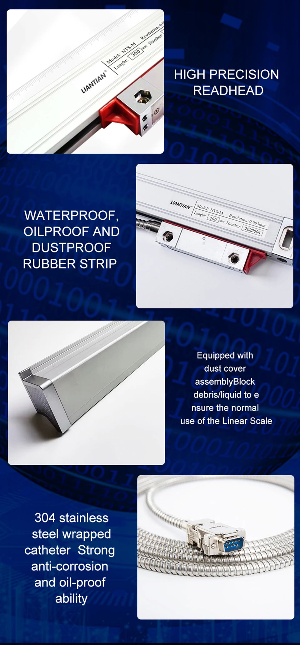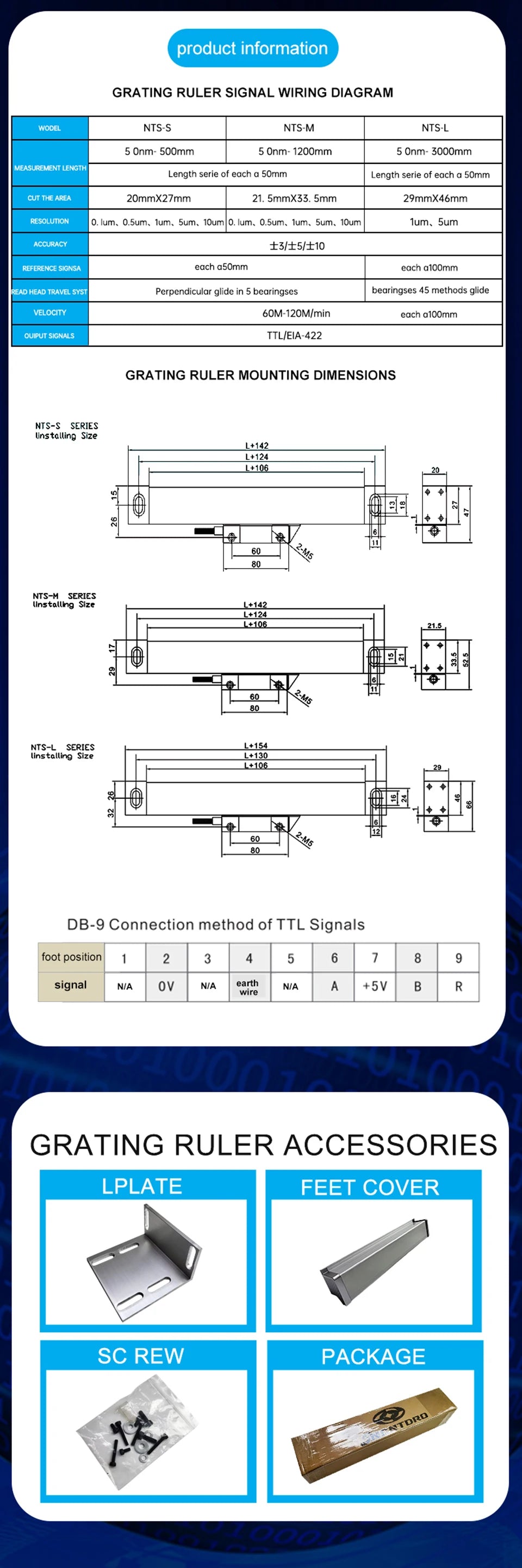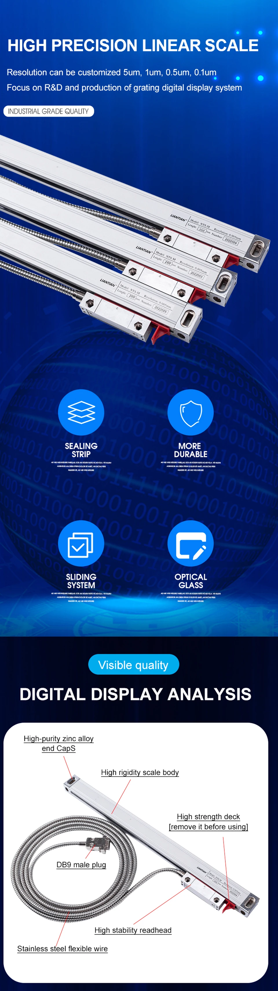 1. You can choose 2 pieces scale within 50-1000mm travel measuring length with 5um/1um resolution.