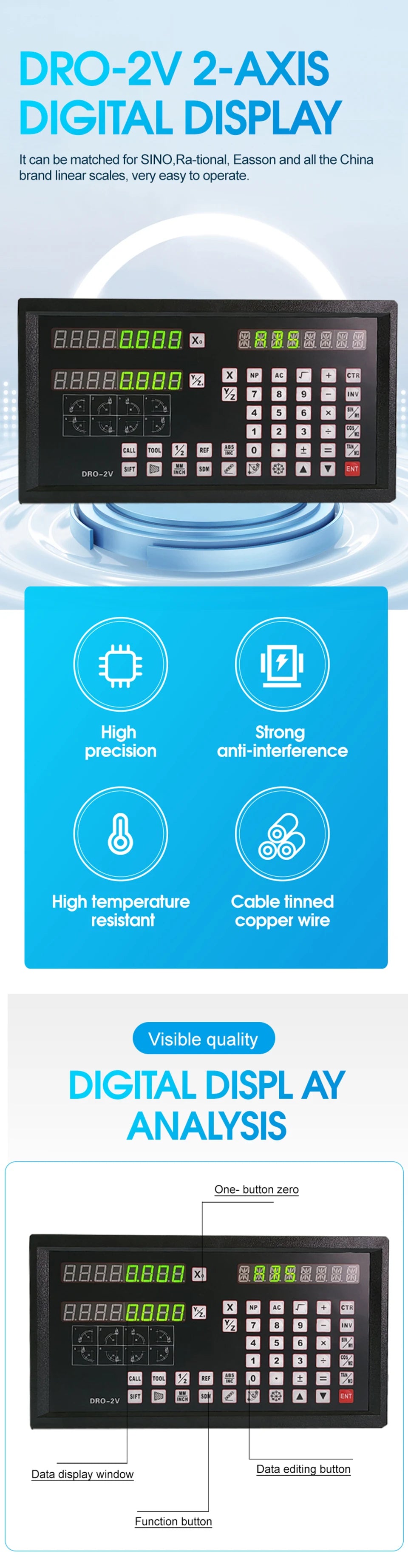 This order includes 1 pieces 2-axis DRO-2V and 2 pieces linear scales with travel length between 50 to 1000mm, after order and payment please contact seller to write down you needed scales travel(measuring) length.
