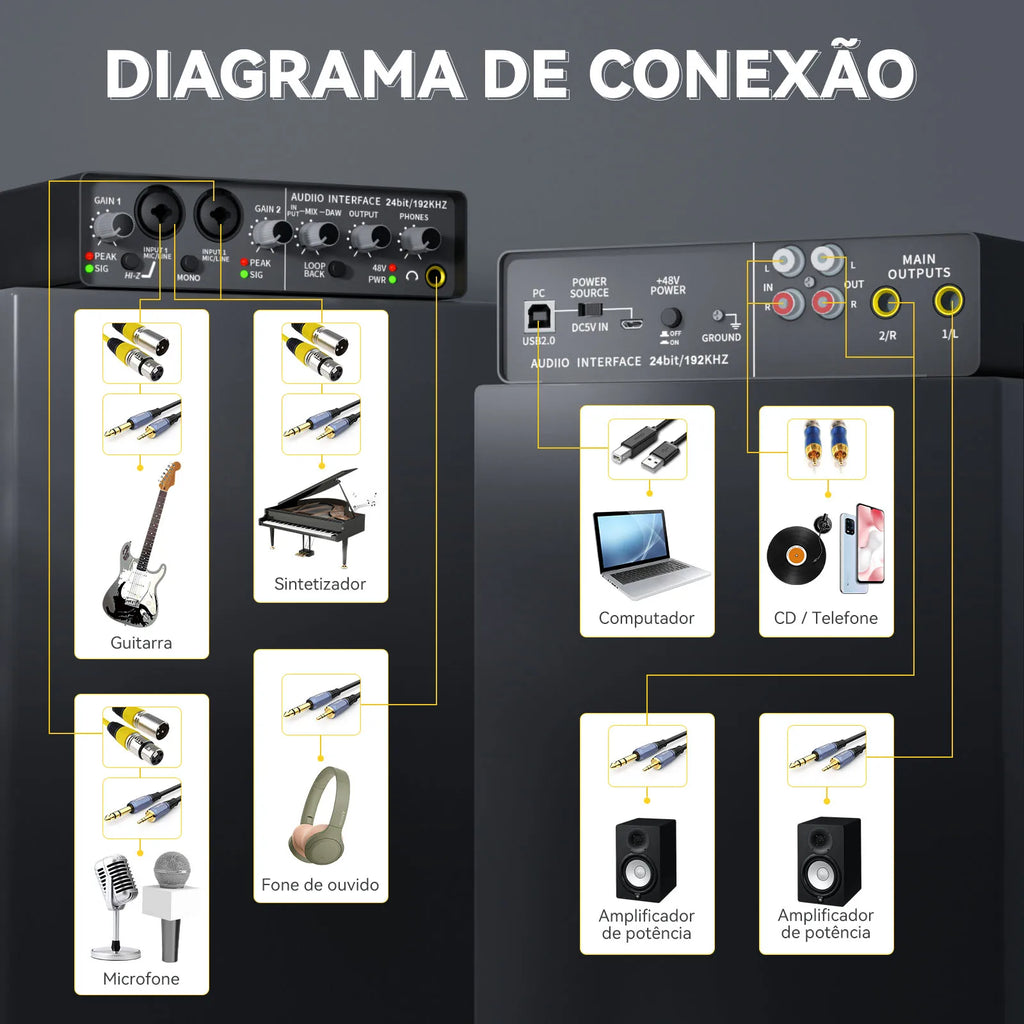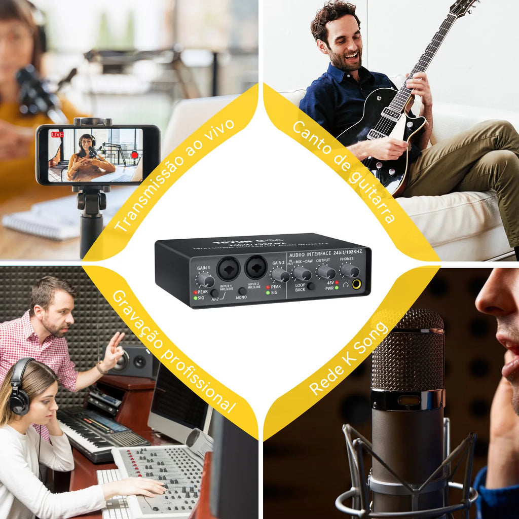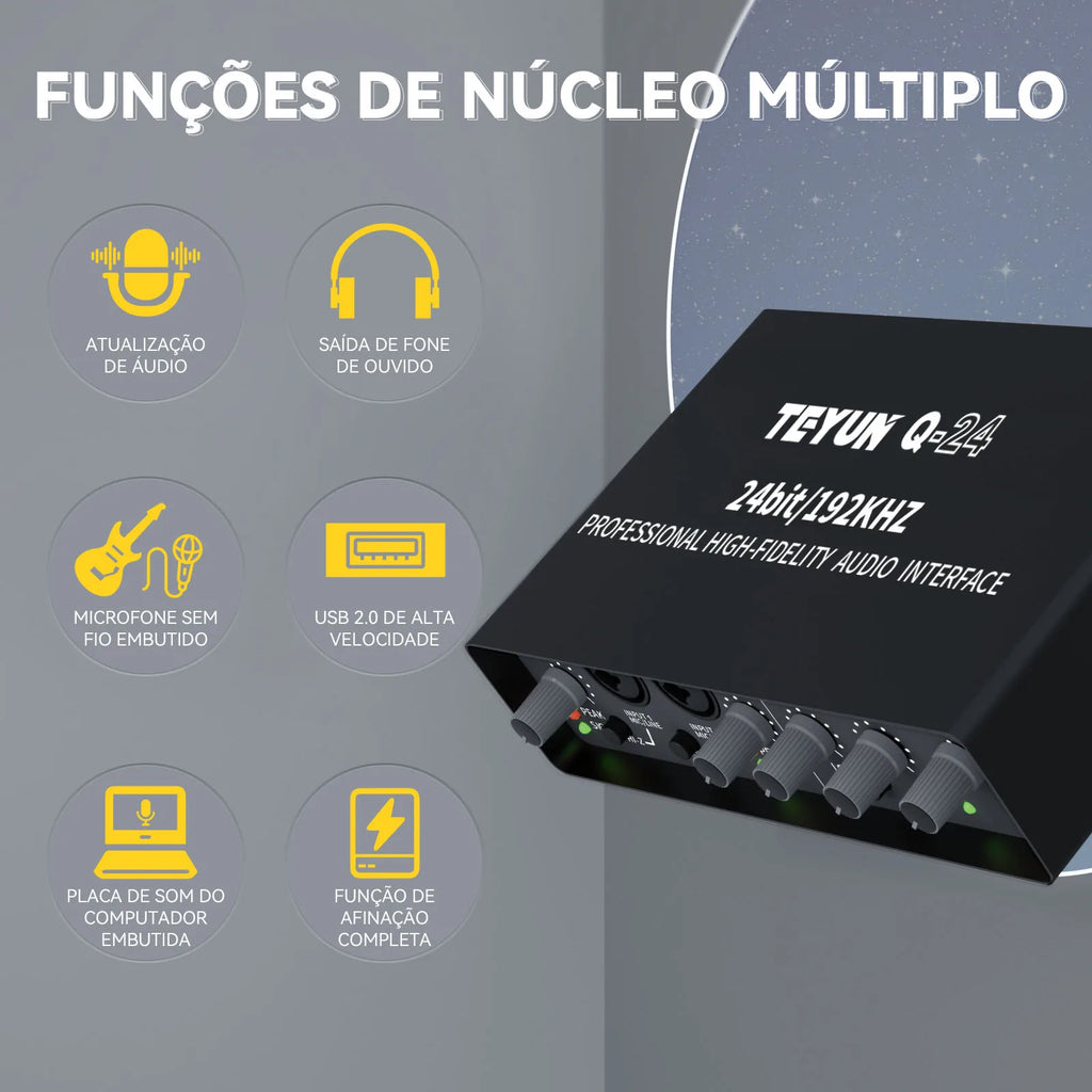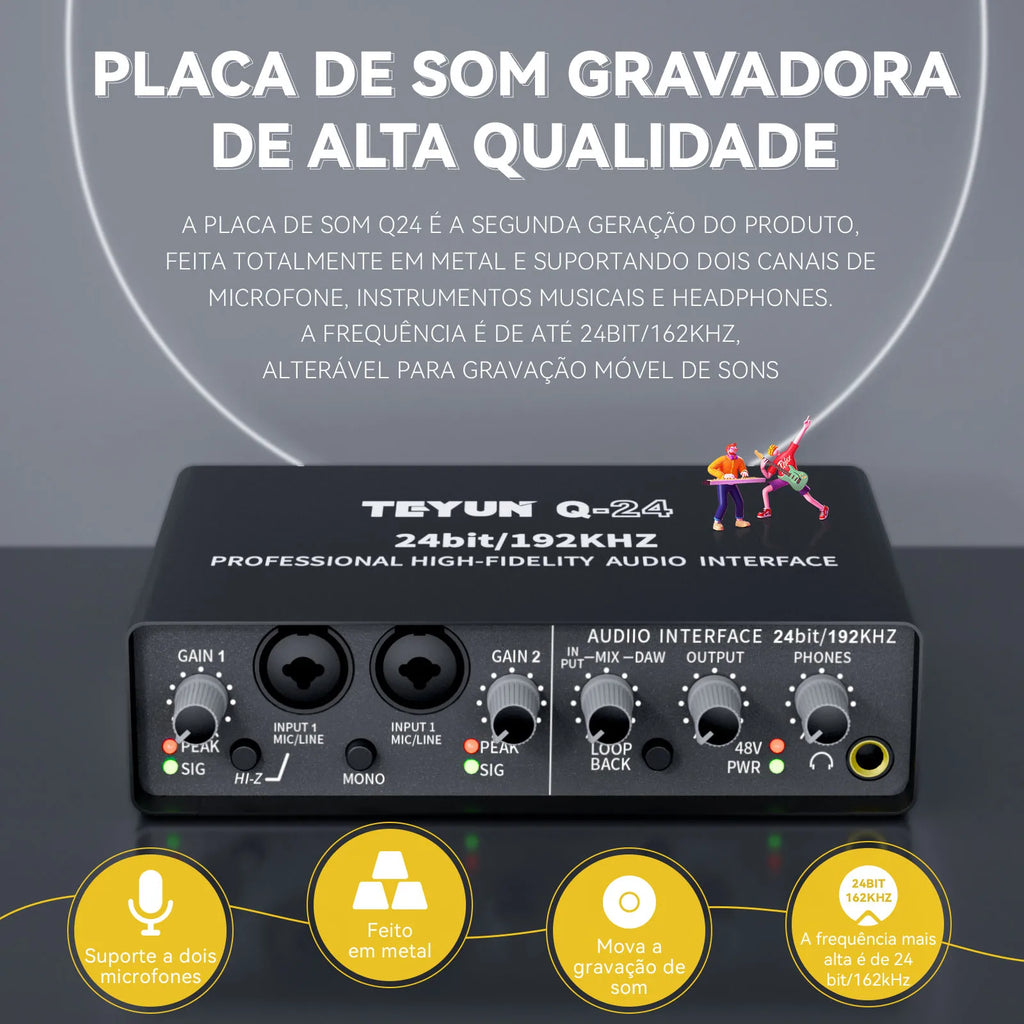 A Placa de Som Profissional TEYUN Q-24 é uma solução completa e versátil para músicos, produtores e engenheiros de som que demandam qualidade profissional em gravações ao vivo, transmissões e trabalhos em estúdio. Equipada com funcionalidades avançadas de mixer e amplificador integradas, proporciona monitoramento dedicado e preciso para guitarra elétrica, baixo e outros instrumentos, permitindo controle total do som durante performances ao vivo e sessões de gravação em estúdio. Seu design robusto e interface intuitiva facilitam a operação em diferentes cenários, desde pequenos estúdios caseiros até ambientes profissionais. A compatibilidade total com computadores e PCs oferece flexibilidade para integração em setups de produção digital. Certificada internacionalmente pelos padrões CE, FCC e RoHS, garante segurança, confiabilidade e conformidade com regulamentações globais. Ideal para cantores, guitarristas, baixistas e produtores que exigem equipamento profissional de alta performance para transmissões ao vivo, gravações de qualidade estúdio e monitoramento preciso durante apresentações.
