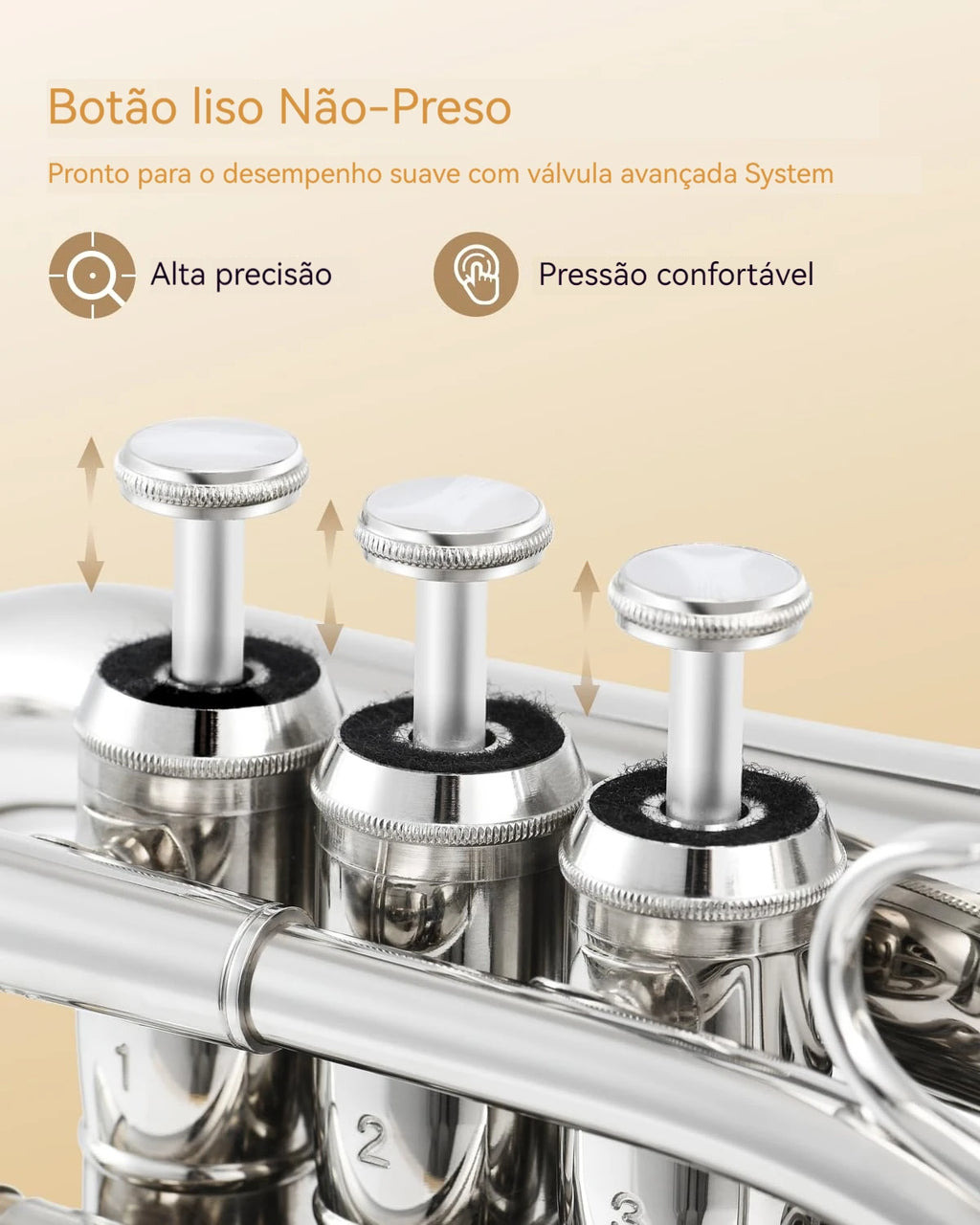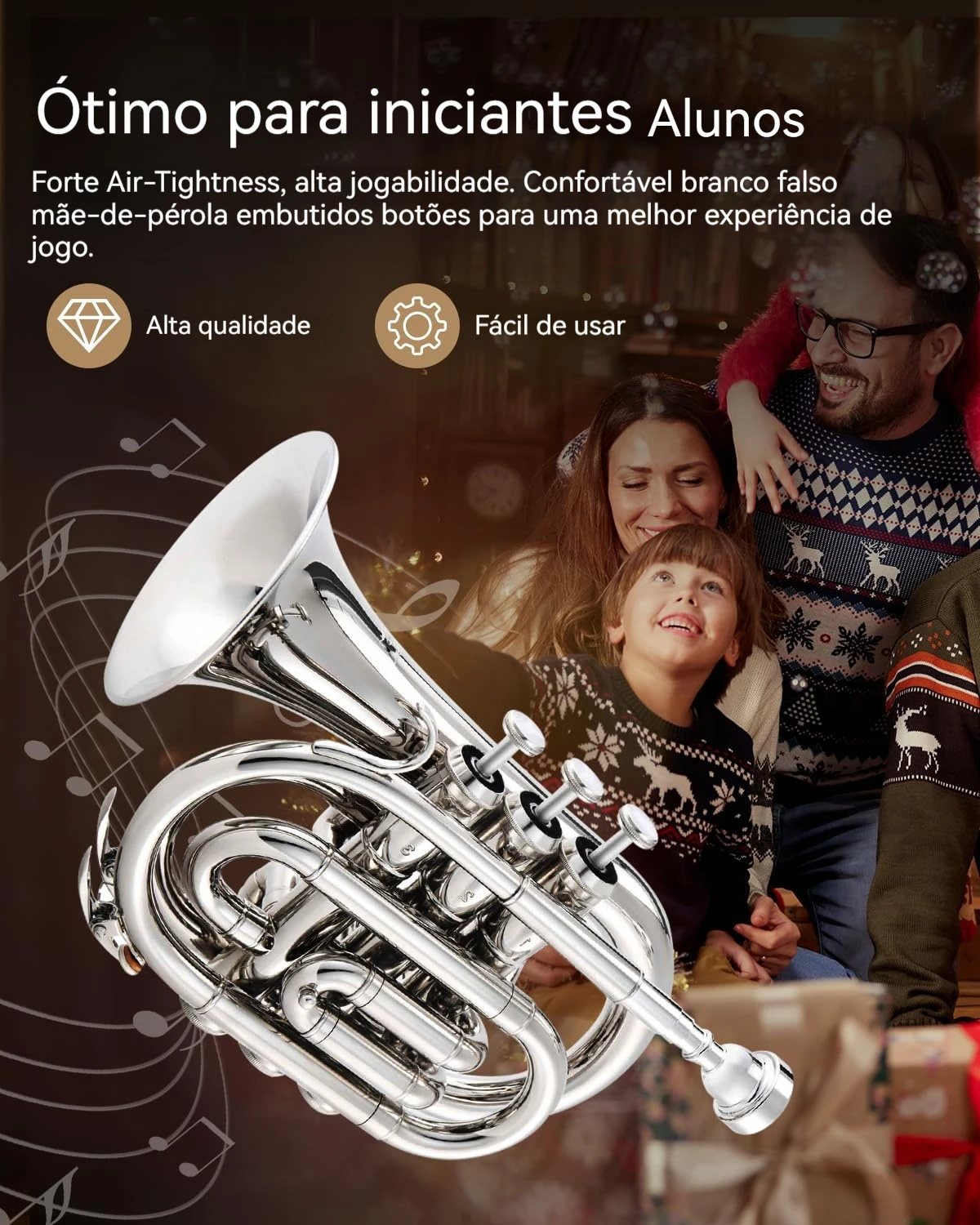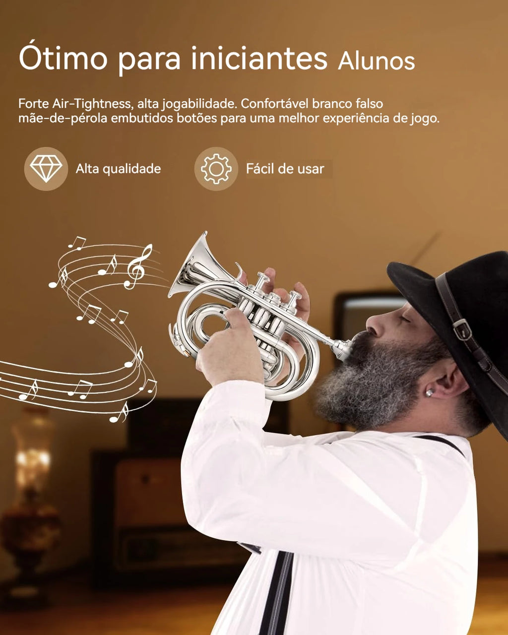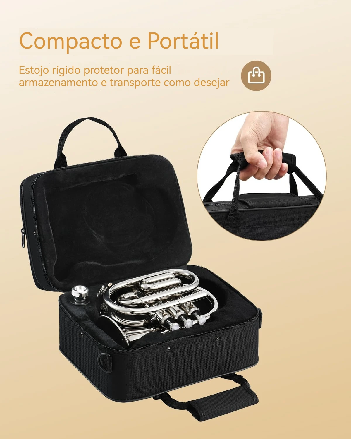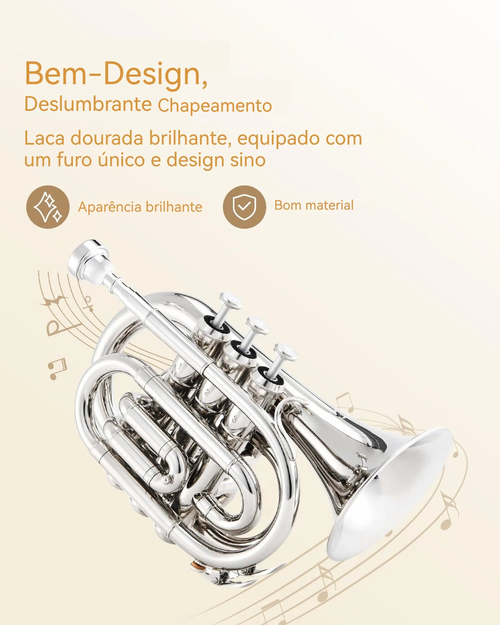 Trompete de bolso em Si bemol (Eb) de alta qualidade, fabricada em liga de fósforo e cobre com acabamento banhado a prata que oferece durabilidade e estética profissional. Os pistões em aço inoxidável garantem precisão na execução e resistência ao uso contínuo. Instrumento versátil que produz som puro, rico e potente, com excelentes vibrações acústicas, tornando-o ideal para iniciantes, estudantes e músicos que desejam um instrumento portátil sem comprometer a qualidade sonora. O tamanho compacto facilita o transporte e a prática em qualquer ambiente, enquanto mantém as características técnicas de um instrumento profissional. Perfeito para quem busca explorar o repertório de trompete em formato miniaturizado. O design elegante com reflexão impecável combina funcionalidade com apresentação refinada, tornando-a um presente excepcional para músicos e colecionadores. Kit completo inclui bocal de qualidade, luvas de proteção para preservar o acabamento, pano de limpeza especializado e estojo de transporte resistente. Tudo que você precisa para começar a tocar imediatamente ou complementar sua coleção de instrumentos de sopro.