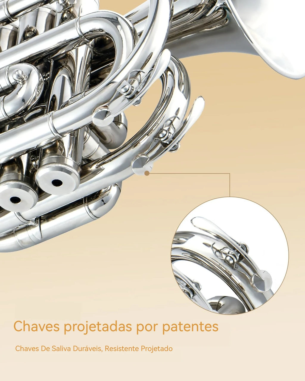Som incrível - O som e o timbre da trompete de bolso VEDO Bb são puros, brilhantes, ricos e potentes, com excelentes vibrações. É também um instrumento de metal fácil de usar, adequado para iniciantes e estudantes