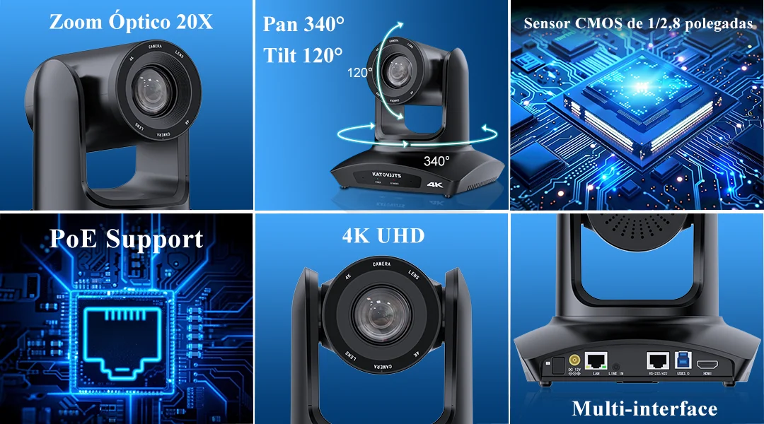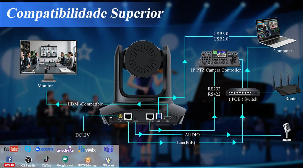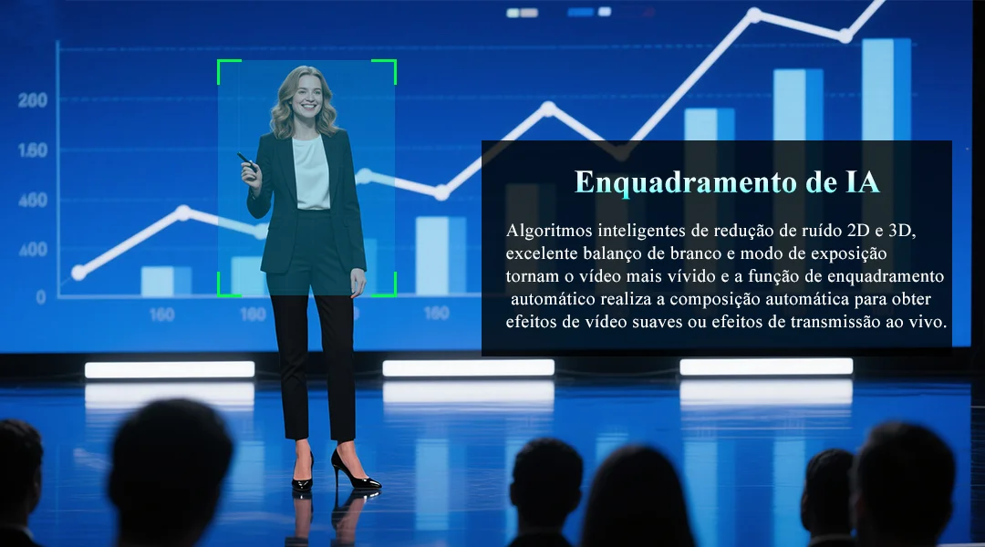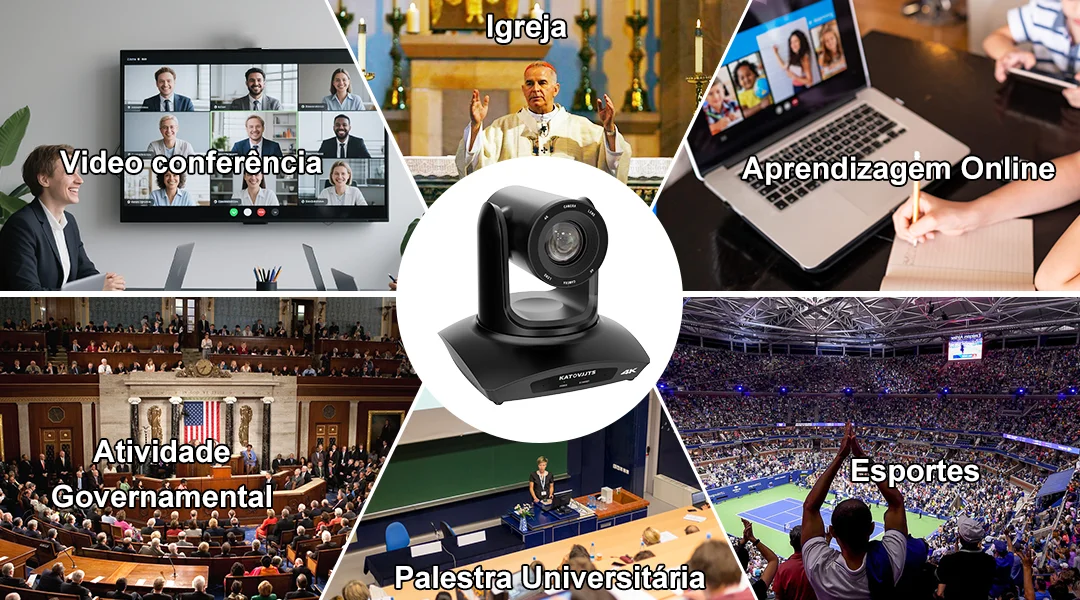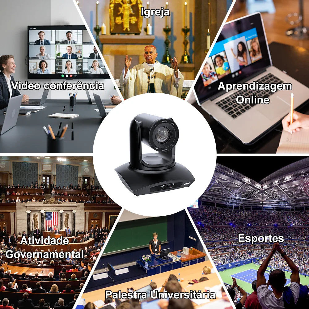 Câmera PTZ profissional 4K com zoom óptico 20x, desenvolvida especificamente para transmissões ao vivo em igrejas, eventos corporativos e ambientes de videoconferência. O sistema de inteligência artificial integrado realiza enquadramento automático, acompanhando oradores e garantindo composição visual otimizada sem intervenção manual. Conectividade abrangente inclui USB 3.0, HDMI, LAN e alimentação via PoE, permitindo instalação simplificada e operação simultânea de múltiplas aplicações de streaming e conferência. Rotação horizontal de até 90°/s proporciona rastreamento fluido e responsivo. Construída com componentes de qualidade industrial, a câmera atende certificações CE, FCC e RoHS, assegurando conformidade com padrões internacionais de segurança e compatibilidade eletromagnética. O modelo H40GH2 da KATOVJJTS oferece desempenho robusto em ambientes internos e externos, capturando detalhes em resolução 4K com precisão profissional. Inclui adaptador e suporta múltiplos protocolos de comunicação (RS232, RS422) para integração com sistemas de controle existentes.