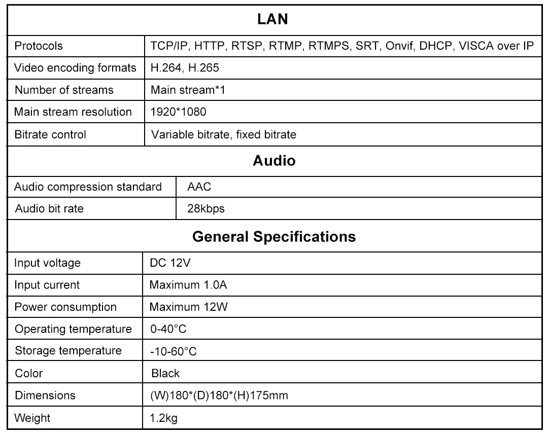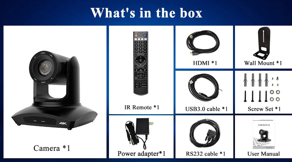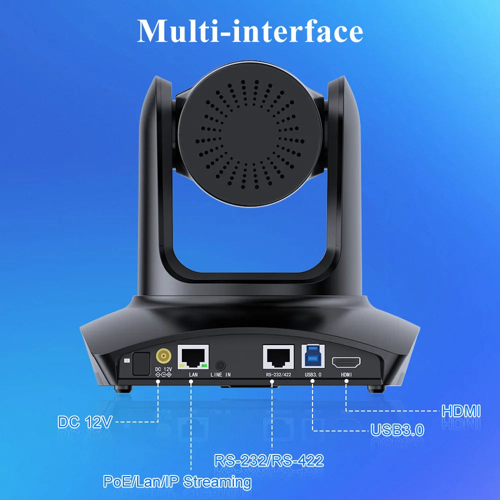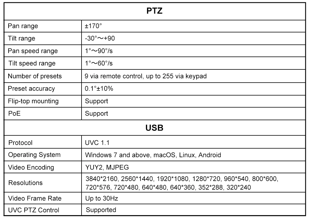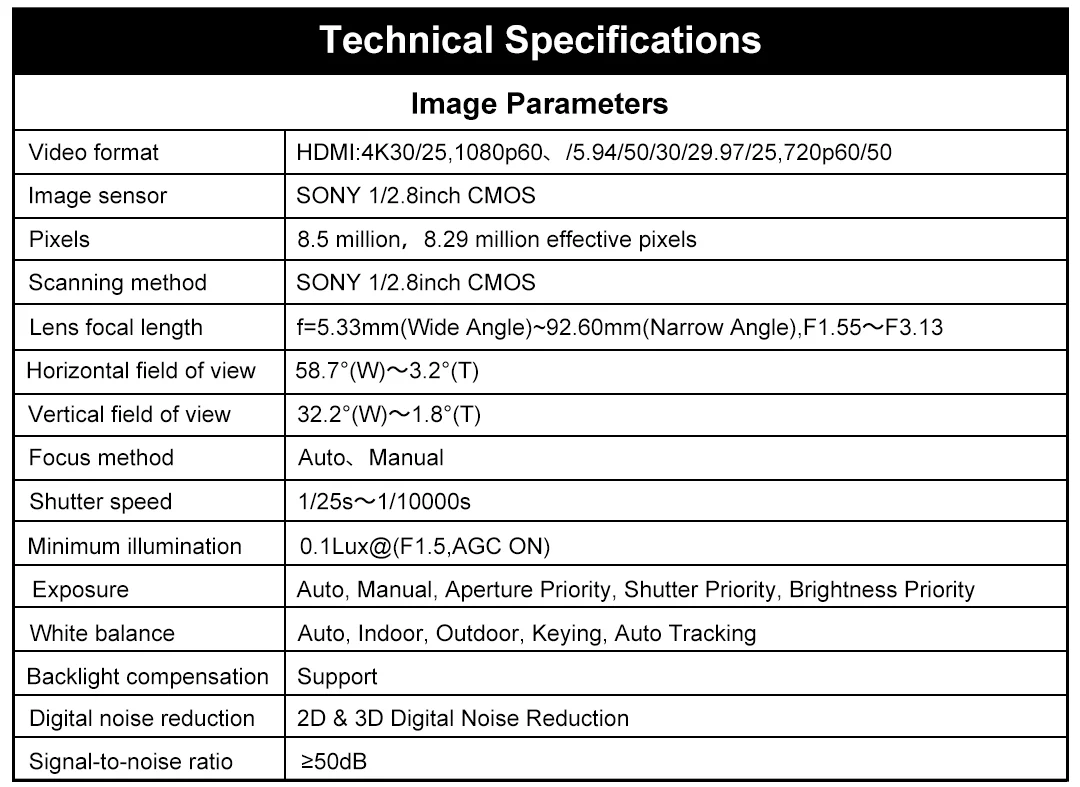 This is a 4K HD pan-tilt camera, equipped with a SONY 1/2.8 inch 8-megapixel high-quality image sensor, with an effective pixel count of 8.29 million, capable of producing high-quality images with a maximum resolution of 3840x2160. It is an ideal choice for video conference, distance teaching and enterprise.