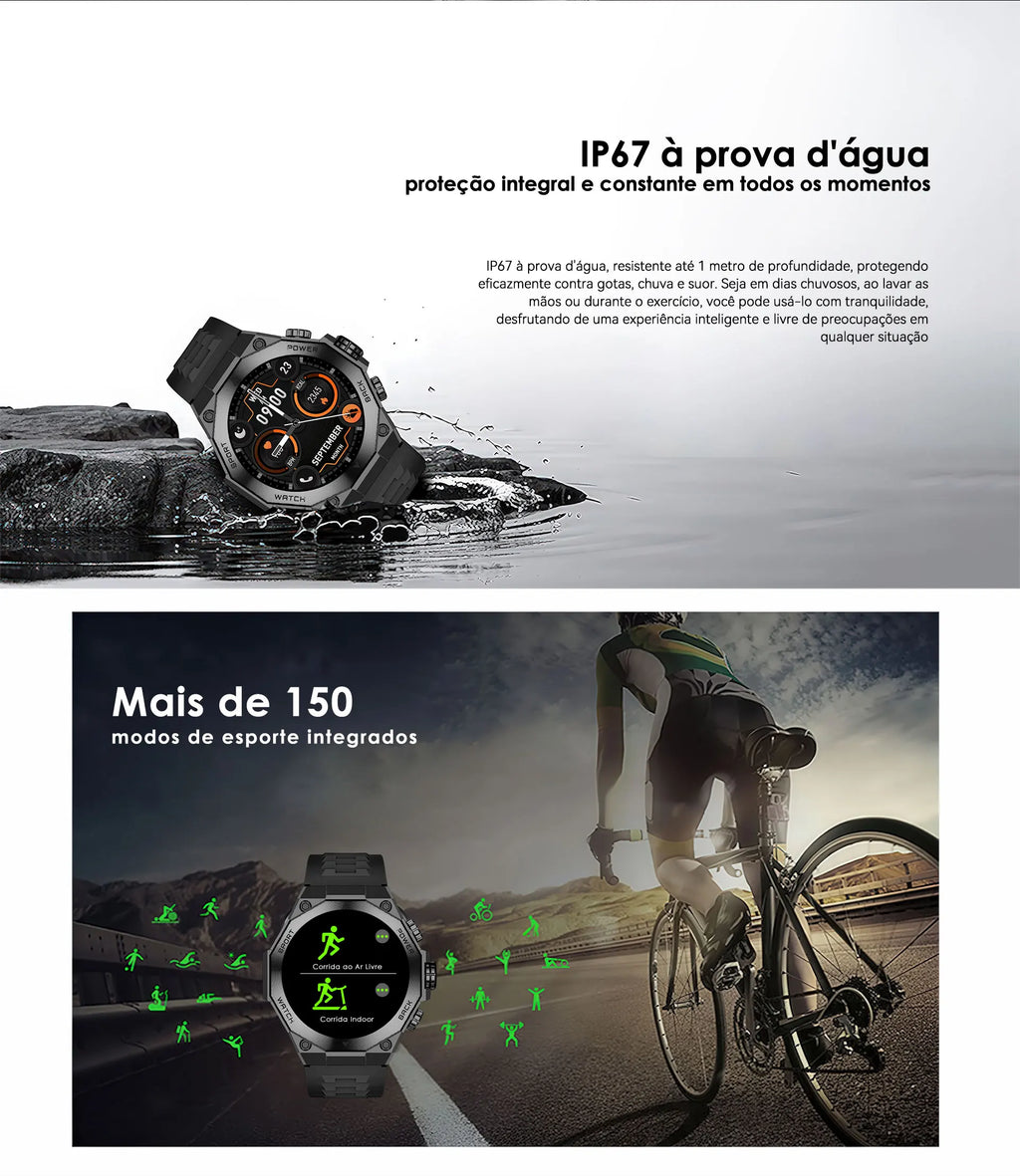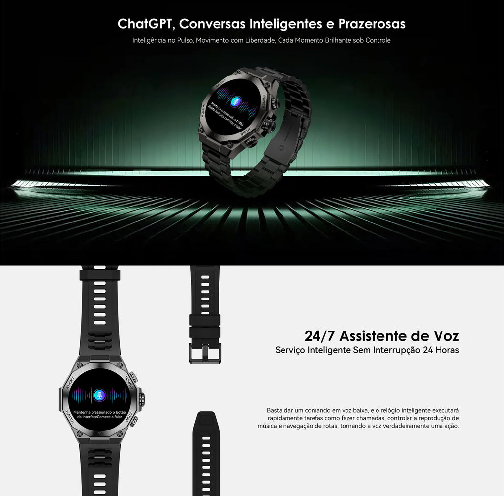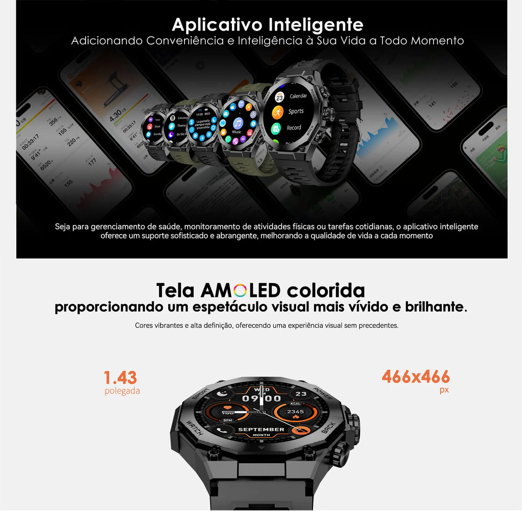 O Smartwatch AM18 AURAFIT ENERGY 2 é um relógio inteligente robusto projetado para o usuário ativo que não abre mão de tecnologia e desempenho. Sua tela AMOLED de 1,43" oferece visualização cristalina e vibrante, garantindo legibilidade em qualquer condição de luz. Com mais de 150 modos esportivos, você acompanha desde corrida, ciclismo e natação até atividades menos convencionais, registrando cada movimento com precisão. O monitoramento contínuo de frequência cardíaca, padrões de sono e gasto calórico fornece insights detalhados sobre sua saúde. A tecnologia Bluetooth 5.3 assegura conexão estável e rápida tanto com dispositivos Android quanto iOS, sincronizando dados sem interrupções. Receba notificações de chamadas e mensagens em tempo real, atenda chamadas direto do pulso e acesse funções práticas como calculadora, calendário permanente e hora mundial. Com autonomia de 10-15 dias, o AM18 reduz significativamente a necessidade de recargas frequentes, mantendo você conectado por mais tempo. Seu design masculino e compacto adapta-se perfeitamente ao pulso, oferecendo conforto durante treinos intensos e uso cotidiano. Ideal para atletas amadores e profissionais que buscam acompanhamento completo de saúde e desempenho físico integrado em um único dispositivo.