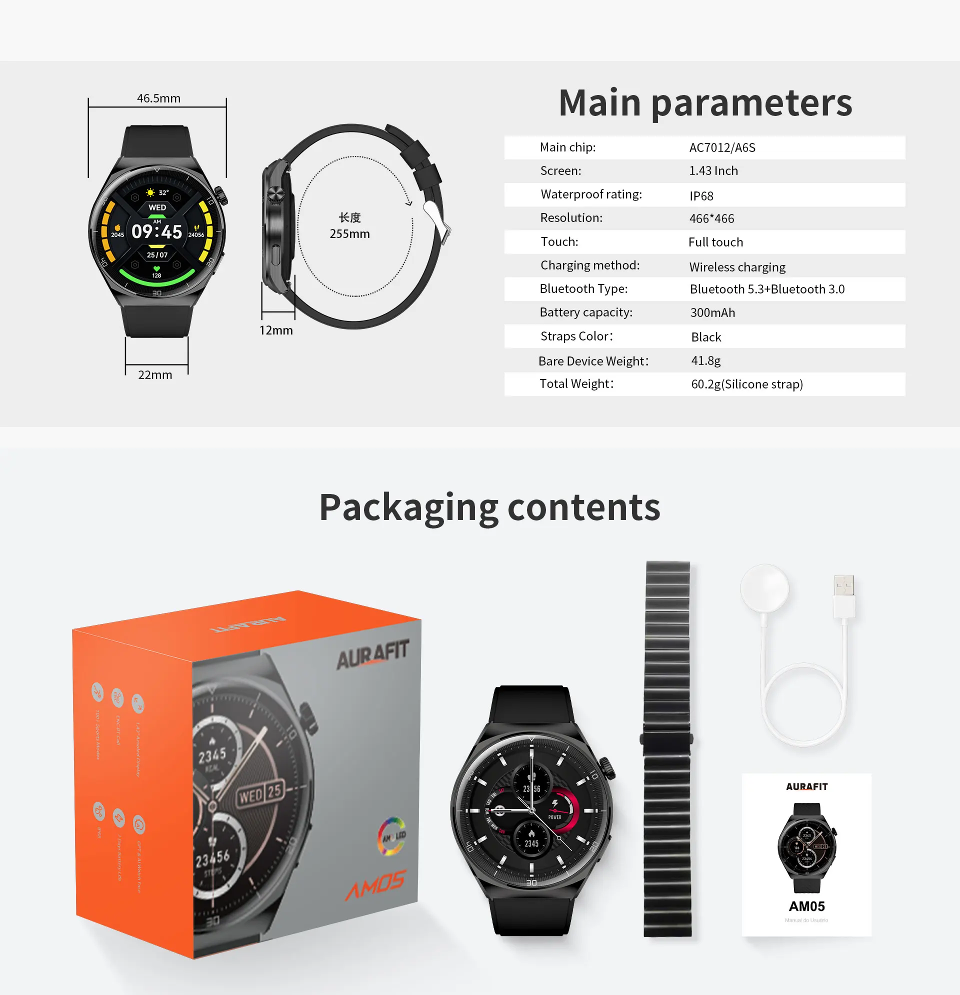 Aquí tienes la Traducción al Español de la Fiche tecnica del smartwatch Aurafit AM05: