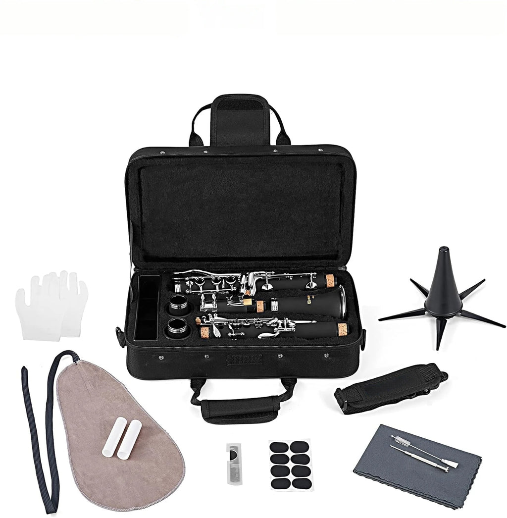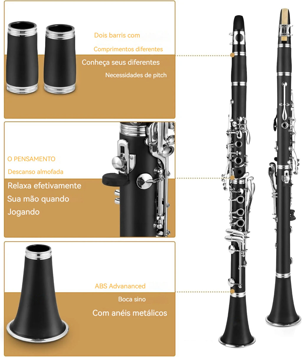 Design maravilhoso - As elegantes e requintadas chaves niqueladas e o corpo de madeira elétrica do clarinete dão a ele uma aparência charmosa e elegante. A boca de sino da embalagem circular acrescenta um toque de durabilidade ao seu design já impressionante