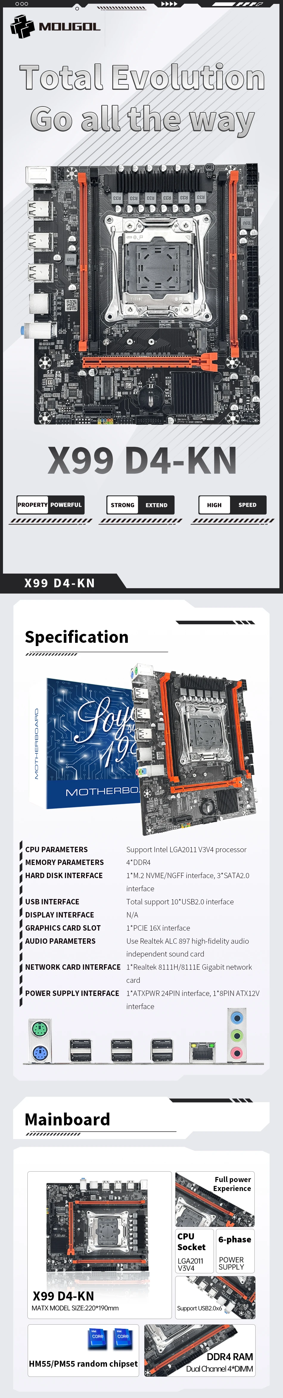 Kit completo de upgrade para computadores de alto desempenho. Placa-mãe MOUGOL X99 D4 com suporte LGA2011-3, combinada com processador Intel Xeon E5 2650 V4 de múltiplos núcleos, ideal para processamento intensivo e gaming exigente. Acompanha 16GB de memória RAM DDR4 2133MHz (2x8GB) para multitarefa fluida. Suporta armazenamento NVMe M.2 e SATA, garantindo velocidades de leitura/escrita superiores. Solução robusta para entusiastas que buscam performance e estabilidade em aplicações pesadas.