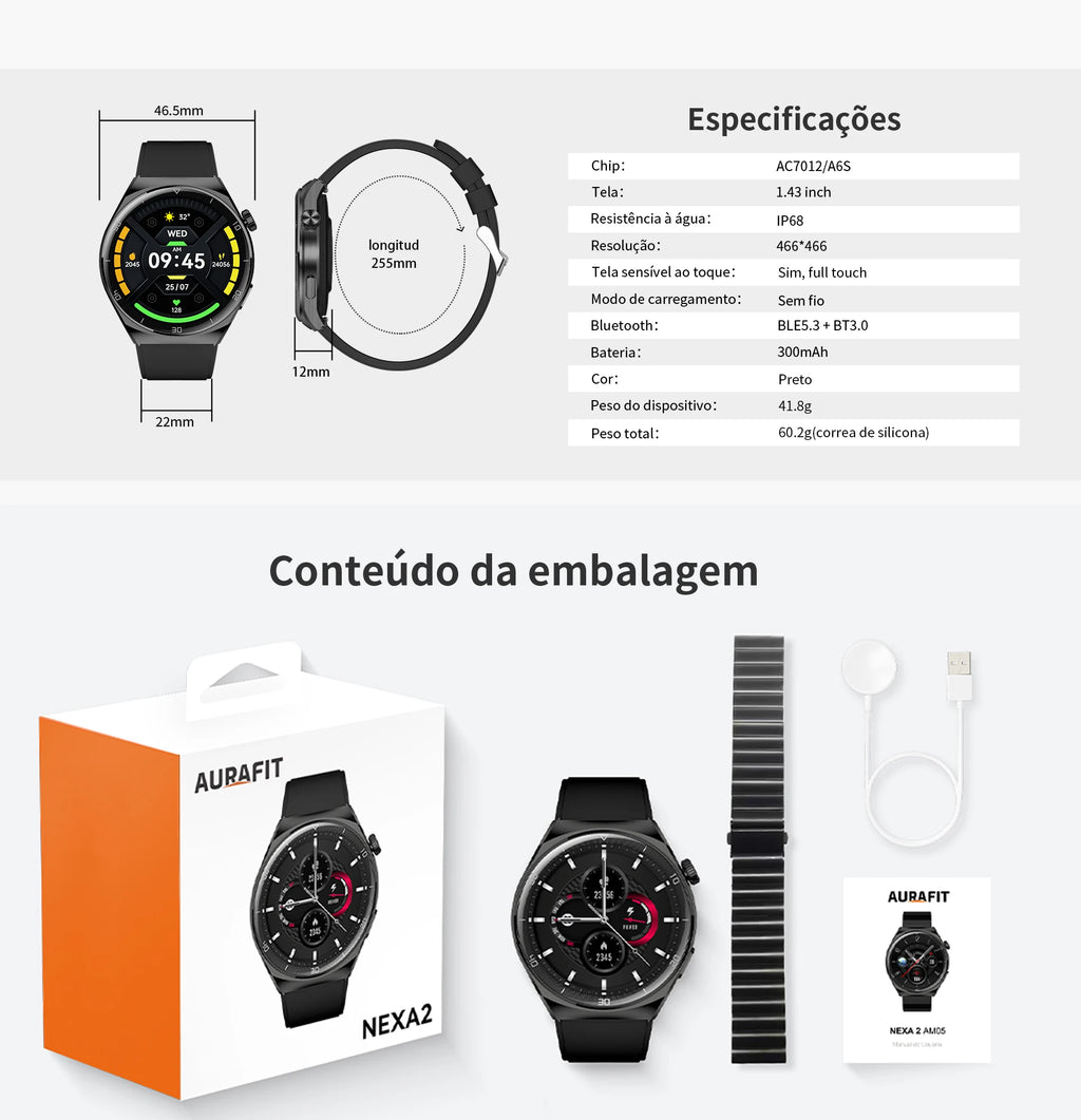 O NEXA 2 é um smartwatch de alto desempenho projetado para atletas e entusiastas de atividades ao ar livre. Sua tela HD AMOLED de 1,43 polegadas oferece cores vibrantes e contraste excepcional, garantindo legibilidade perfeita sob luz solar intensa ou em ambientes com pouca iluminação. A caixa em liga de zinco proporciona resistência estrutural superior, enquanto o vidro Hardlex protege a tela contra arranhões do uso diário. Com certificação IP68, o relógio suporta imersão completa em água, tornando-o adequado para natação, mergulho e esportes aquáticos. A bateria de 300mAh oferece autonomia impressionante de até 15 dias, minimizando interrupções nas suas atividades. O sistema de monitoramento avançado rastreia passos, distância percorrida, calorias queimadas e múltiplas modalidades de exercício através do aplicativo AURAFIT intuitivo. A pulseira em silicone de qualidade proporciona conforto durante uso prolongado, enquanto a tecnologia Bluetooth 5.3 garante conexão estável e sincronização rápida com smartphones e outros dispositivos compatíveis. Certificado CE e RoHS, o NEXA 2 combina engenharia confiável com funcionalidades práticas para potencializar seu desempenho esportivo e monitoramento de saúde diário.