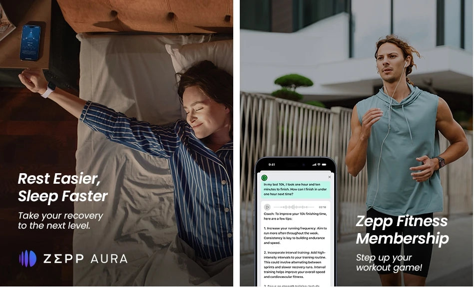 PERSONALIZED AI FITNESS COACH: This fitness tracker watch delivers tailored workout plans using AI via Zepp Coach to optimize training and recovery. Personalize your schedule, target your training, manage your recovery and understand your progress