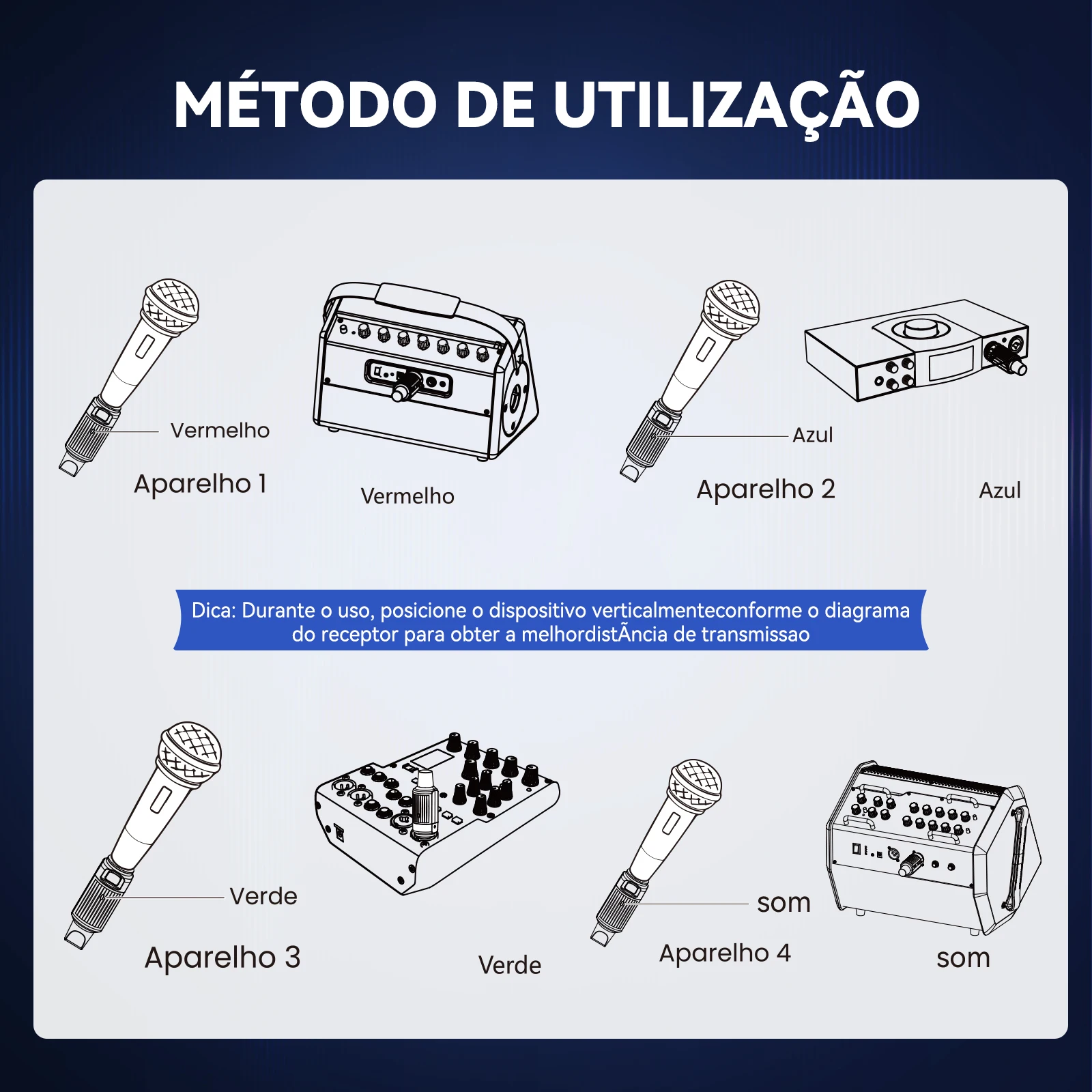 Compatibilidade versátil: O transmissor e o receptor de microfone XLR sem fio são compatíveis com microfones dinâmicos, mixers de áudio, sistemas de PA e câmeras DSLR. Suporta 7 conjuntos de dispositivos a serem usados simultaneamente sem interferir uns com os outros. (Observação: não se destina a dispositivos que exijam alimentação fantasma. Microfones condensadores autoalimentados com bateria/USB operam normalmente).