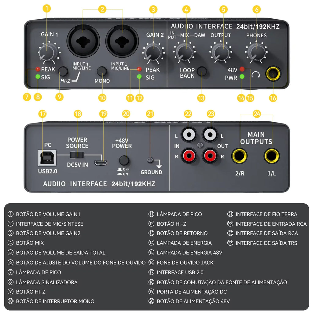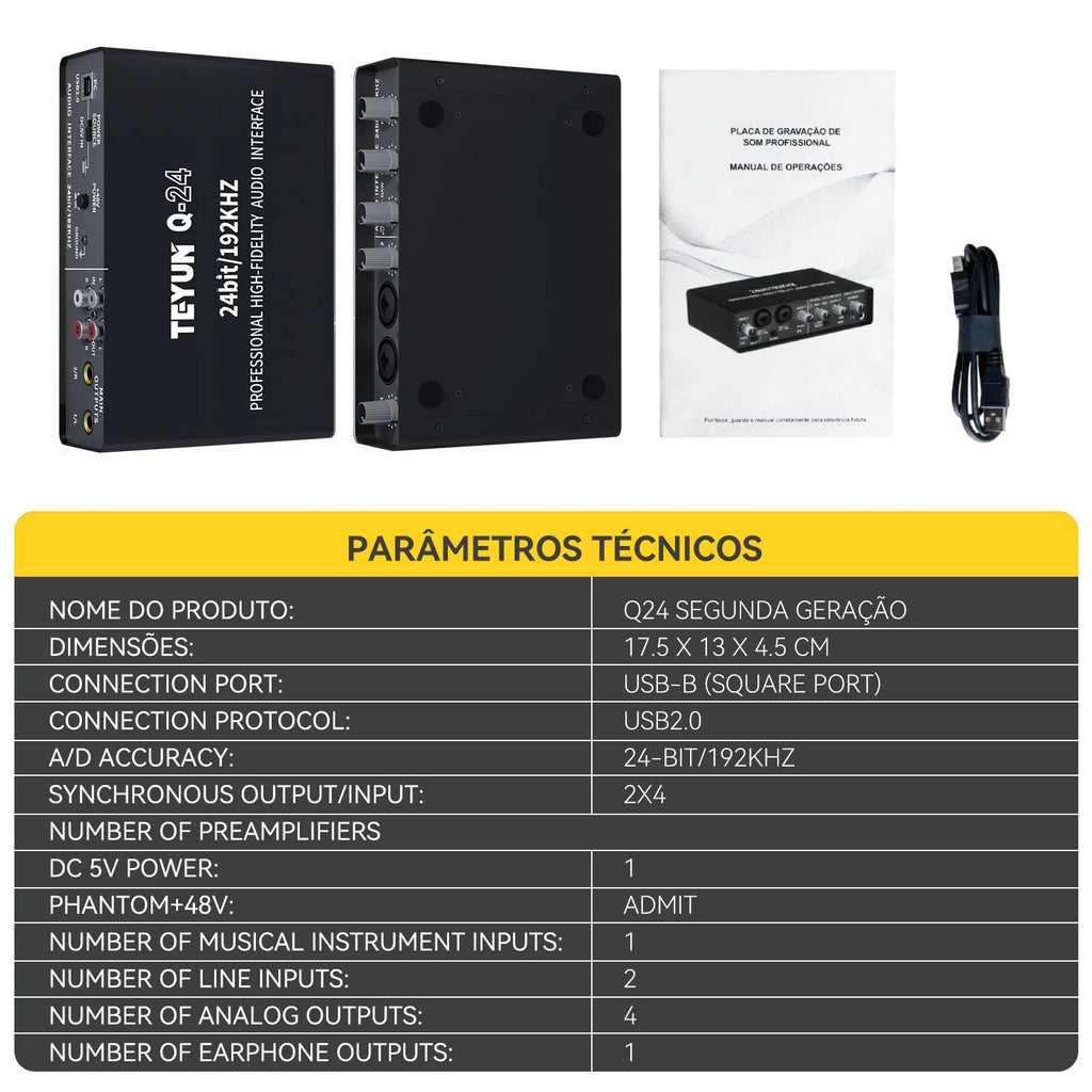 A Interface de Áudio Profissional Teyun Q-24 é uma solução versátil e robusta para produção musical, gravação ao vivo e criação de conteúdo audiovisual. Com conectividade USB universal, integra-se perfeitamente ao seu computador, oferecendo qualidade profissional em um formato compacto e portátil. Equipada com monitoramento de áudio em tempo real, permite controle preciso e latência mínima durante sessões de gravação de guitarra elétrica, vocais, instrumentos acústicos e outras fontes de áudio. O modelo Q-24 combina funcionalidades avançadas de mixer e amplificador, proporcionando flexibilidade total para diferentes cenários de uso. Sua arquitetura profissional garante fidelidade sonora excepcional, ideal para estúdios caseiros, salas de ensaio e apresentações ao vivo. Certificada internacionalmente (CE, FCC, RoHS), a interface atende aos mais altos padrões de qualidade e segurança. Perfeita para músicos, produtores, engenheiros de som e criadores de conteúdo que exigem performance confiável, versatilidade e integração seamless com suas estações de trabalho digital.
