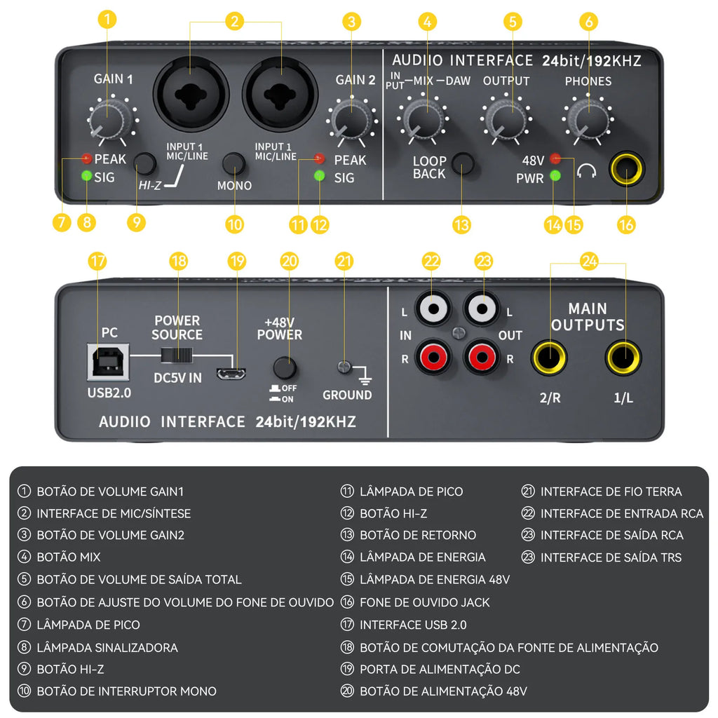 ◆Entrada de sinal de 2 canais e entrada de sinal estéreo de 1 canal◆1 saída de canal principal◆1 canal independente para saída de gravação e monitor◆Baixo ruído, microfone de alta precisão por amplificador, com qualidade de som perfeita◆Entrada de microfone XLR balanceada e entrada TRS de linha balanceada◆Fonte de alimentação fantasma de 48V para microfone condensador e porta de entrada◆Fone de ouvido de alta fidelidade para monitor◆Interface PC (USB)◆O adaptador de energia de comutação externa (AC100-240V)baixo consumo de energiaA placa de som Q-24 é com tecnologia e compatibilidade mais poderosas, com interface USB2. 0 de alta velocidade, processador digital de alta velocidade integrado, com distorção extremamente baixa e processamento de sinal digital de alta precisão.Q-24 com conversores AD e DA, taxas de amostragem de até 24 bits / 192KHZ, que podem fornecer excelente qualidade de gravação, resposta dinâmica e baixa frequência rica. A conversão de alta qualidade é a chave para obter uma conversão de sinal de áudio de alta qualidade. A fonte de alimentação pode ser ligada a PC/DC 5V IN, permitindo a ligação a computadores MAC e PC e a dispositivos IOS