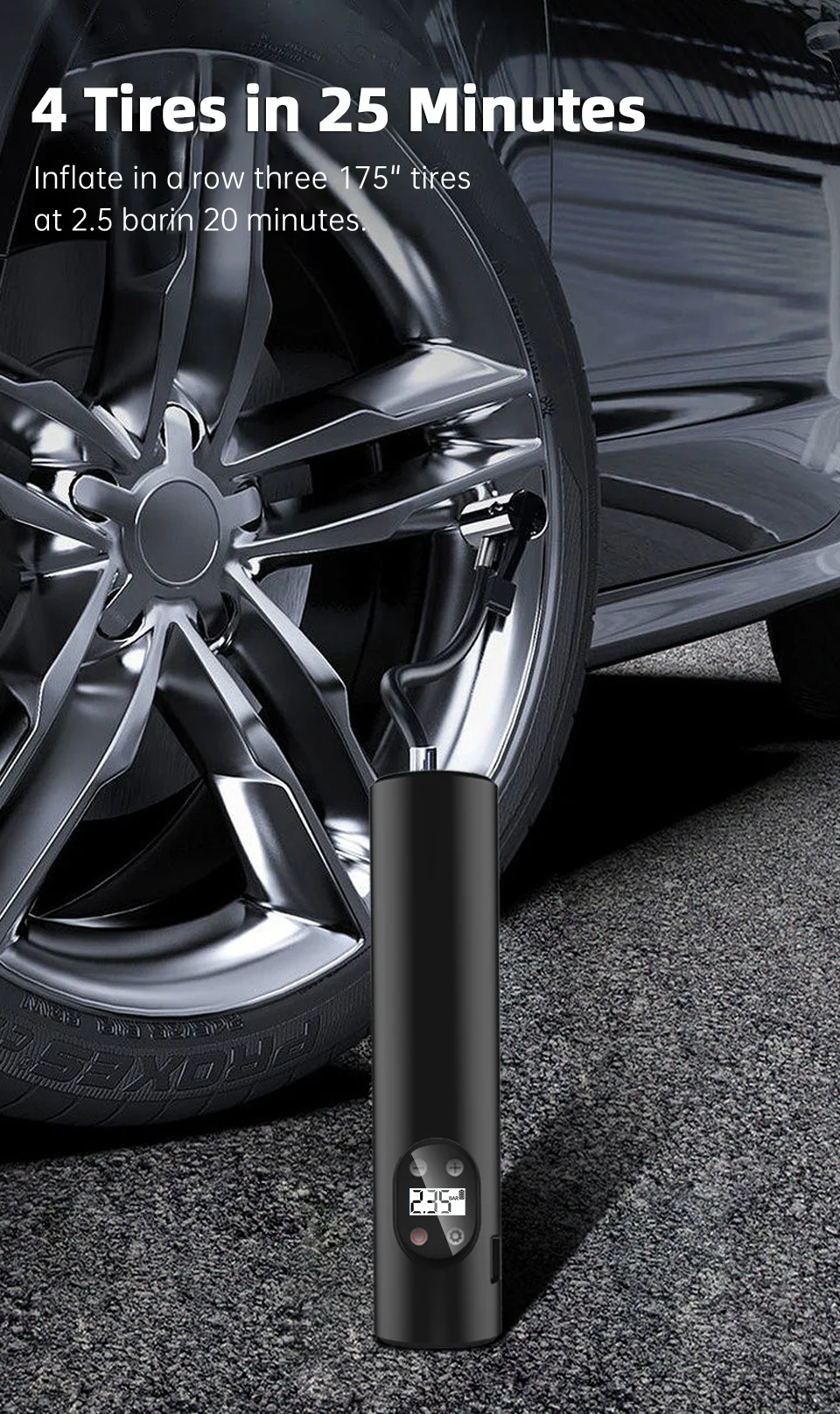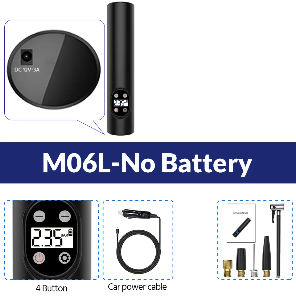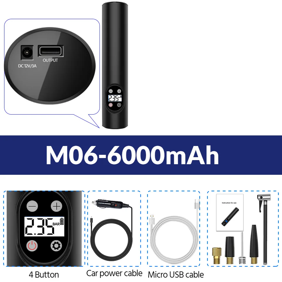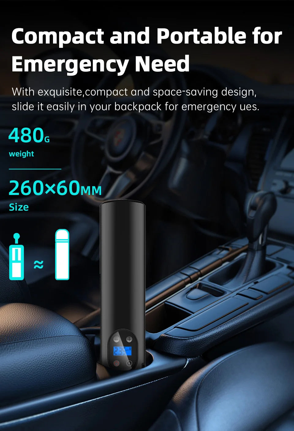Compressor portátil E-ACE com bateria recarregável de 6000mAh, oferecendo potência de 12V e 150PSI para inflar pneus de carros, bicicletas, motos e bolas com precisão. Funciona com ou sem fio, garantindo flexibilidade de uso em qualquer situação e emergências na estrada. Construído em ABS resistente e equipado com luzes LED integradas para visibilidade em ambientes com pouca iluminação, é compacto (5cm x 6cm) e pesa apenas 436g, facilitando o transporte e armazenamento no porta-malas ou mochila. Modelo M06L/M06/M06 Pro ideal para quem busca praticidade, confiabilidade e desempenho profissional. A bateria de longa duração permite múltiplas inflagens antes de necessitar recarga. Carregue exclusivamente com adaptador 5V/2A-3A para garantir melhor desempenho e longevidade da bateria. Solução versátil e eficiente para todas as suas necessidades de inflação.