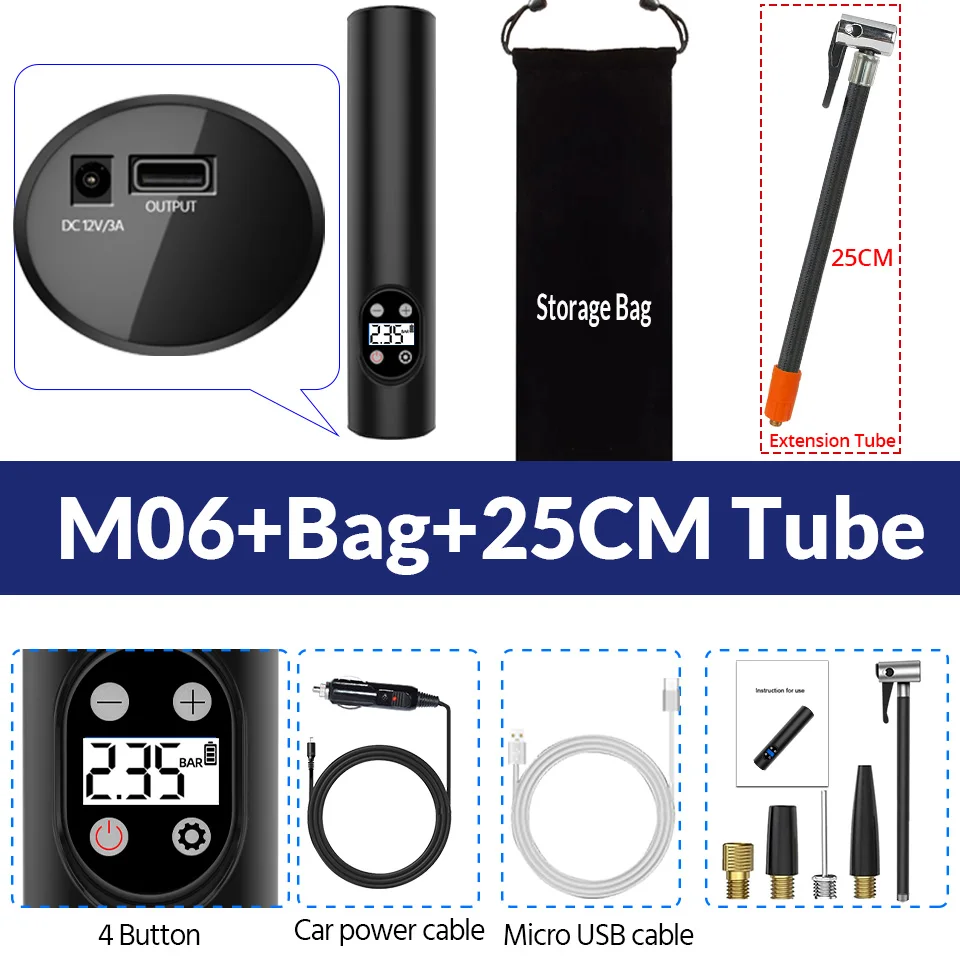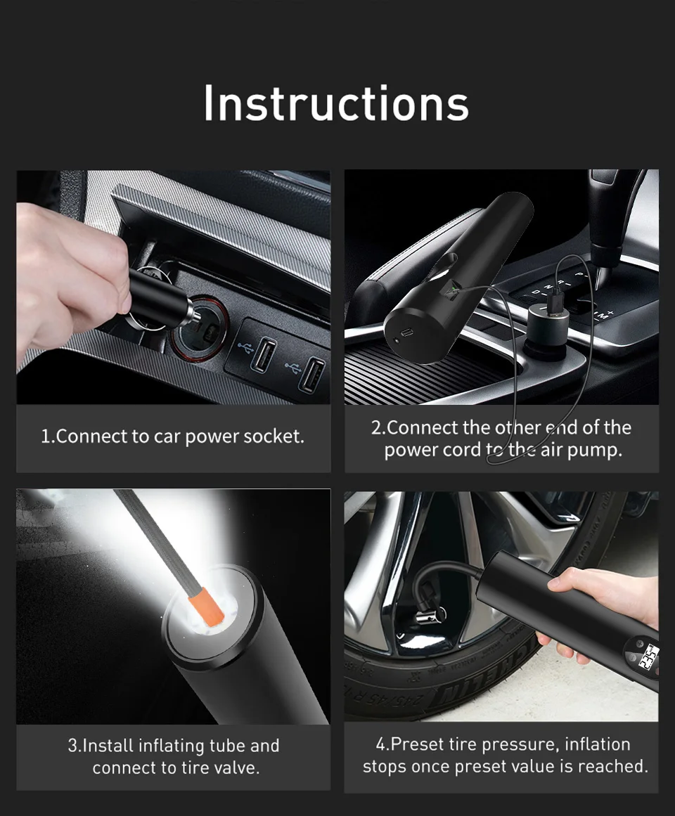 ☞Compatible with a variety of nozzles, suitable for a variety of items to inflate, like pro-bike tires, home use car tires, motorcycle tires, electric bicycle tires, balls, swimming rings, inflatable toys and other inflatables.