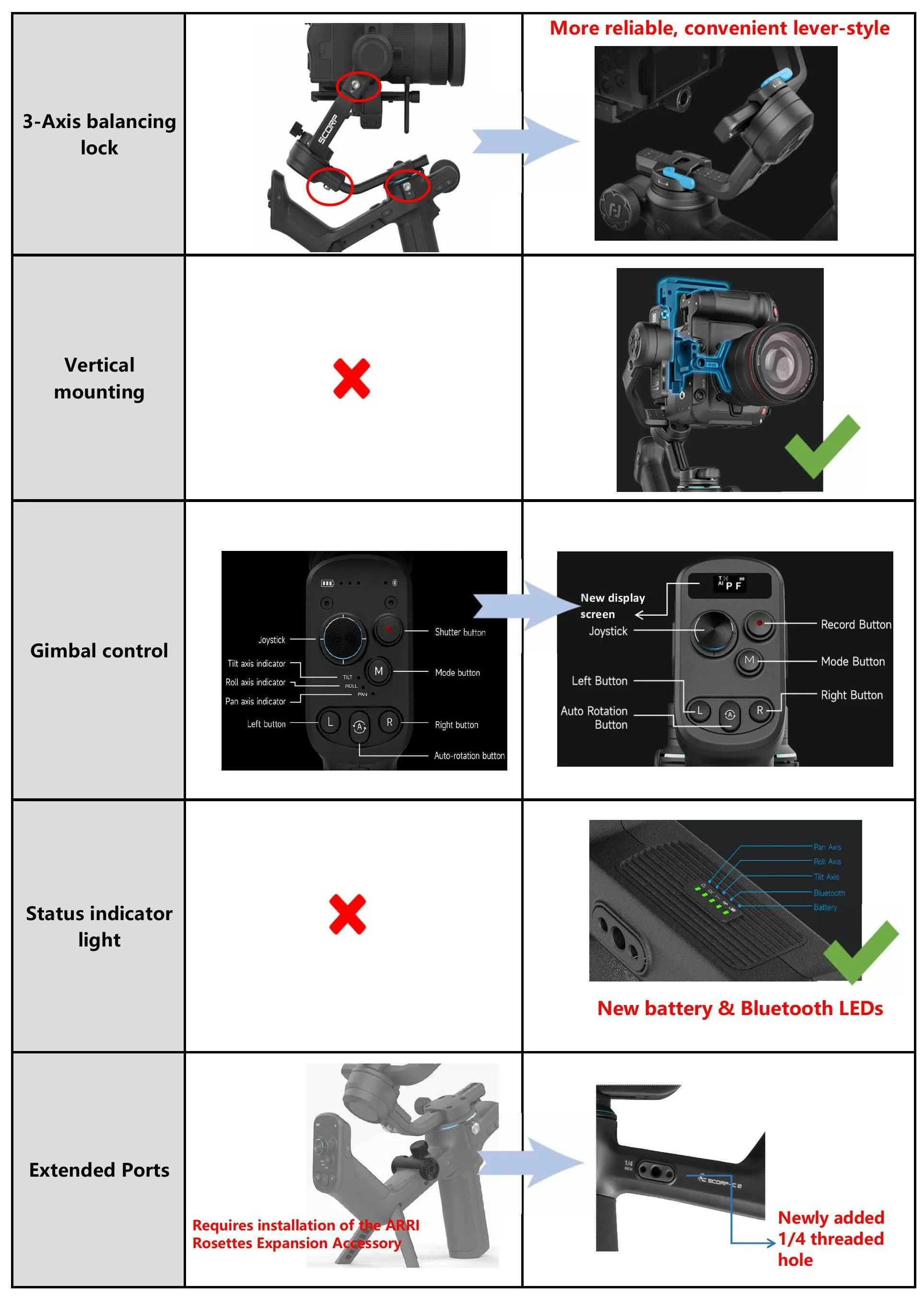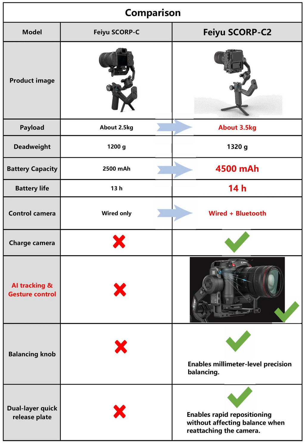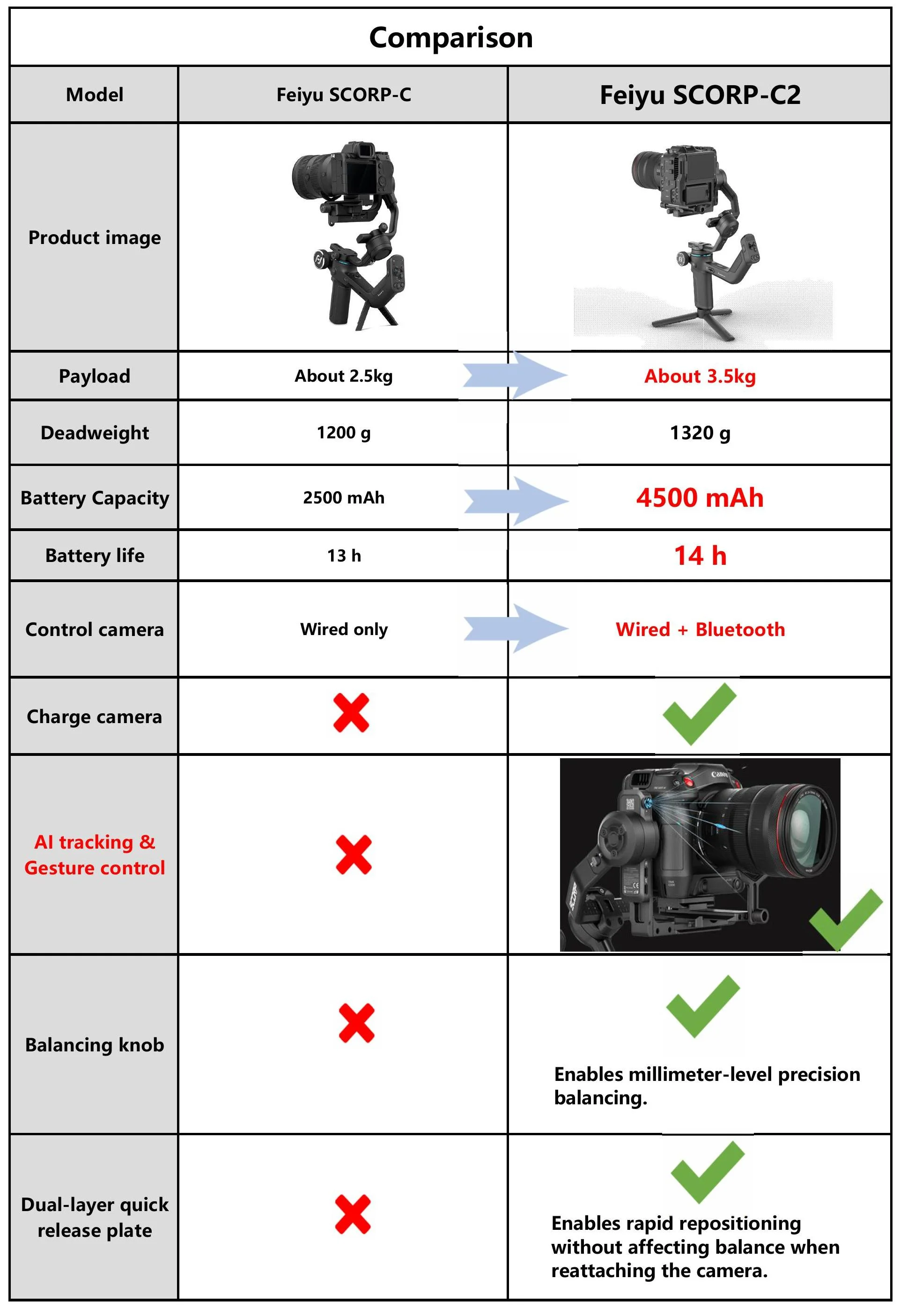 What are the upgrades between Feiyu SCORP and Feiyu SCORP-C?