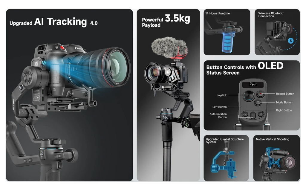 Stabilization Features: to prevent unexpected movements when shooting and realize some professional shooting modes. And this required the camera and lens combination can be kept balance on the camera stabilizer gimbal.