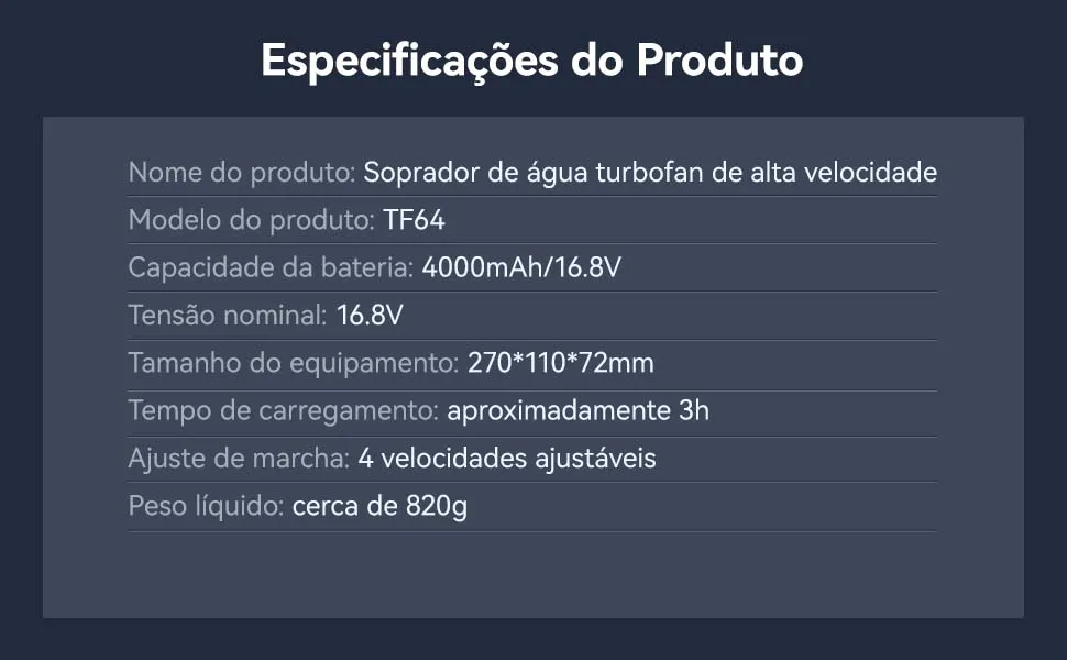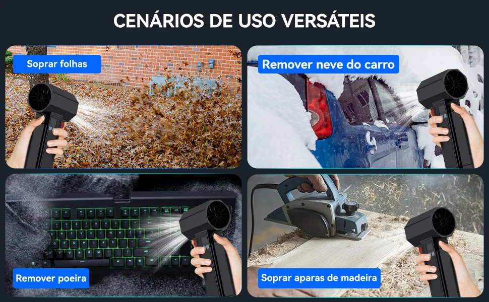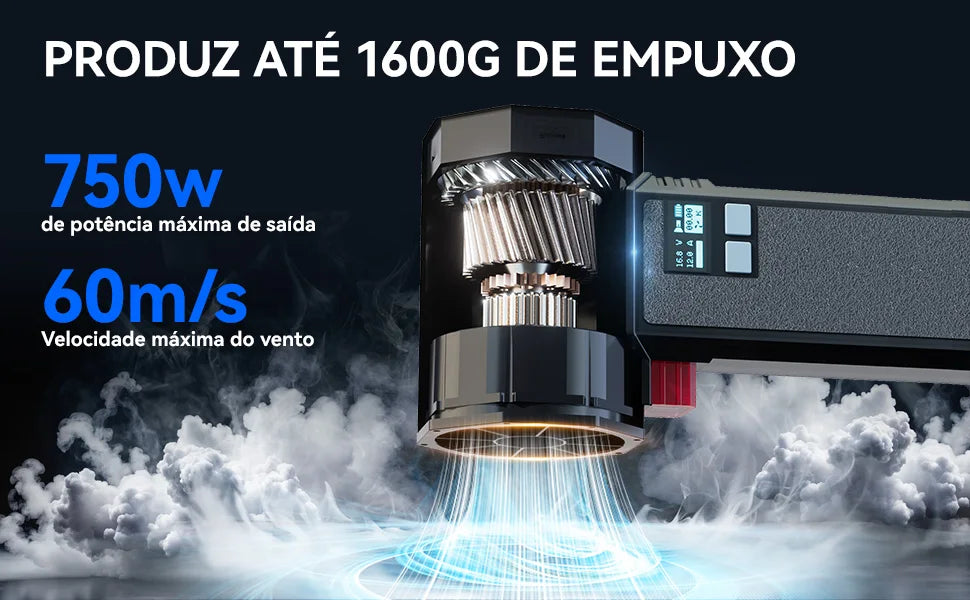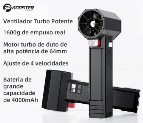 Ventilador turbo portátil Booster modelo TF64, a solução compacta e versátil para suas necessidades de circulação de ar. Desenvolvido com motor sem escovas de última geração, garante desempenho robusto e longevidade excepcional, reduzindo manutenção e aumentando a vida útil do equipamento. Equipado com bateria recarregável de 4000mA, proporciona autonomia suficiente para uso prolongado sem interrupções. O sopro de ar em alta velocidade atende múltiplas aplicações: desde refrigeração rápida de ambientes até limpeza eficaz de superfícies e equipamentos. A iluminação LED integrada oferece funcionalidade adicional para ambientes com pouca luminosidade. Com apenas 1600g, o design leve e ergonômico facilita o transporte e manuseio contínuo. Disponível em três tamanhos (P, M, G) para se adequar a diferentes necessidades e espaços. Certificado CE, atende aos padrões internacionais de segurança e qualidade. Inclui bateria pronta para uso imediato, permitindo começar a trabalhar sem atrasos.