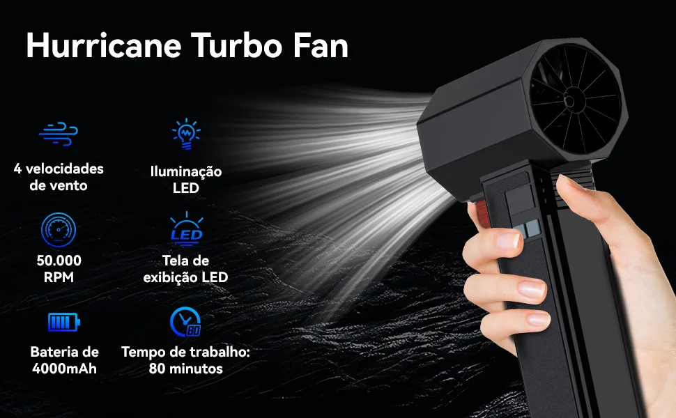 Ventilador Turbo Portátil Booster com Iluminação LED, Soprador de Ar Potente, Sem Escovas, Durável, Alta Velocidade, Potente, 4000mA, 1600g